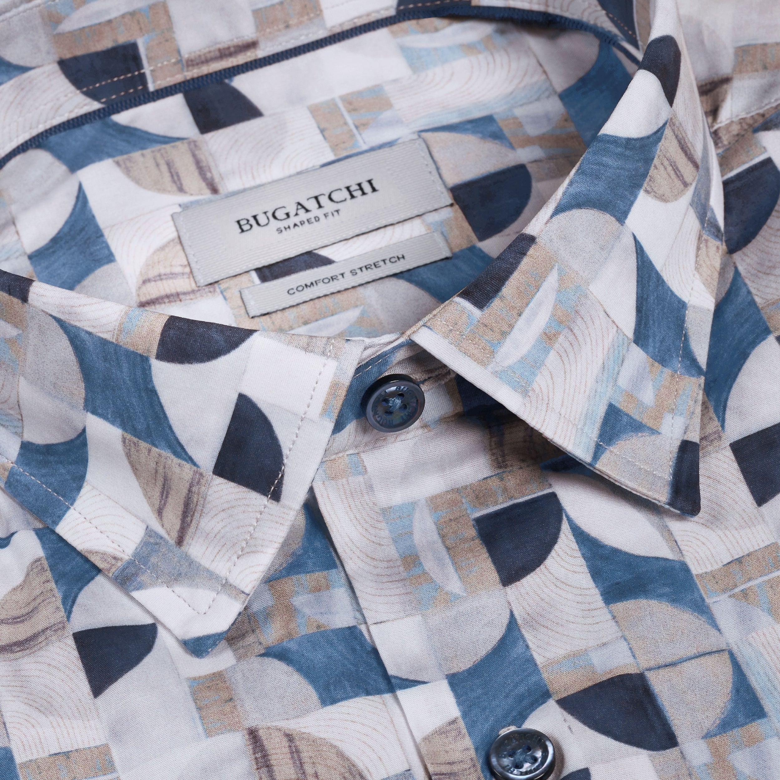 The Julian long-sleeve Comfort Stretch shirt is crafted from premium Italian cotton fabric with added stretch for all-day ease, in an abstract geometric block print. Designed with a point collar, genuine mother-of-pearl buttons, and adjustable notched cuffs that also convert for cufflinks. A versatile shirt that looks polished whether tucked or untucked.