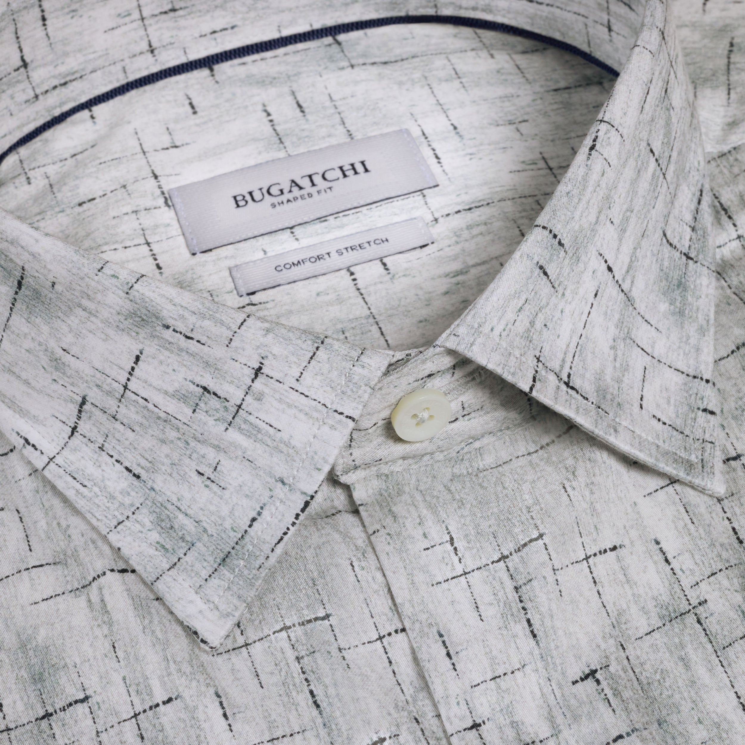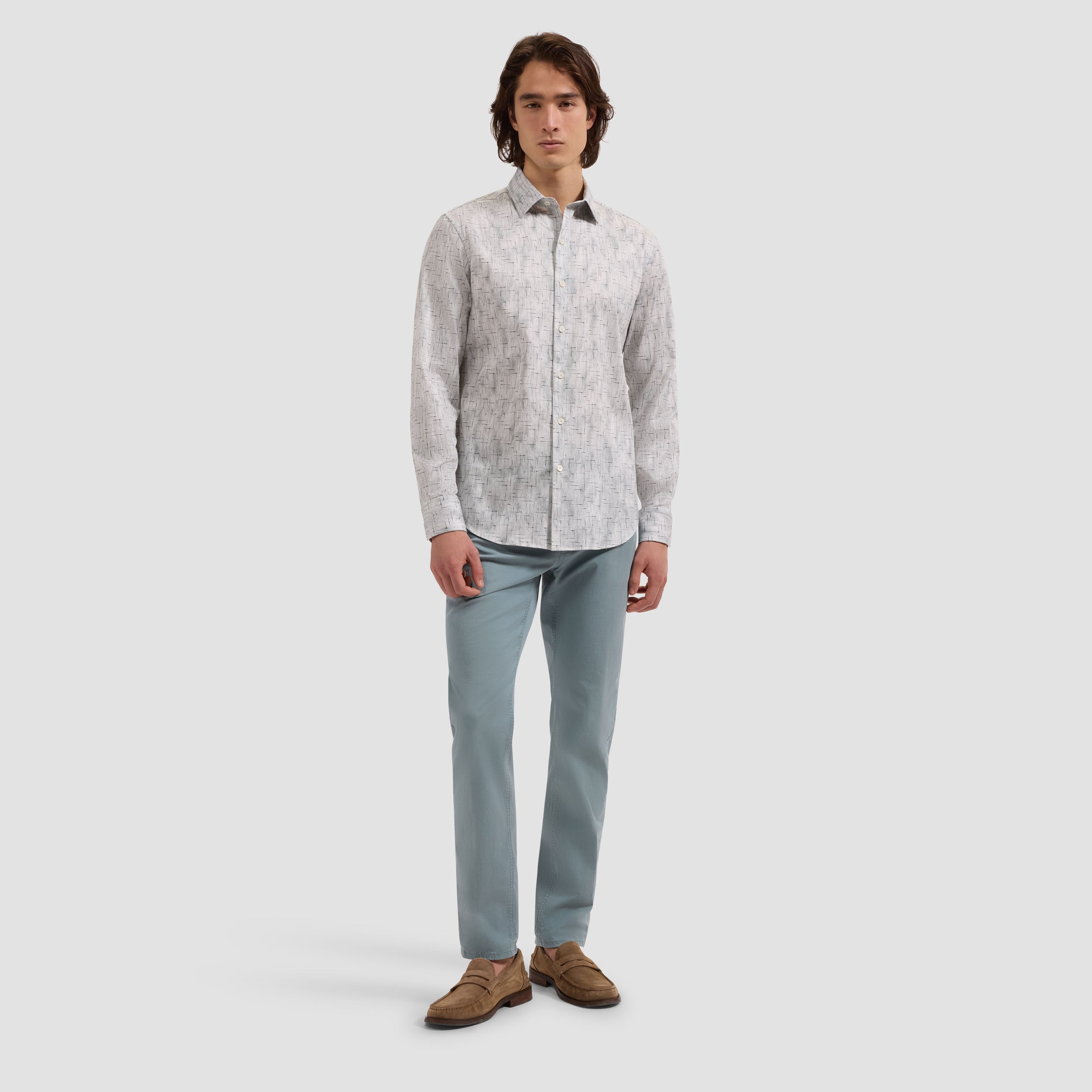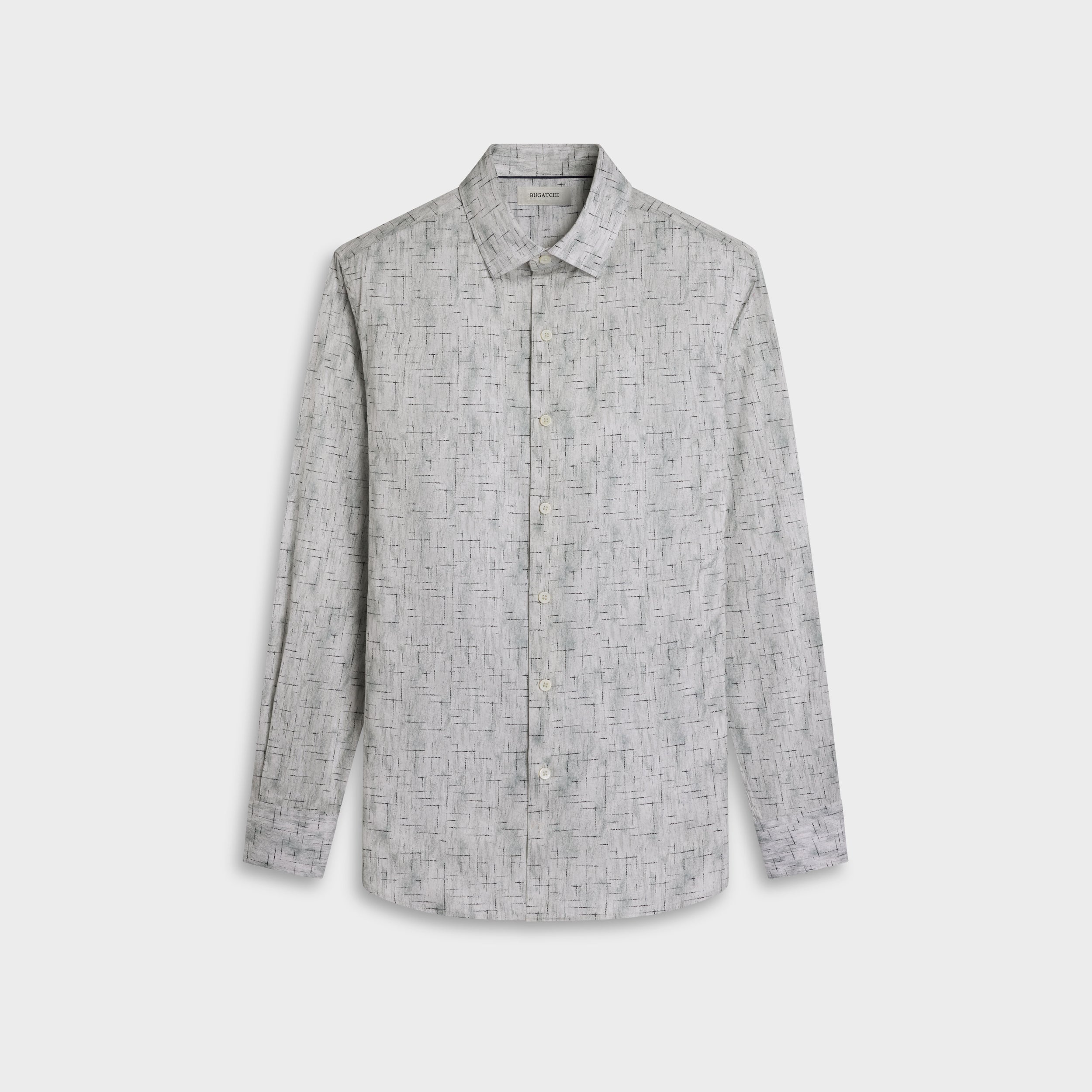 The Julian long-sleeve Comfort Stretch shirt is crafted from premium Italian cotton fabric with added stretch for all-day ease, in an abstract grid print. Designed with a point collar, genuine mother-of-pearl buttons, and adjustable notched cuffs that also convert for cufflinks. A versatile shirt that looks polished whether tucked or untucked.