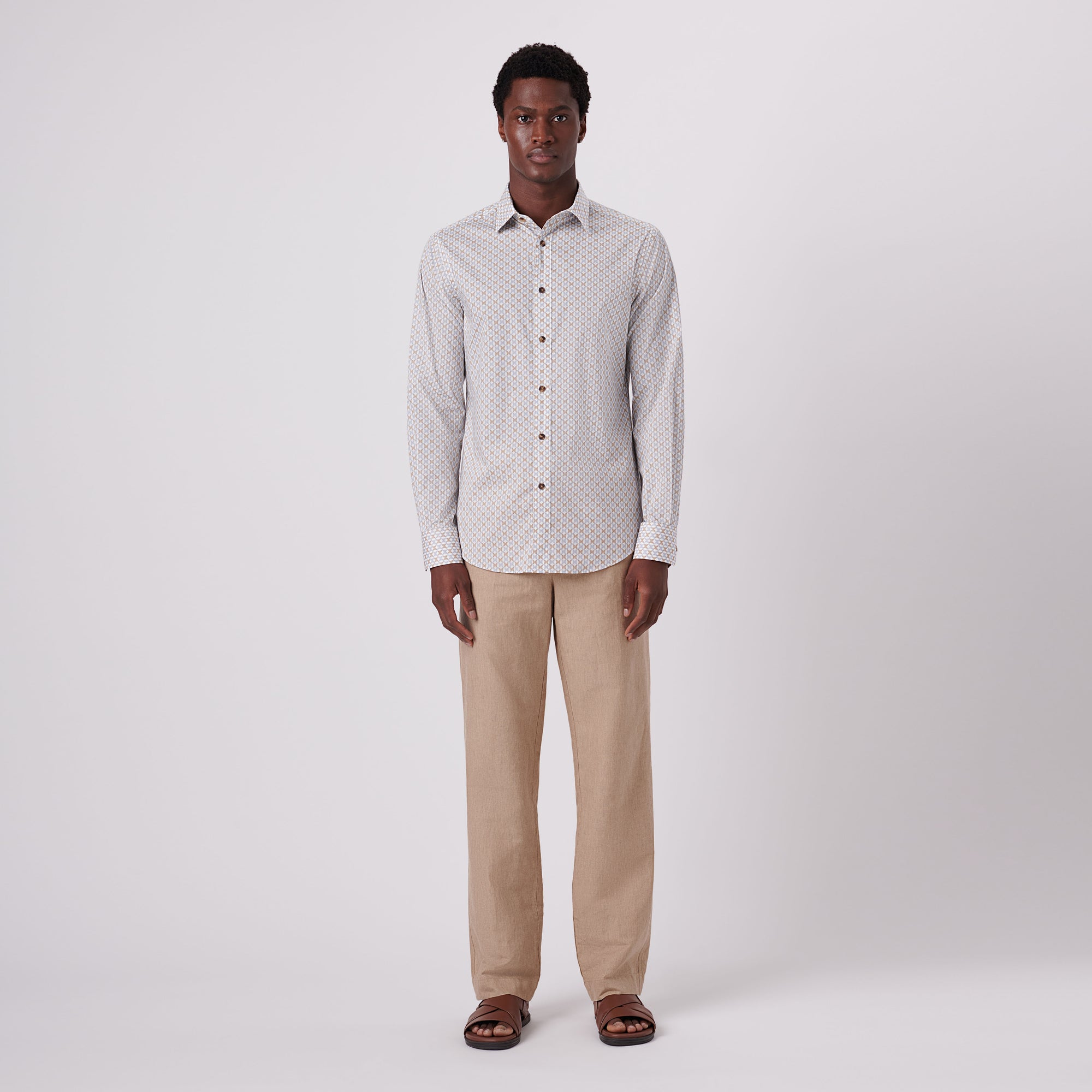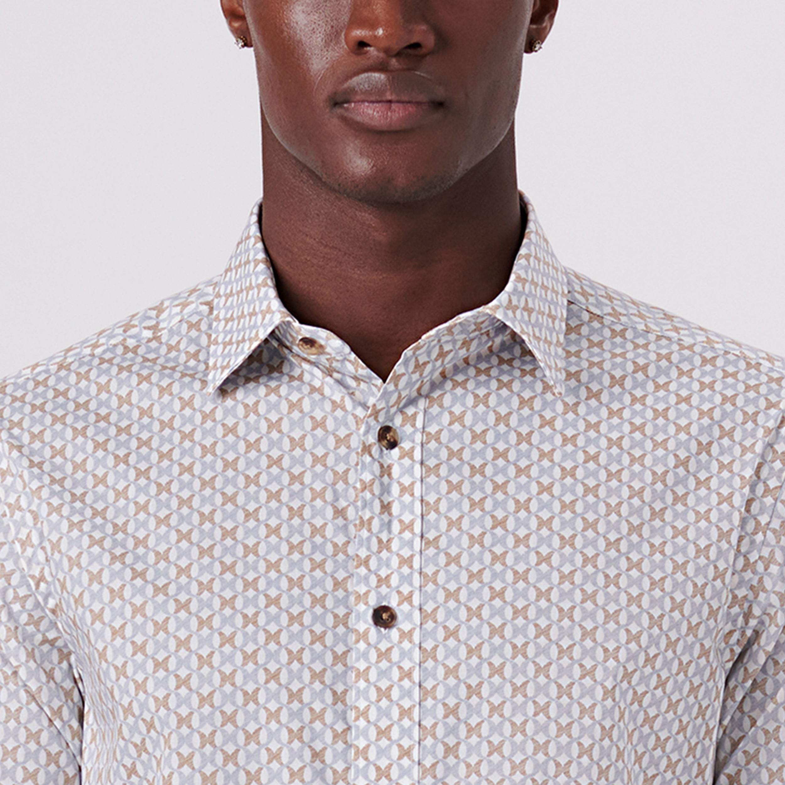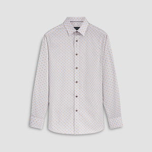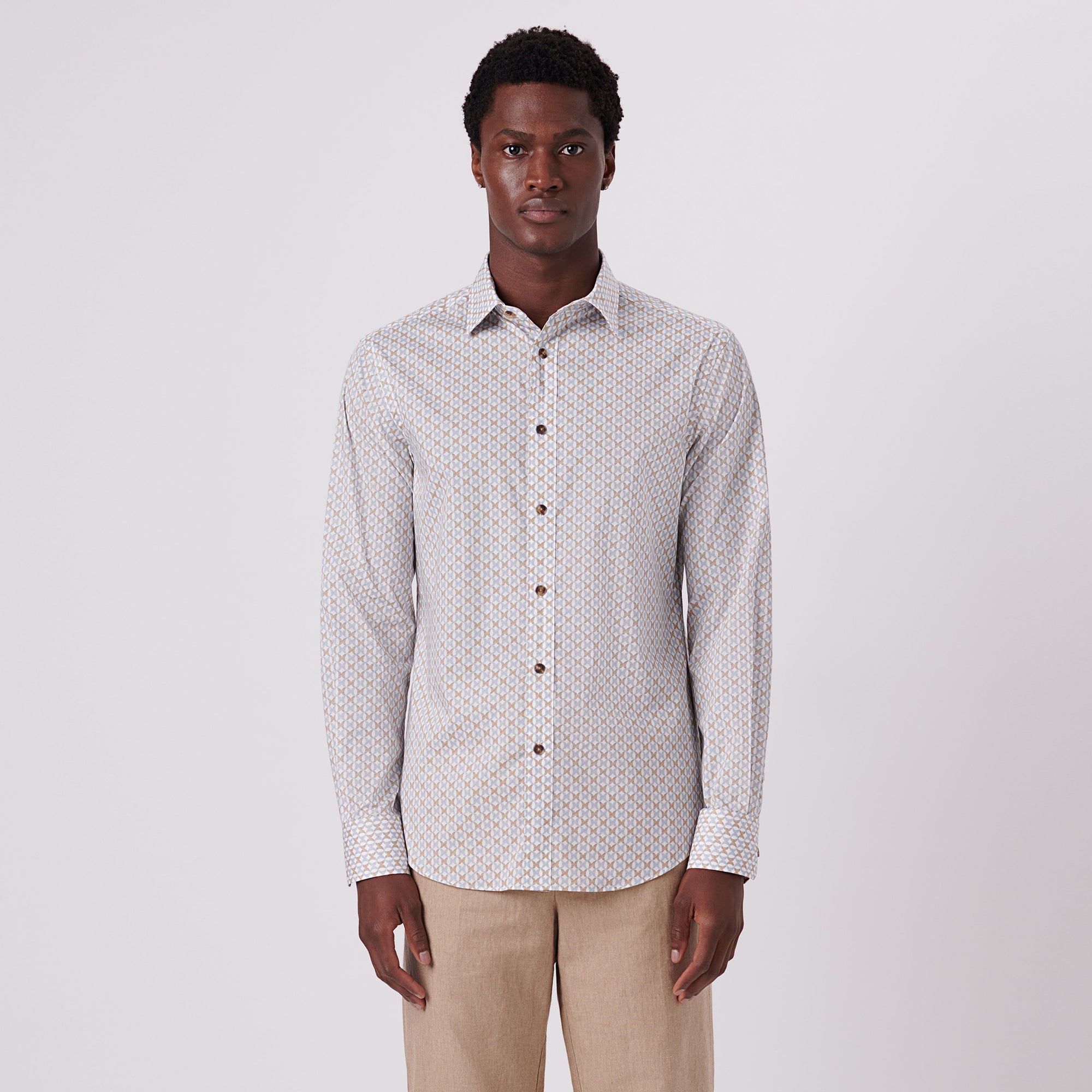 Julian abstract print long-sleeved shirt in comfort stretch cotton with point collar, adjustable notched cuffs, genuine shell buttons and a curved hemline.