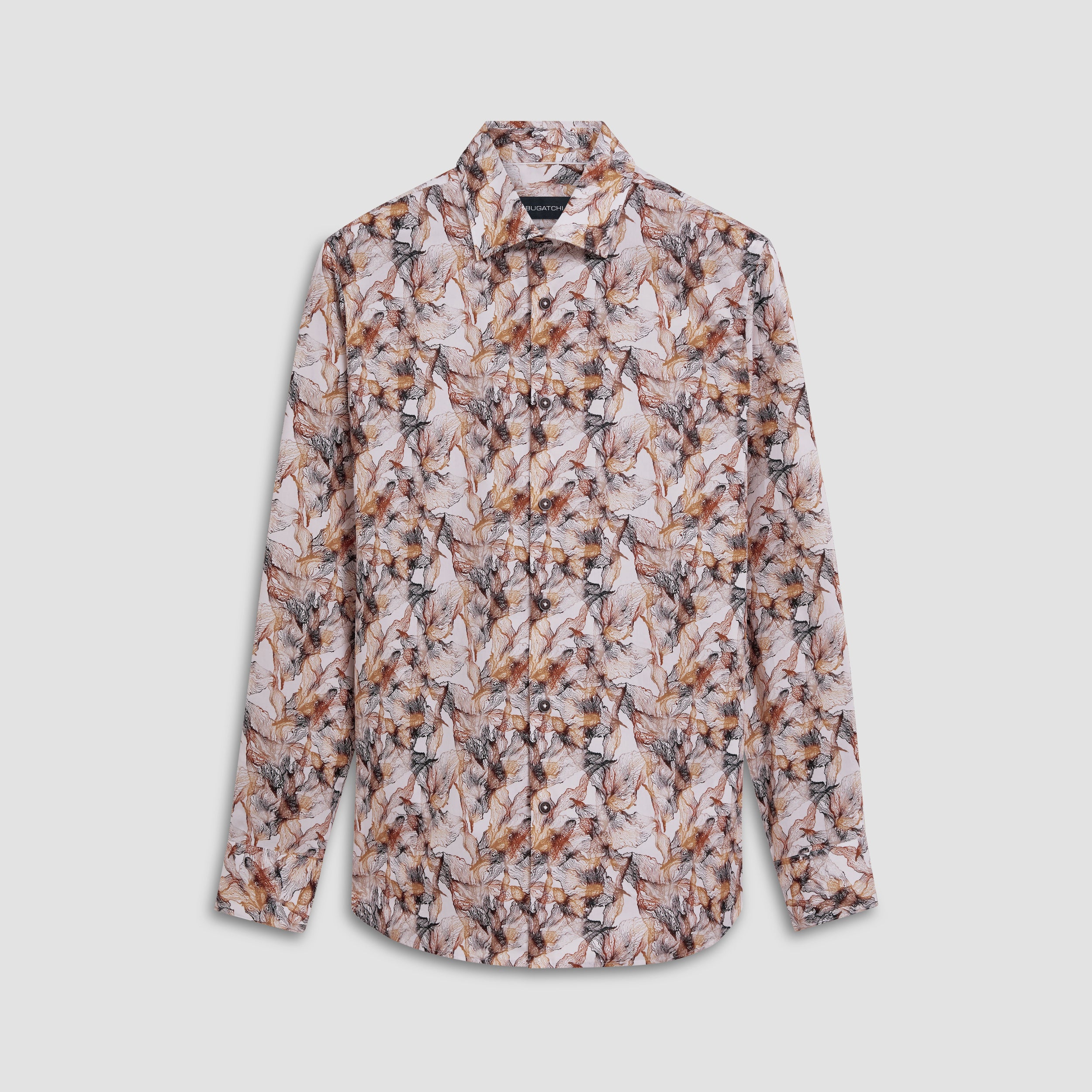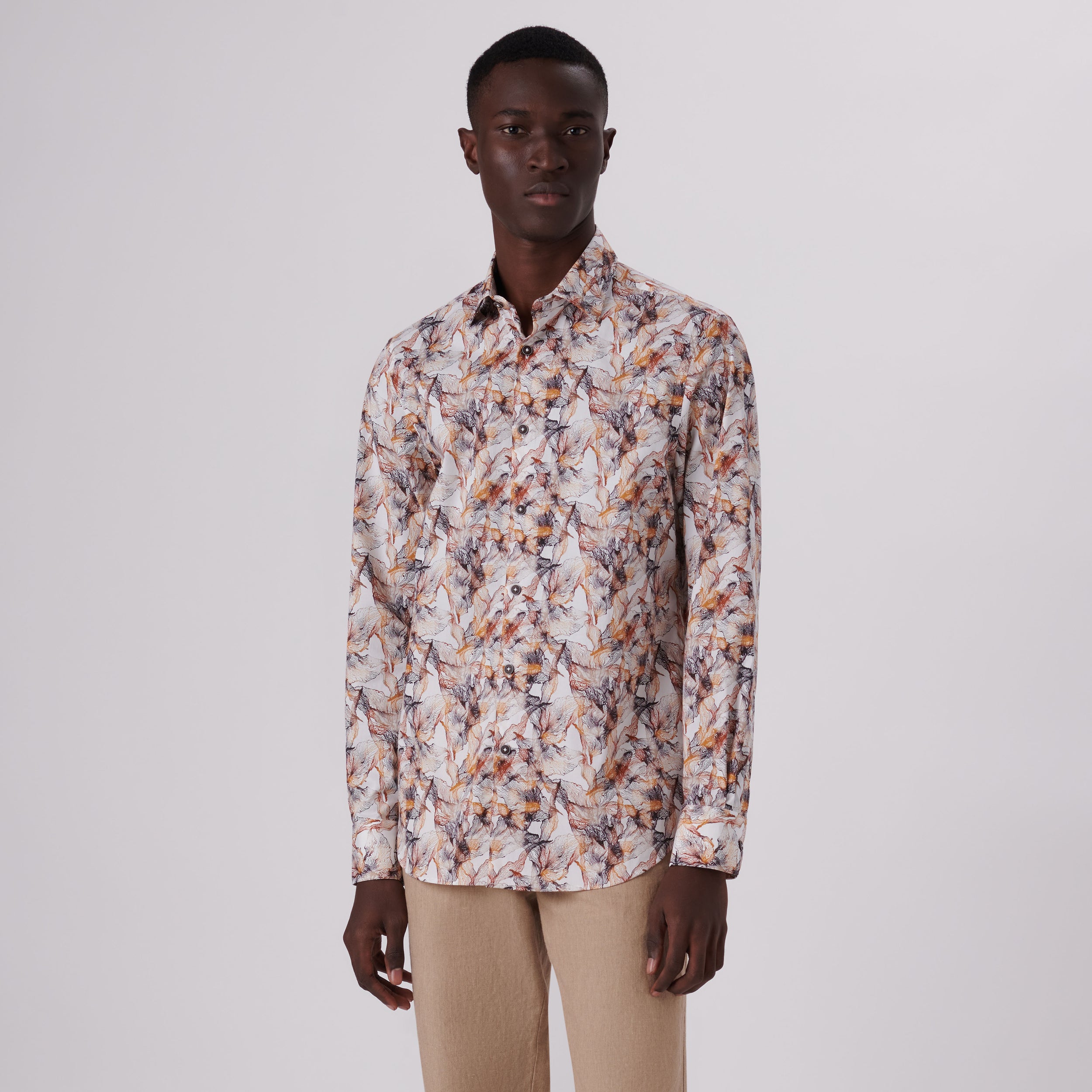 Julian abstract print long-sleeved shirt in comfort stretch cotton with point collar, French placket, adjustable notched cuffs, genuine shell buttons and a curved hemline.