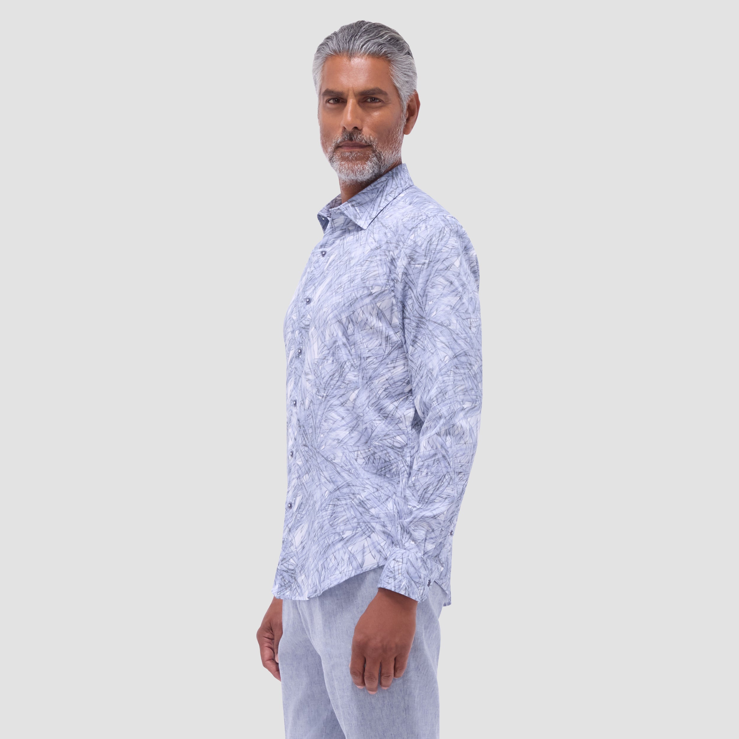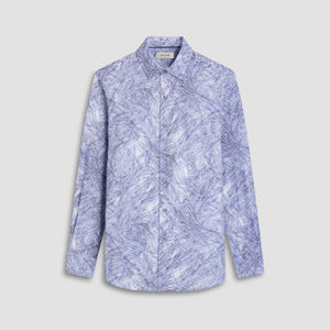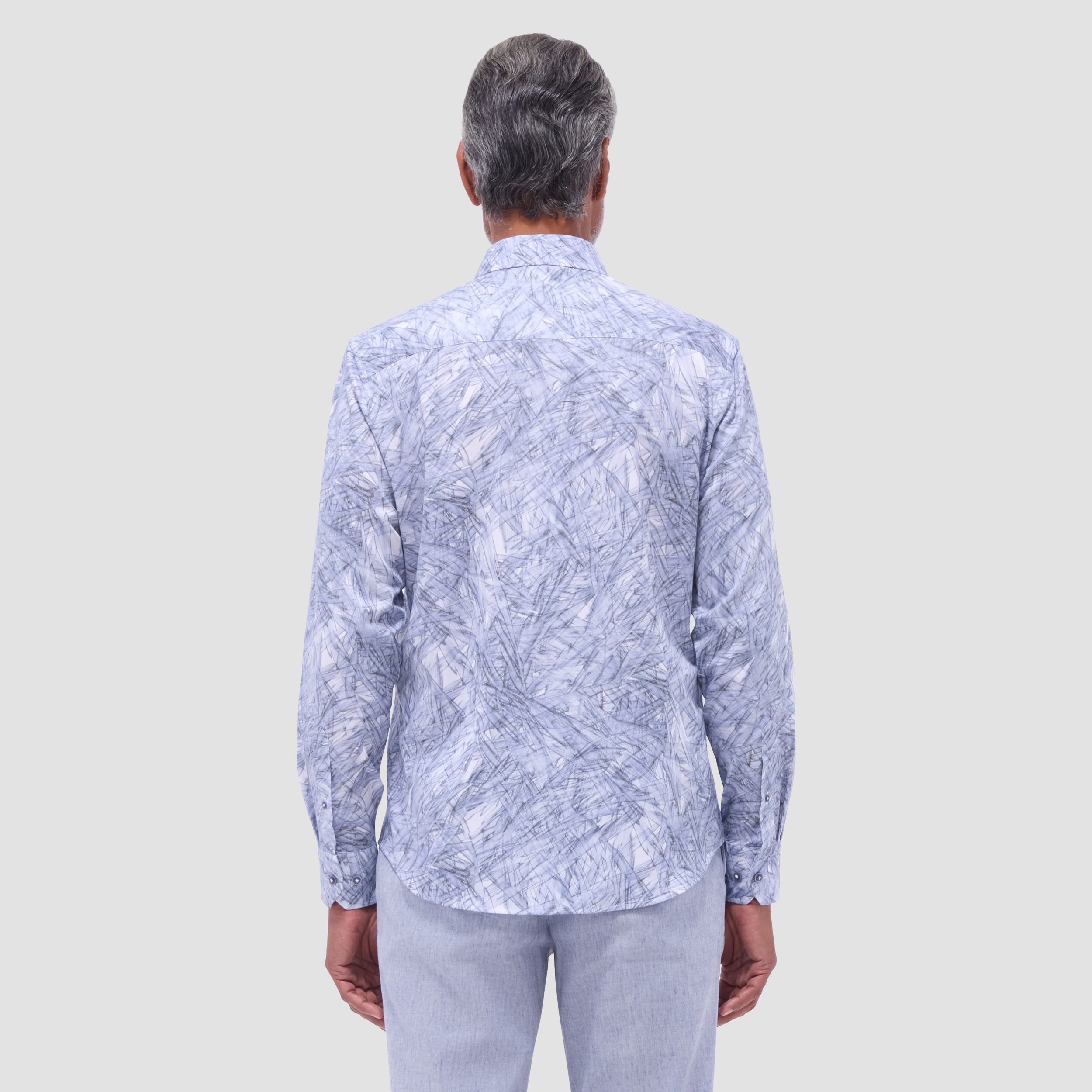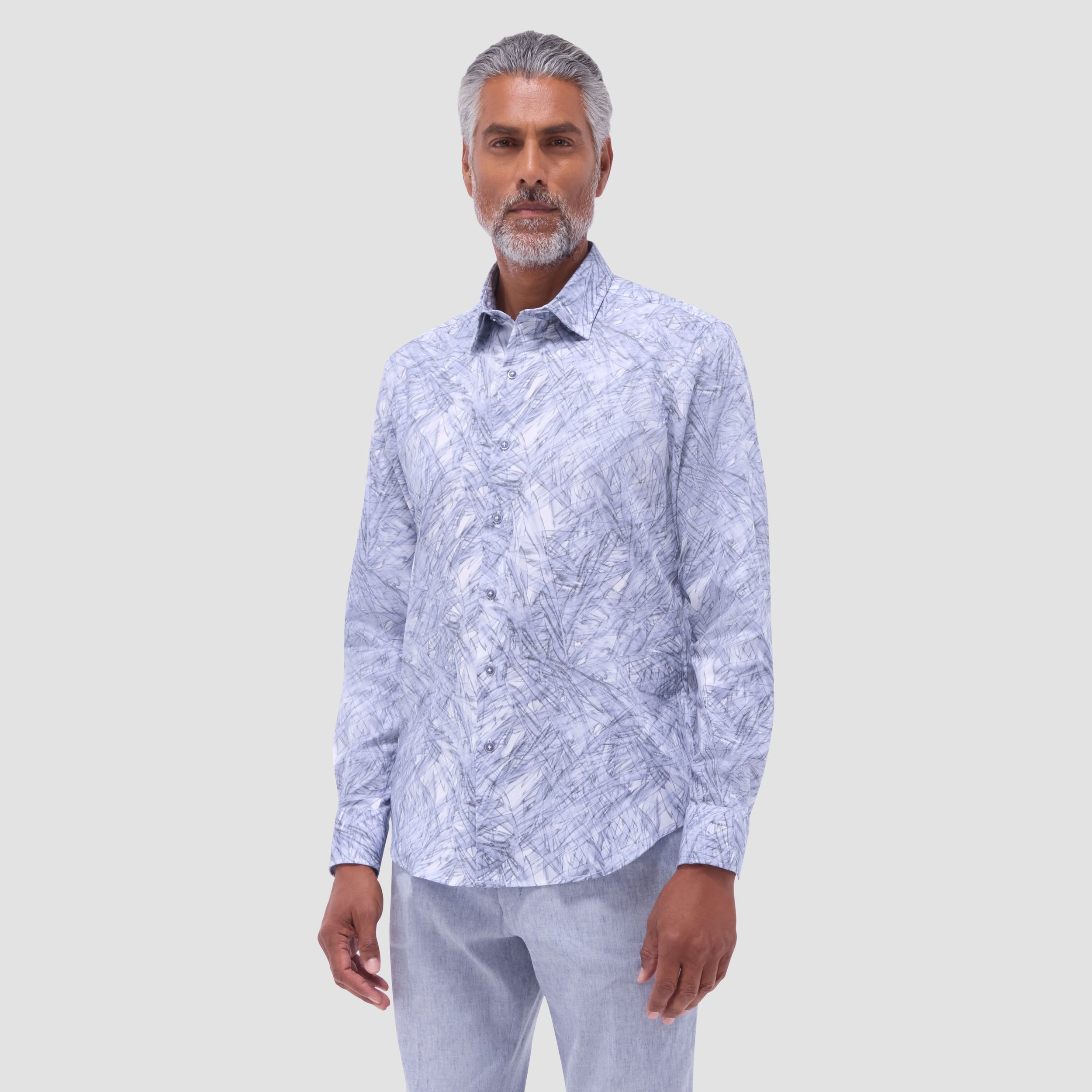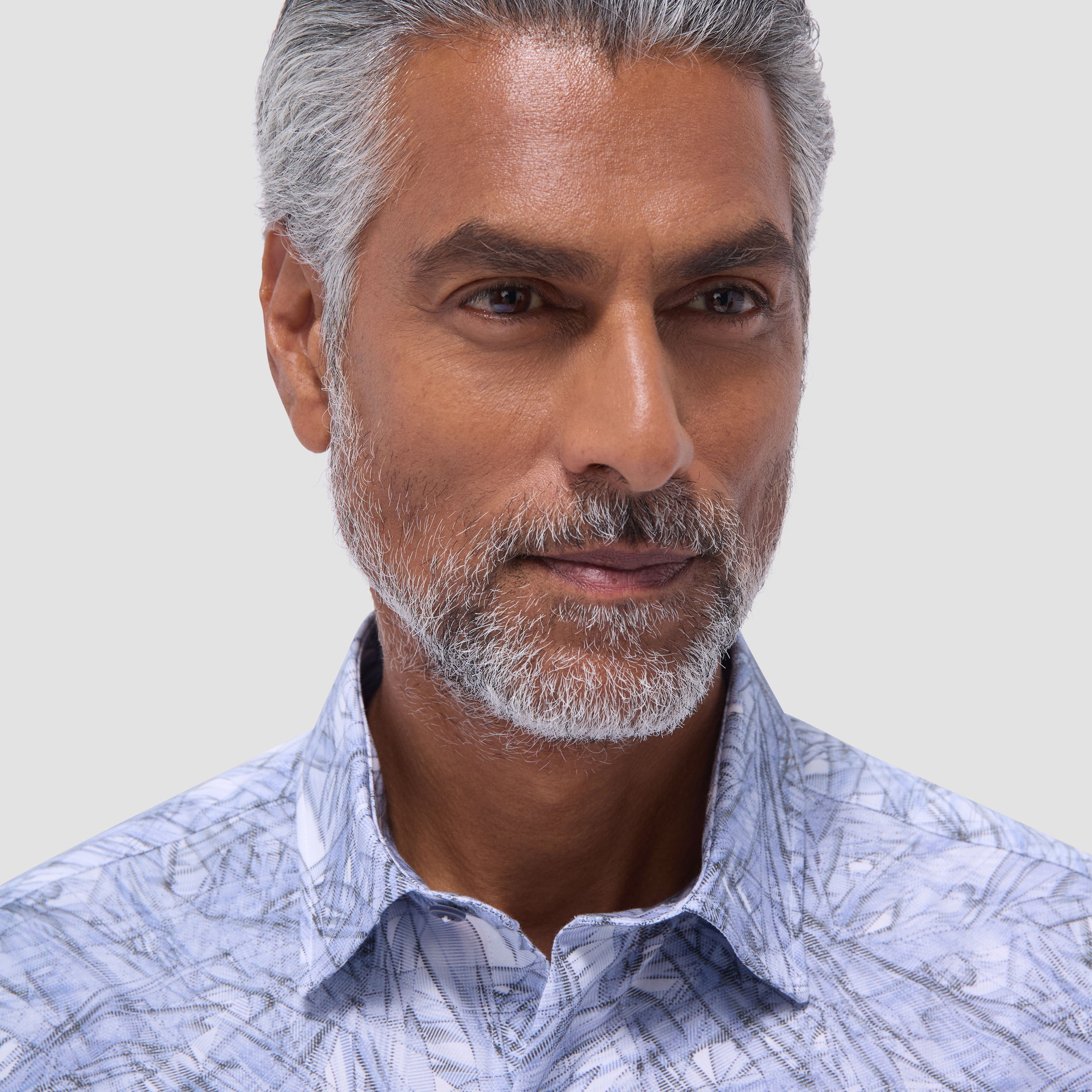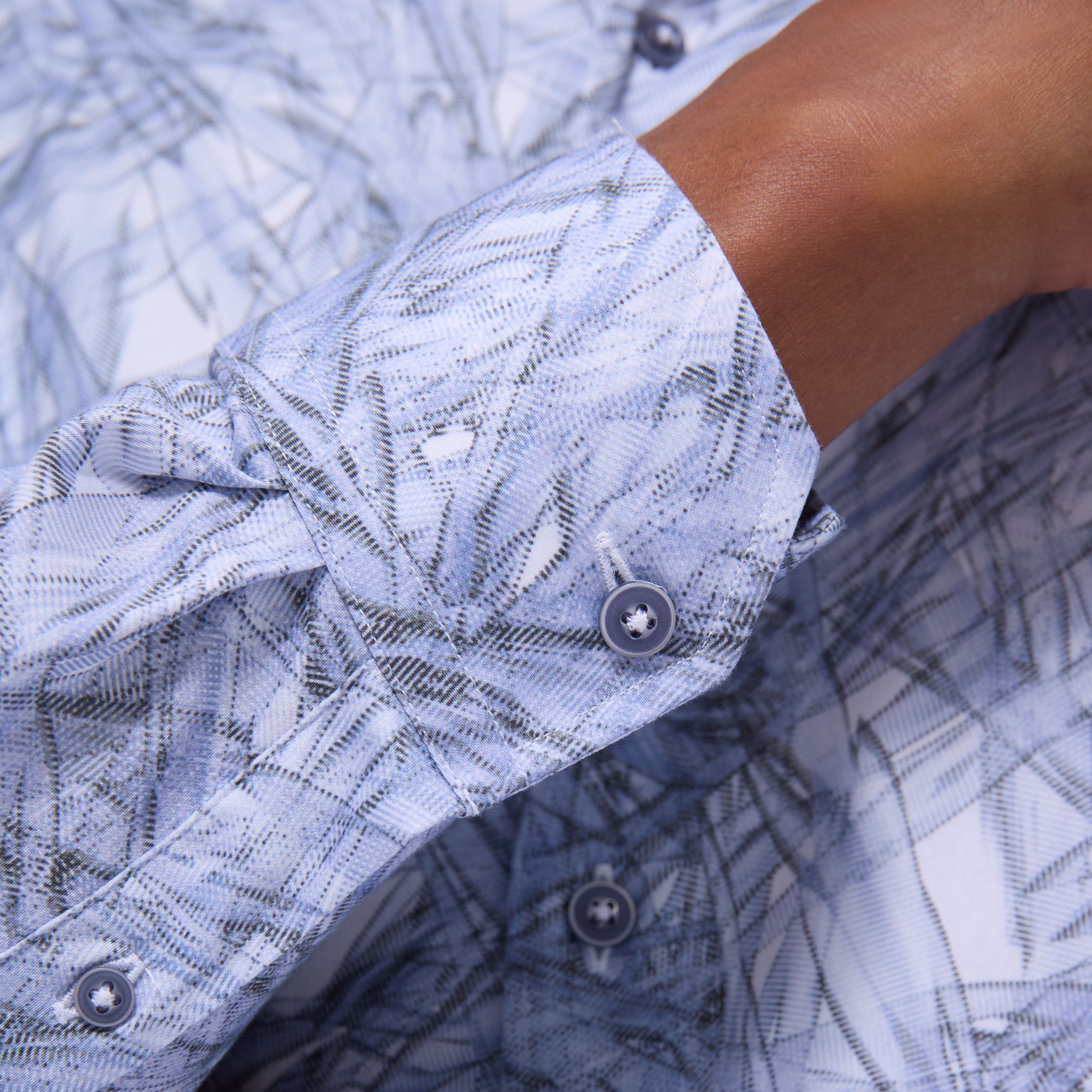 The Julian long-sleeve Comfort Stretch cotton shirt in abstract print is crafted from premium Italian fabric. Designed for versatility, it features a point collar, a curved hem that can be worn tucked or untucked, and notched cuffs adjustable for a custom fit-wear them snug or loose, or convert them for cufflinks. A refined choice for any occasion.