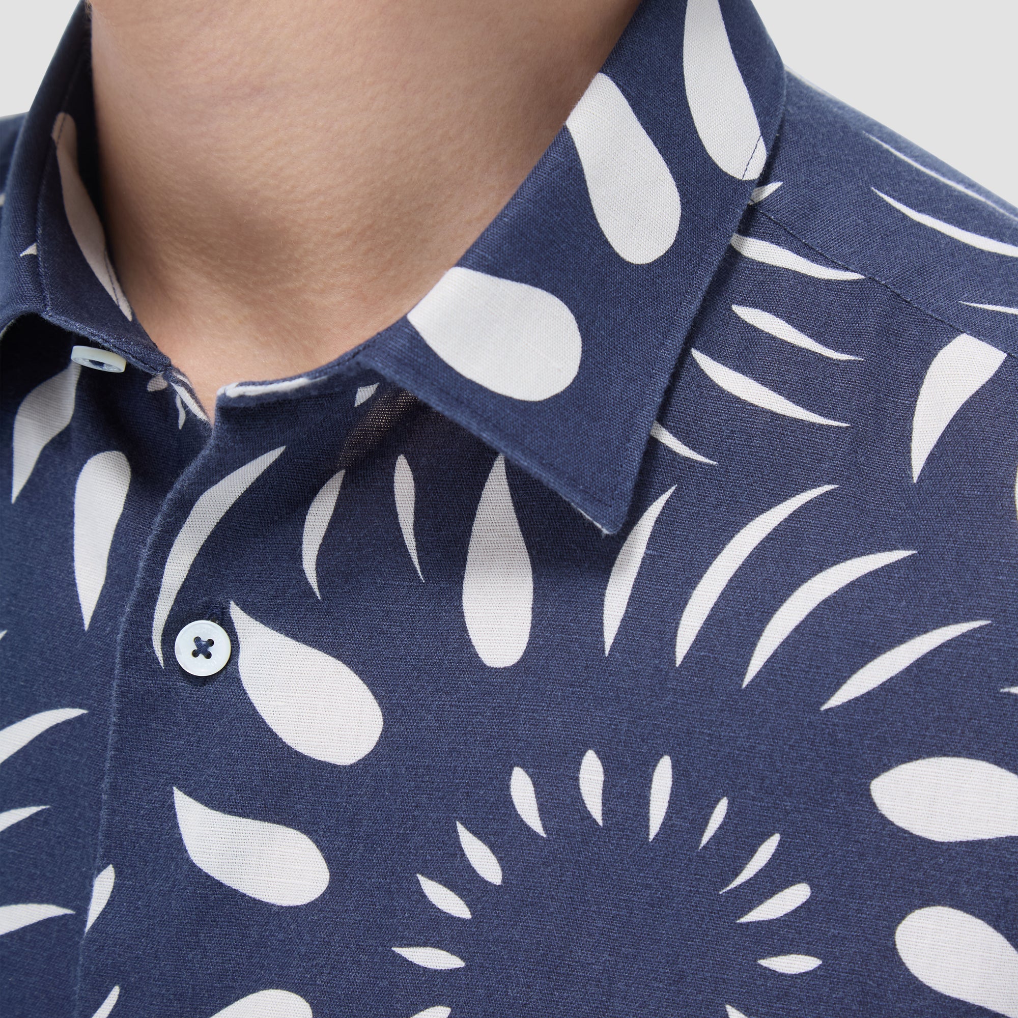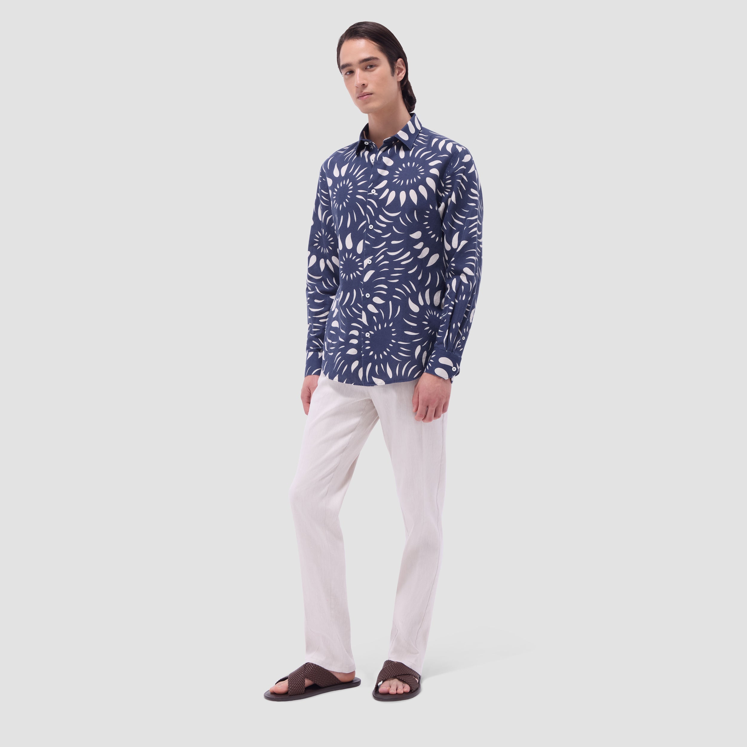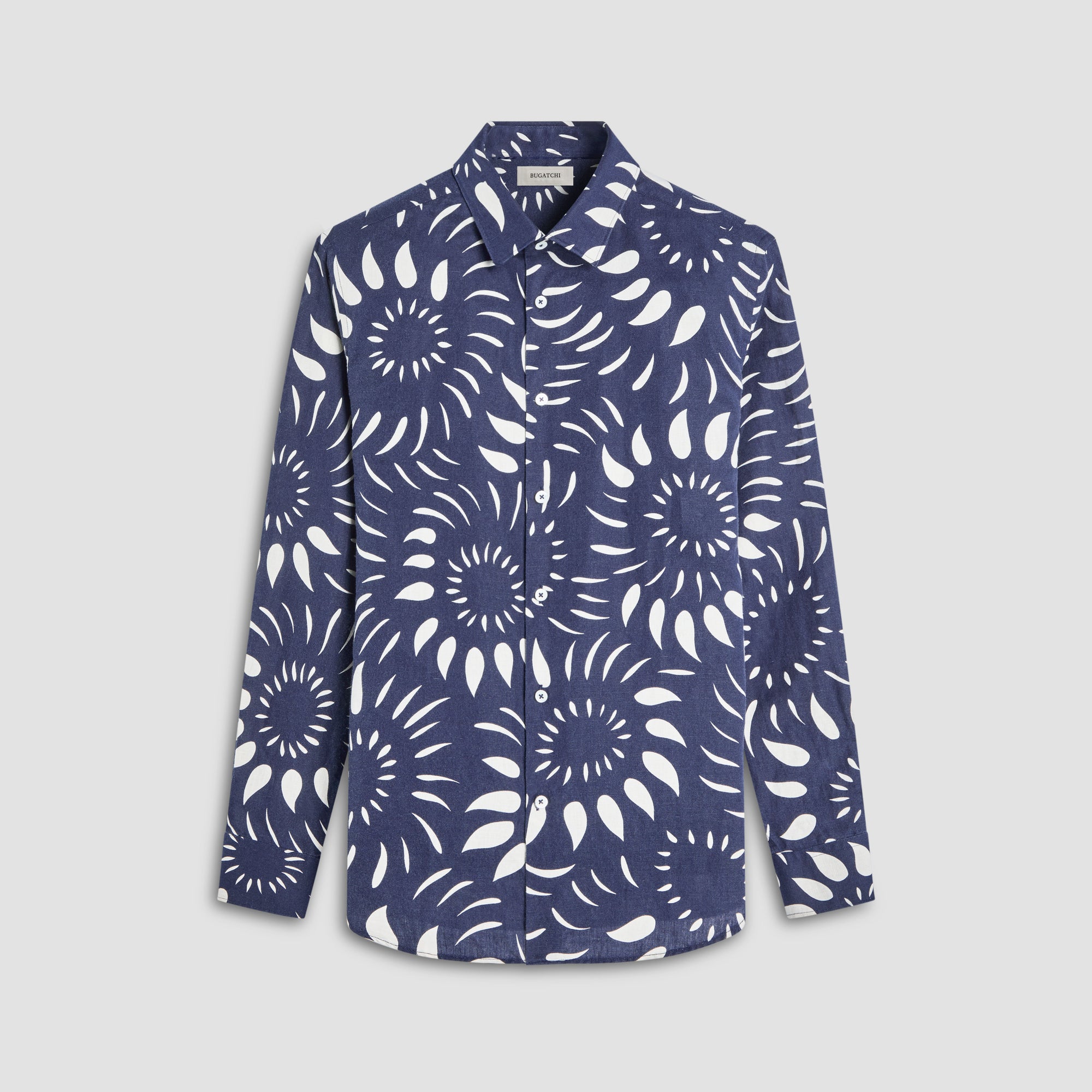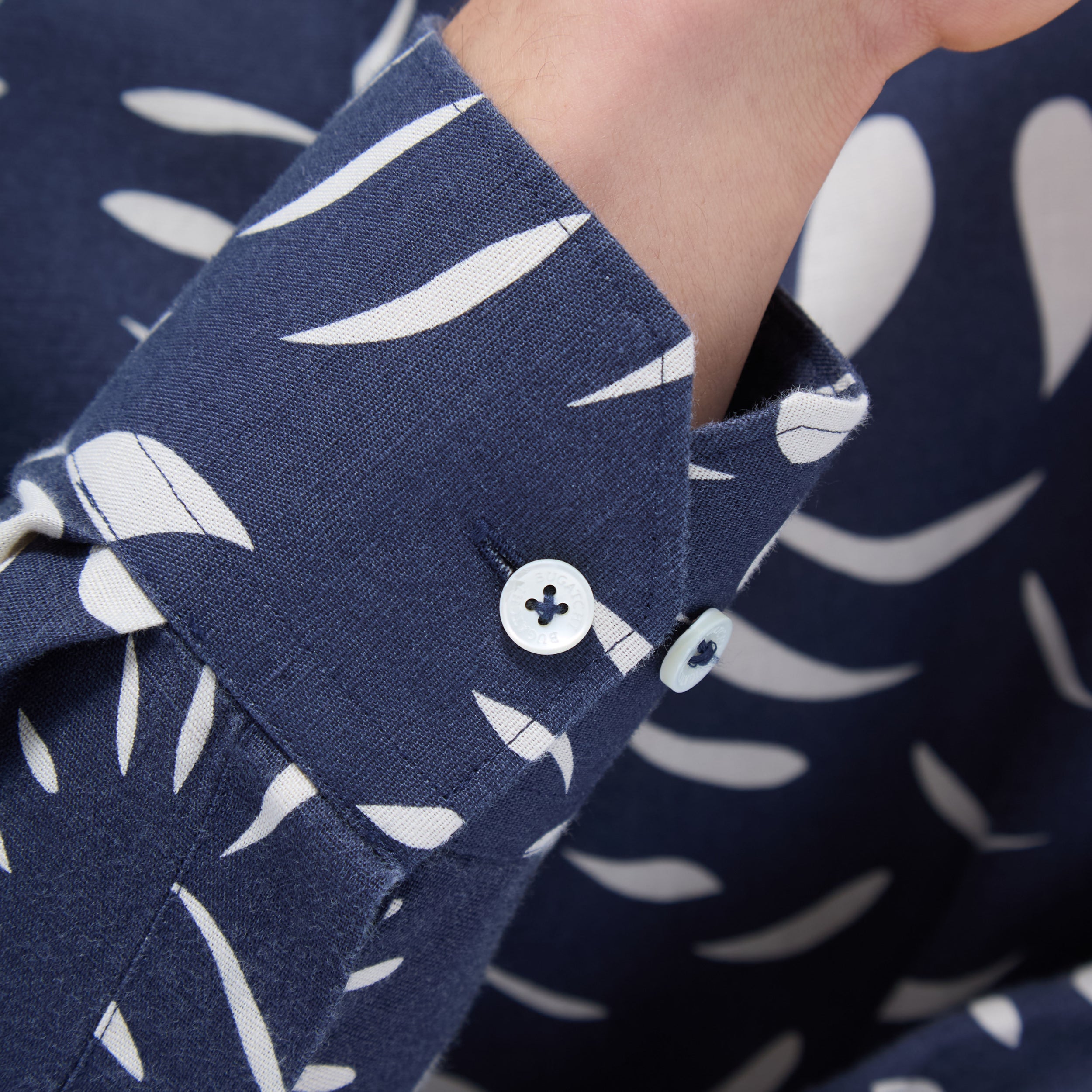 The Julian long-sleeve shirt in abstract print is crafted from a linen and cotton fabric. It features a point collar, a curved hem that can be worn tucked or untucked, mother-of-pearl buttons, and notched cuffs adjustable for a custom fit-wear them snug or loose. The combination of both fibers balances the crispness of linen with the softness and resilience of cotton to create a comfortable shirt perfect for any occasion.