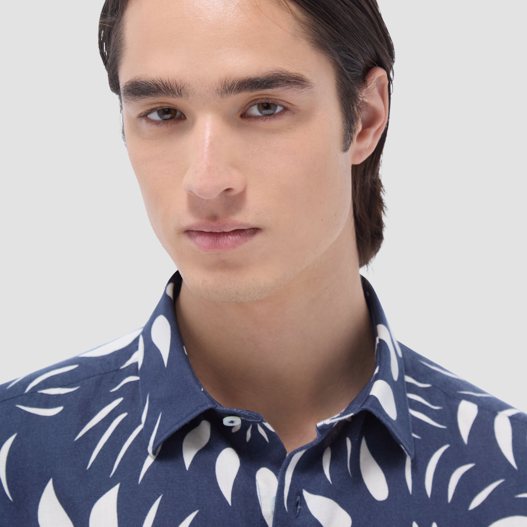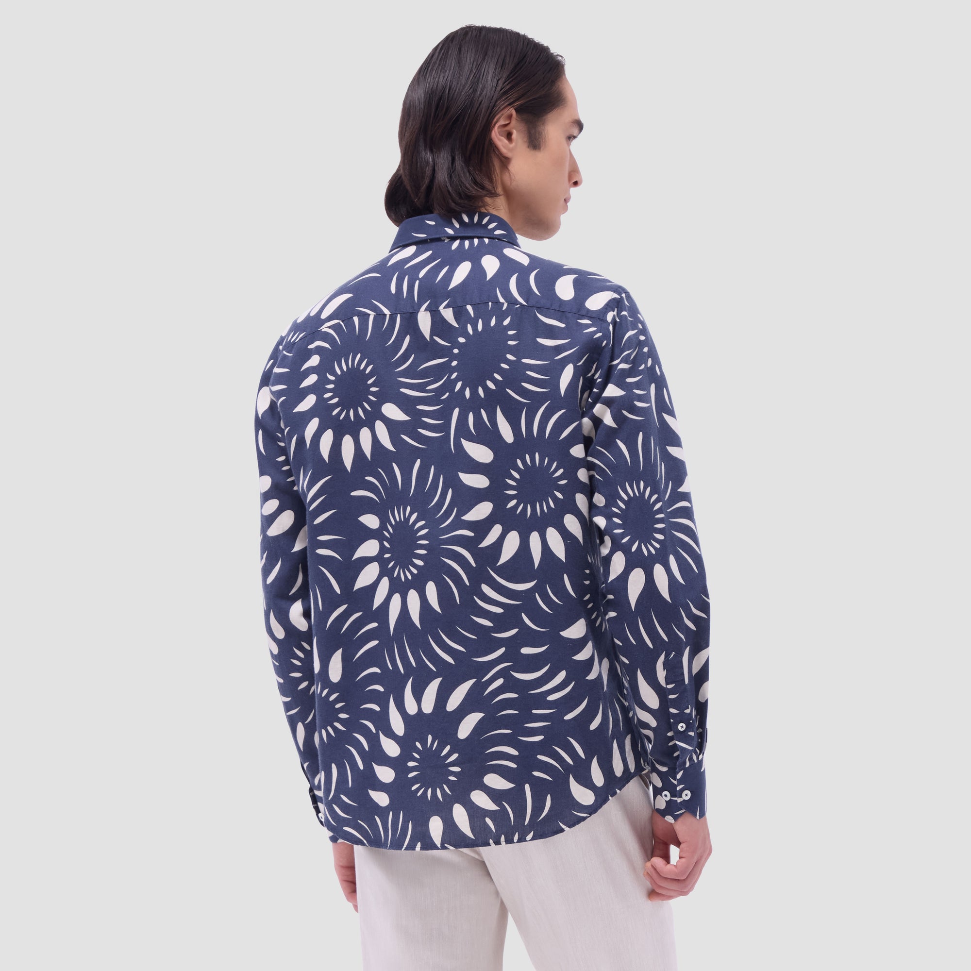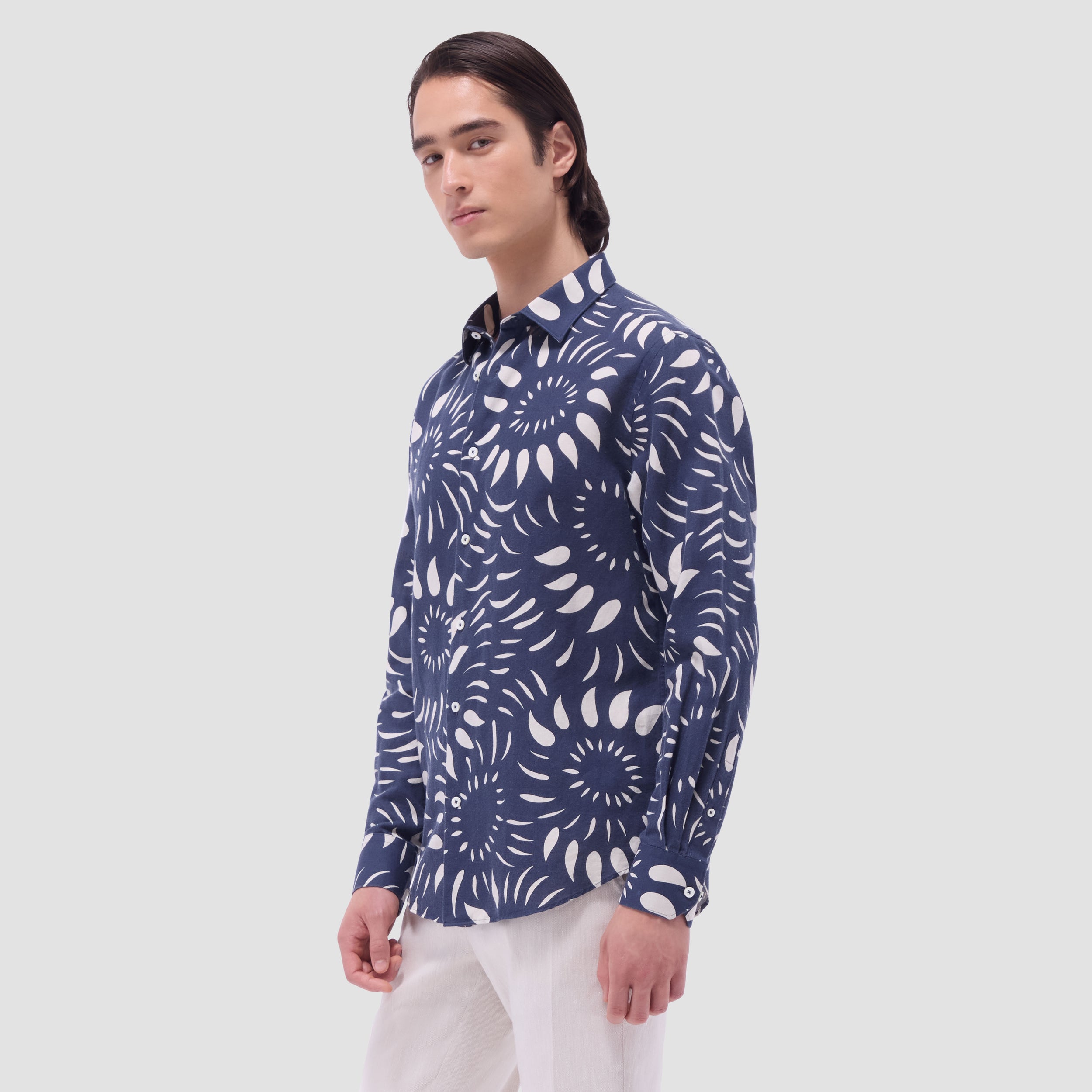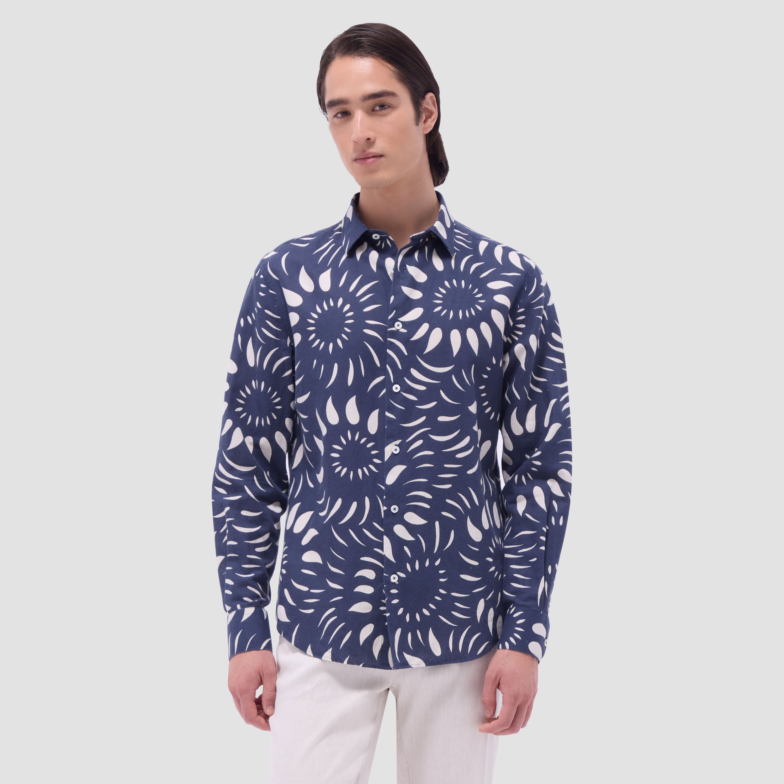 The Julian long-sleeve shirt in abstract print is crafted from a linen and cotton fabric. It features a point collar, a curved hem that can be worn tucked or untucked, mother-of-pearl buttons, and notched cuffs adjustable for a custom fit-wear them snug or loose. The combination of both fibers balances the crispness of linen with the softness and resilience of cotton to create a comfortable shirt perfect for any occasion.