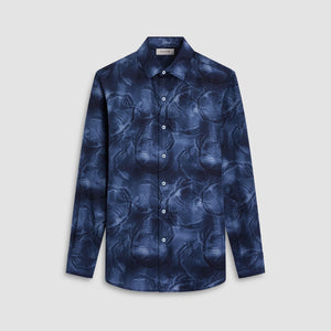 The Julian long-sleeve shirt in abstract print is crafted from 100% Italian lyocell, a premium eco-friendly fabric with soft drape and natural breathability. It features a point collar, mother-of-pearl buttons, a curved hem that looks great tucked or untucked, and adjustable notched cuffs that also convert for cufflinks. A refined, all-occasion shirt.