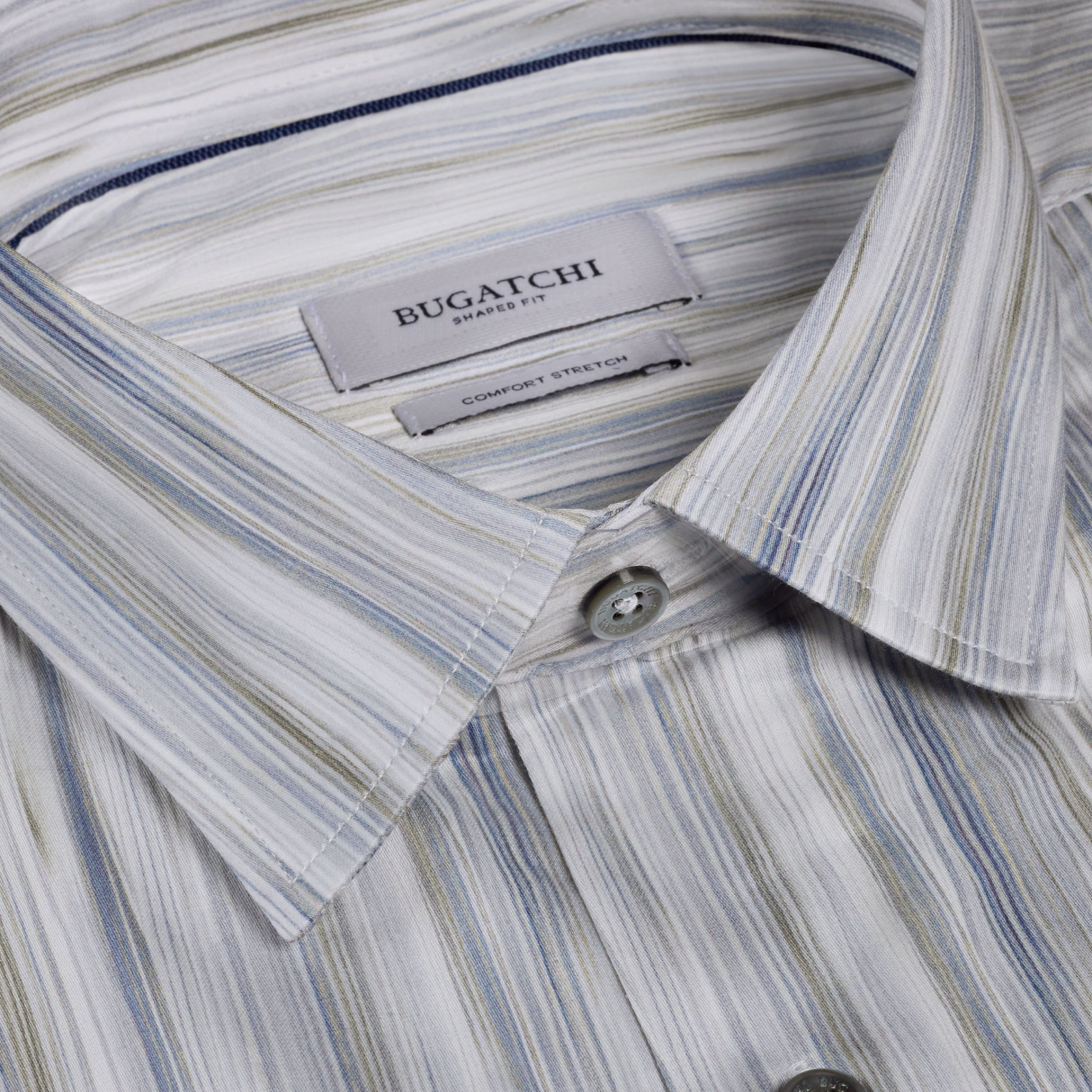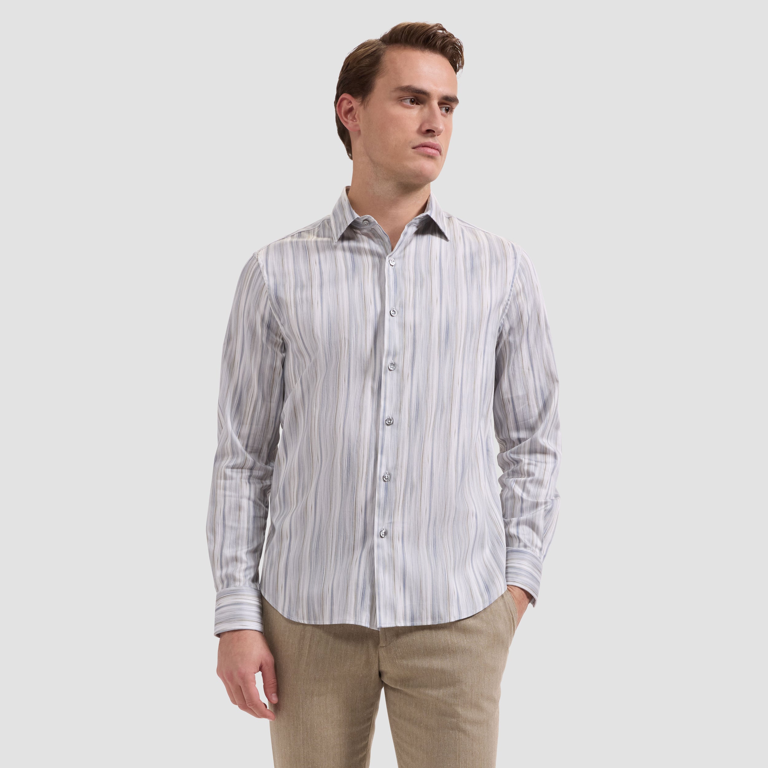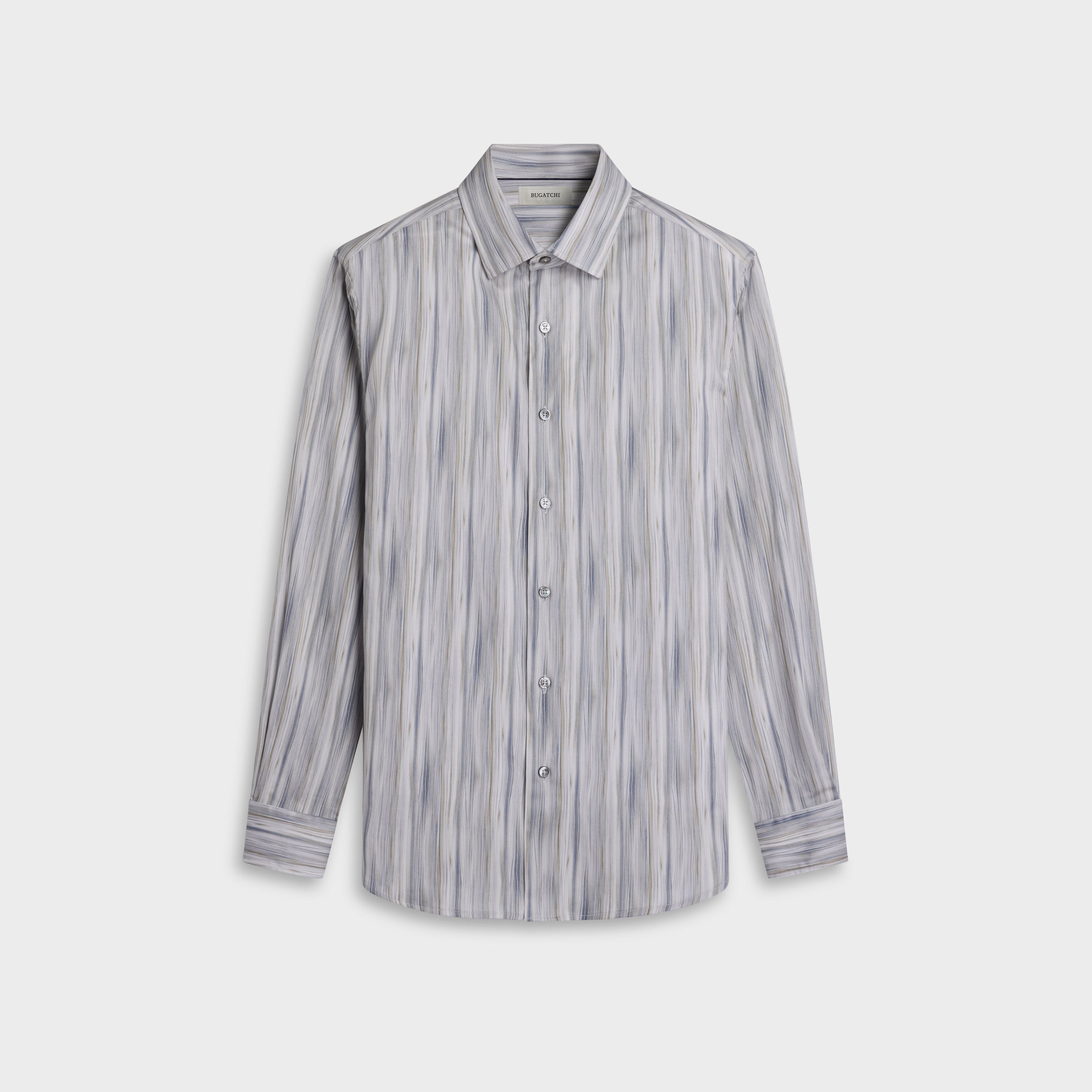 The Julian long-sleeve Comfort Stretch shirt is crafted from premium Italian cotton fabric with added stretch for all-day ease, in a brushstroke stripe print. Designed with a point collar, genuine mother-of-pearl buttons, and adjustable notched cuffs that also convert for cufflinks. A versatile shirt that looks polished whether tucked or untucked.