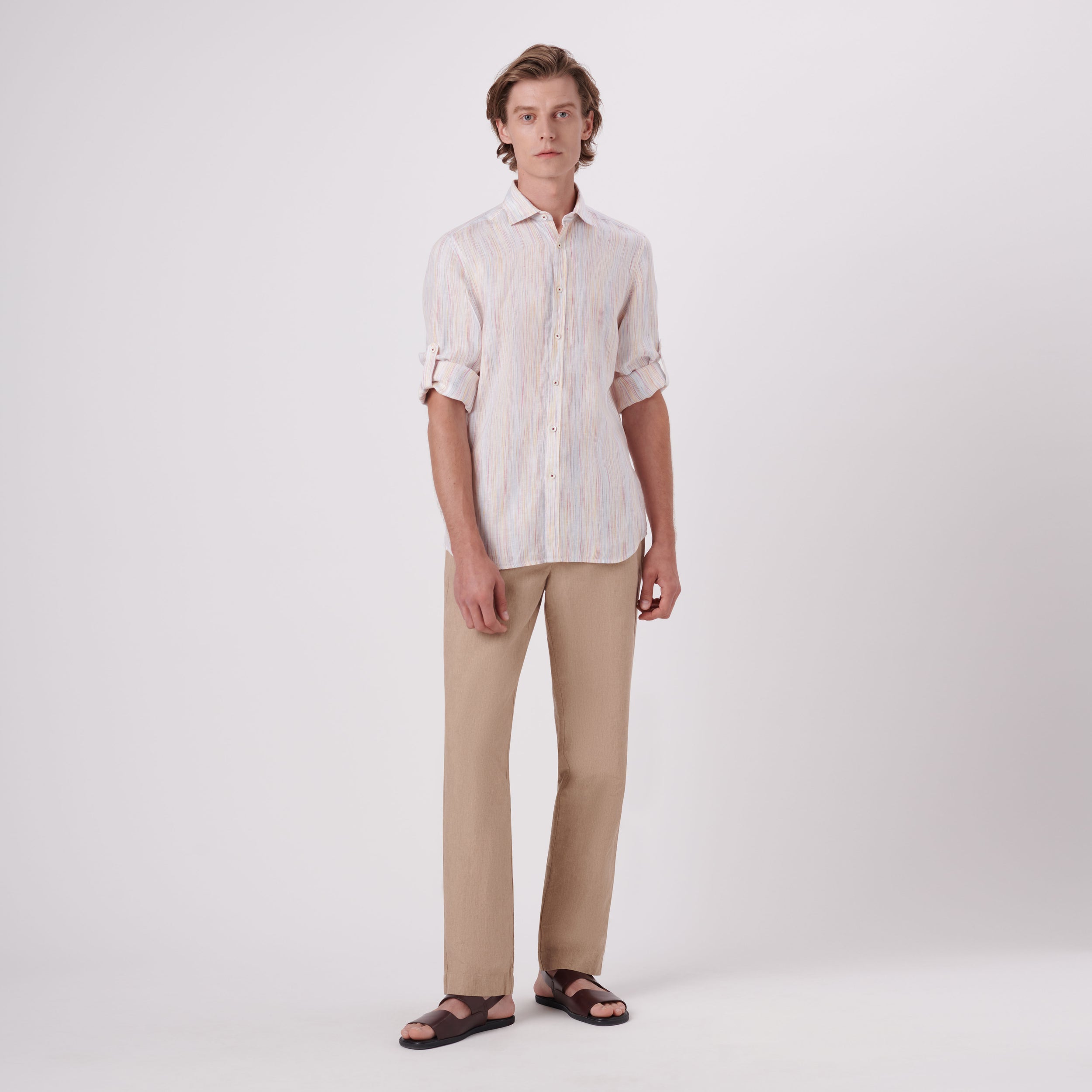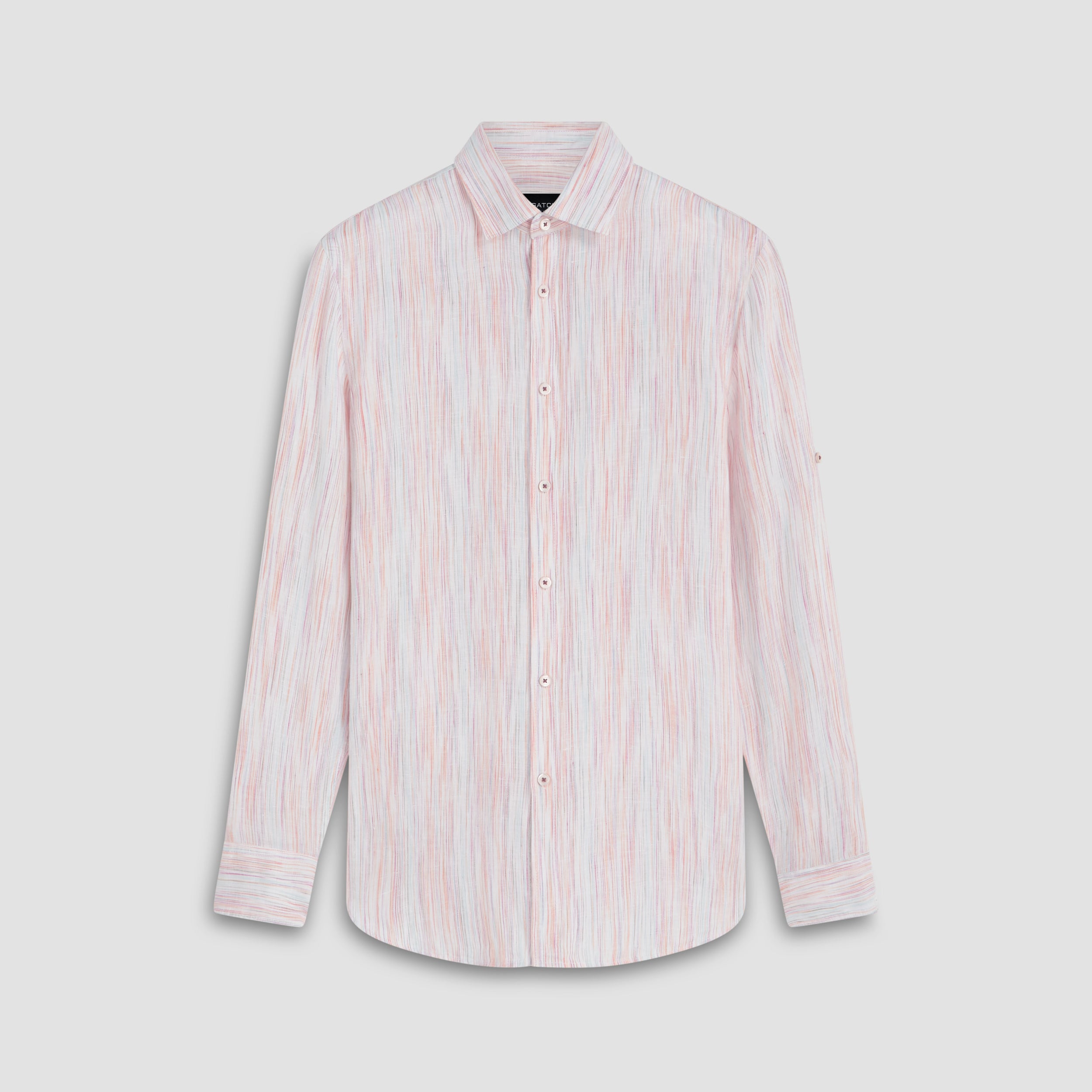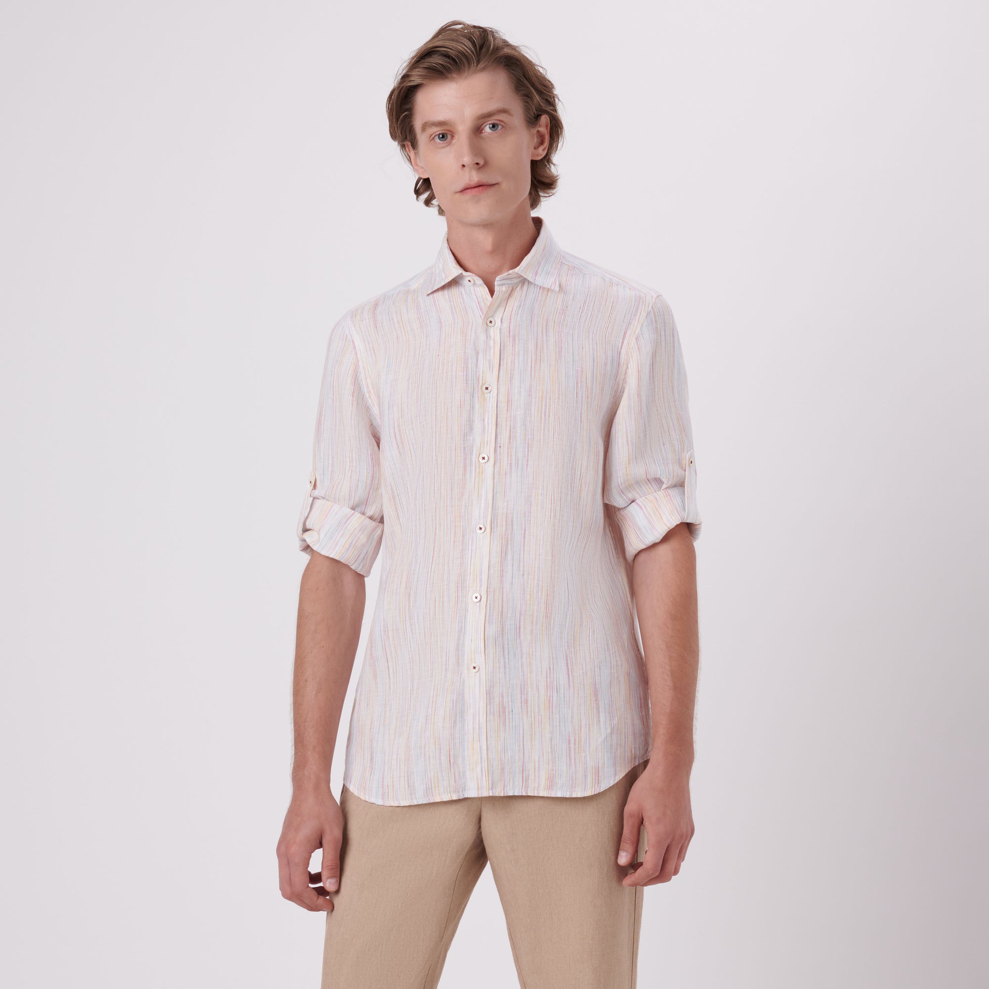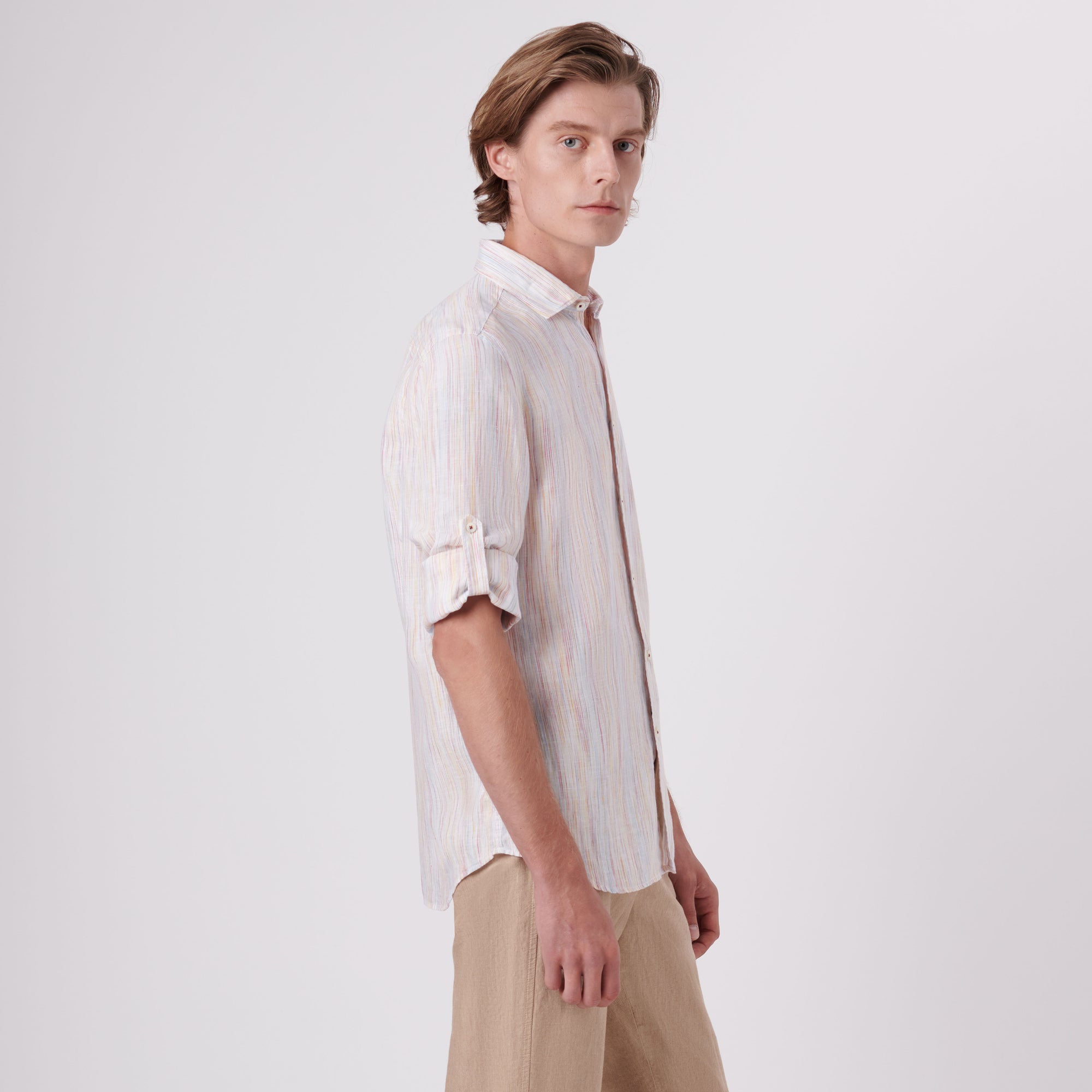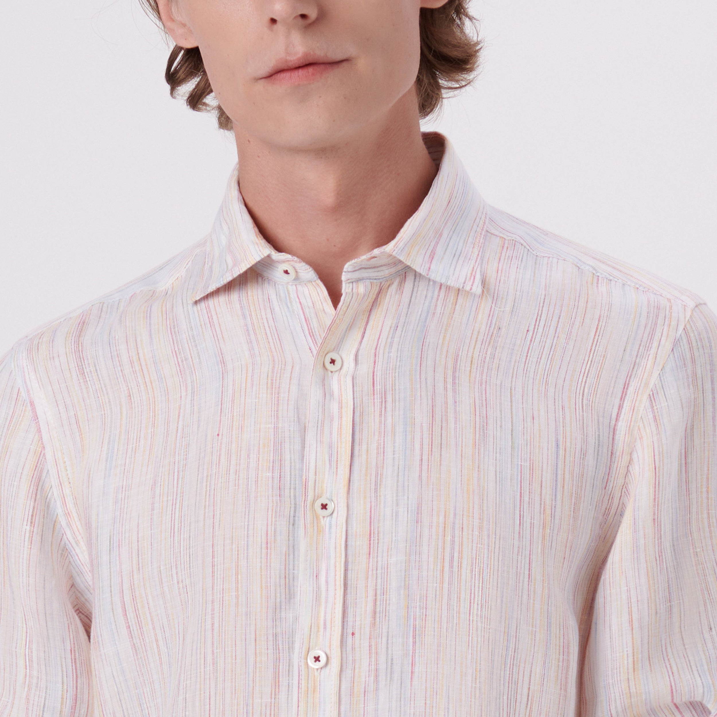 Julian chalk stripe long-sleeved shirt in 100% linen with point collar, adjustable notched cuffs, roll-up sleeve button tab, genuine shell buttons and a curved hemline.