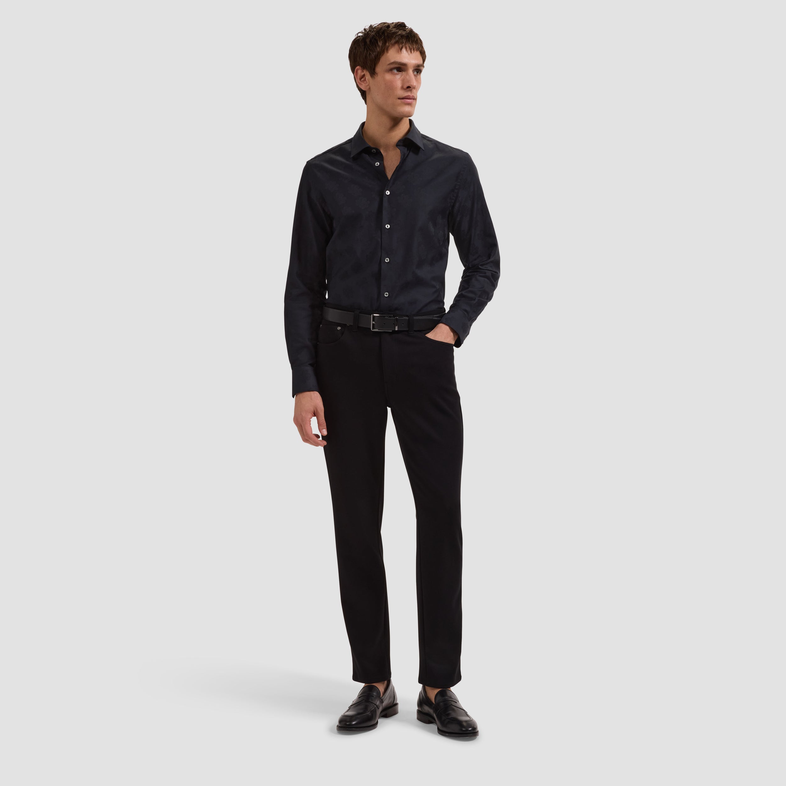 The Julian long-sleeve Comfort Stretch shirt is crafted from premium cotton fabric with added stretch for all-day ease in a tonal floral jacquard weave that adds subtle texture and sophistication. Designed with a point collar, genuine mother-of-pearl buttons, and adjustable notched cuffs that also convert for cufflinks. A versatile shirt that looks polished whether tucked or untucked.