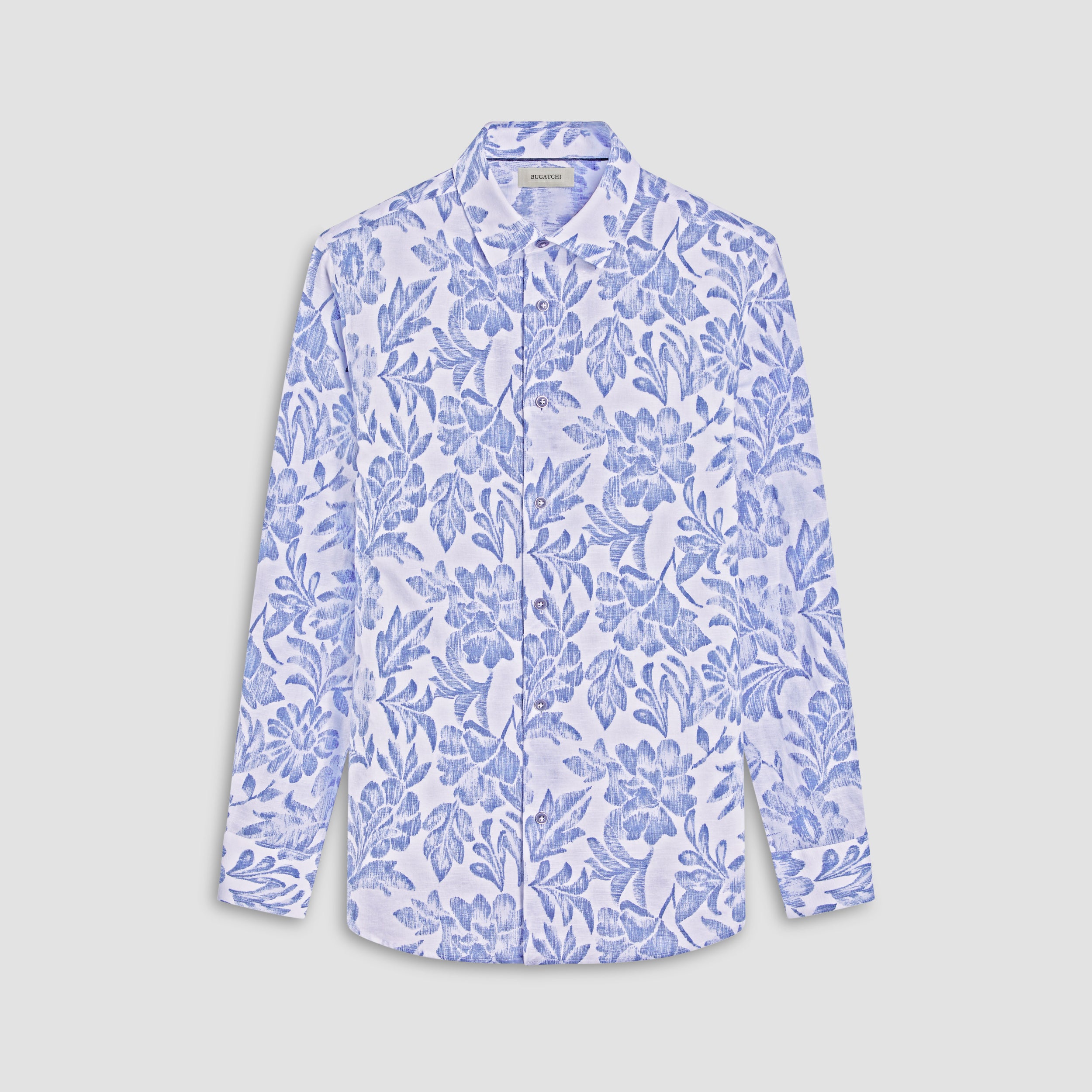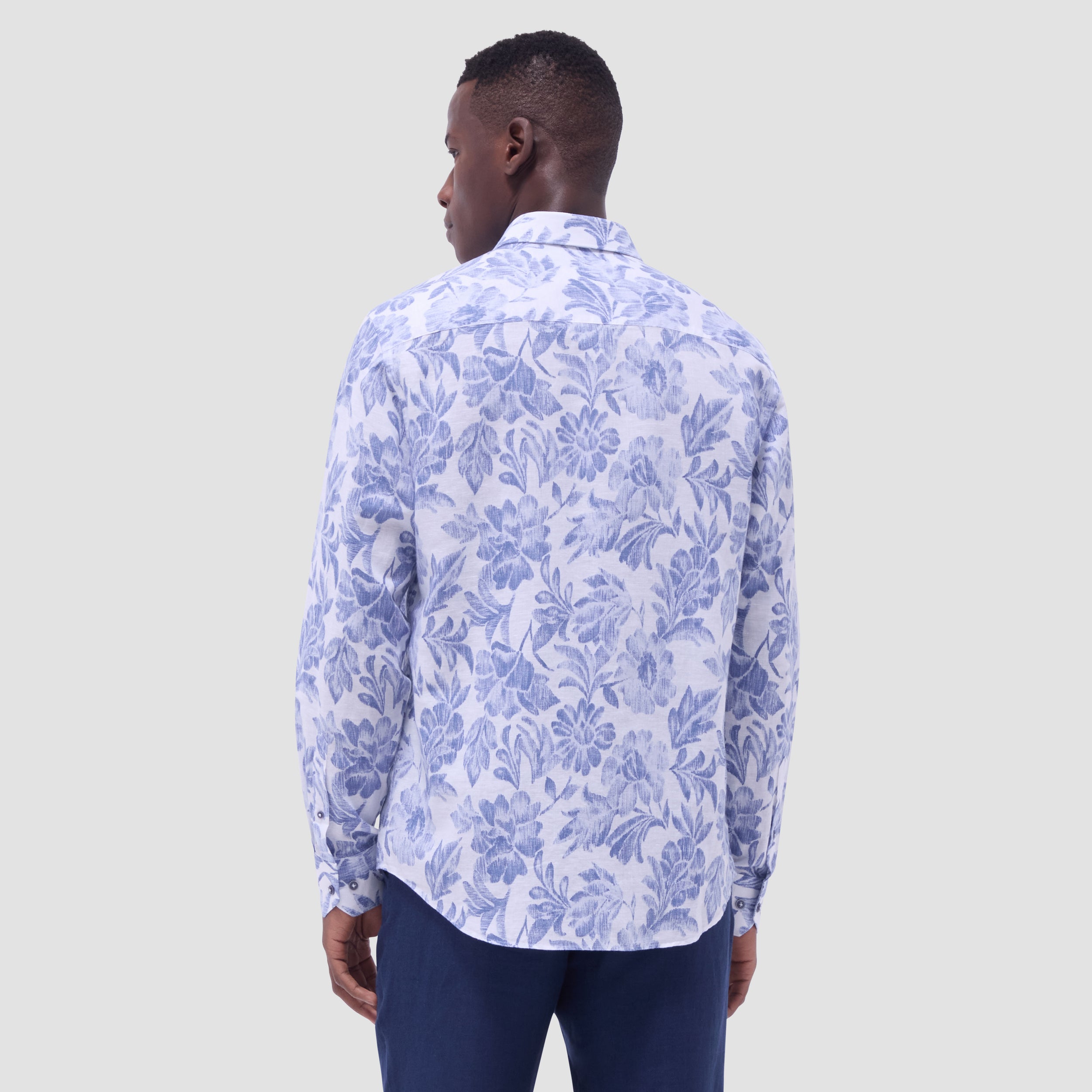 The Julian long-sleeve shirt in floral print is crafted from a linen and cotton fabric. It features a point collar, a curved hem that can be worn tucked or untucked, and notched cuffs adjustable for a custom fit-wear them snug or loose. The combination of both fibers balances the crispness of linen with the softness and resilience of cotton to create a comfortable shirt perfect for any occasion.