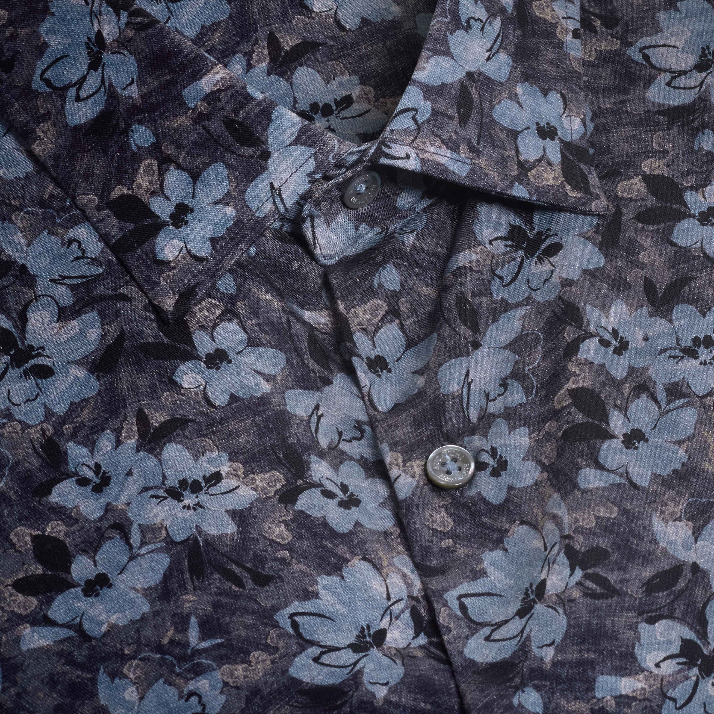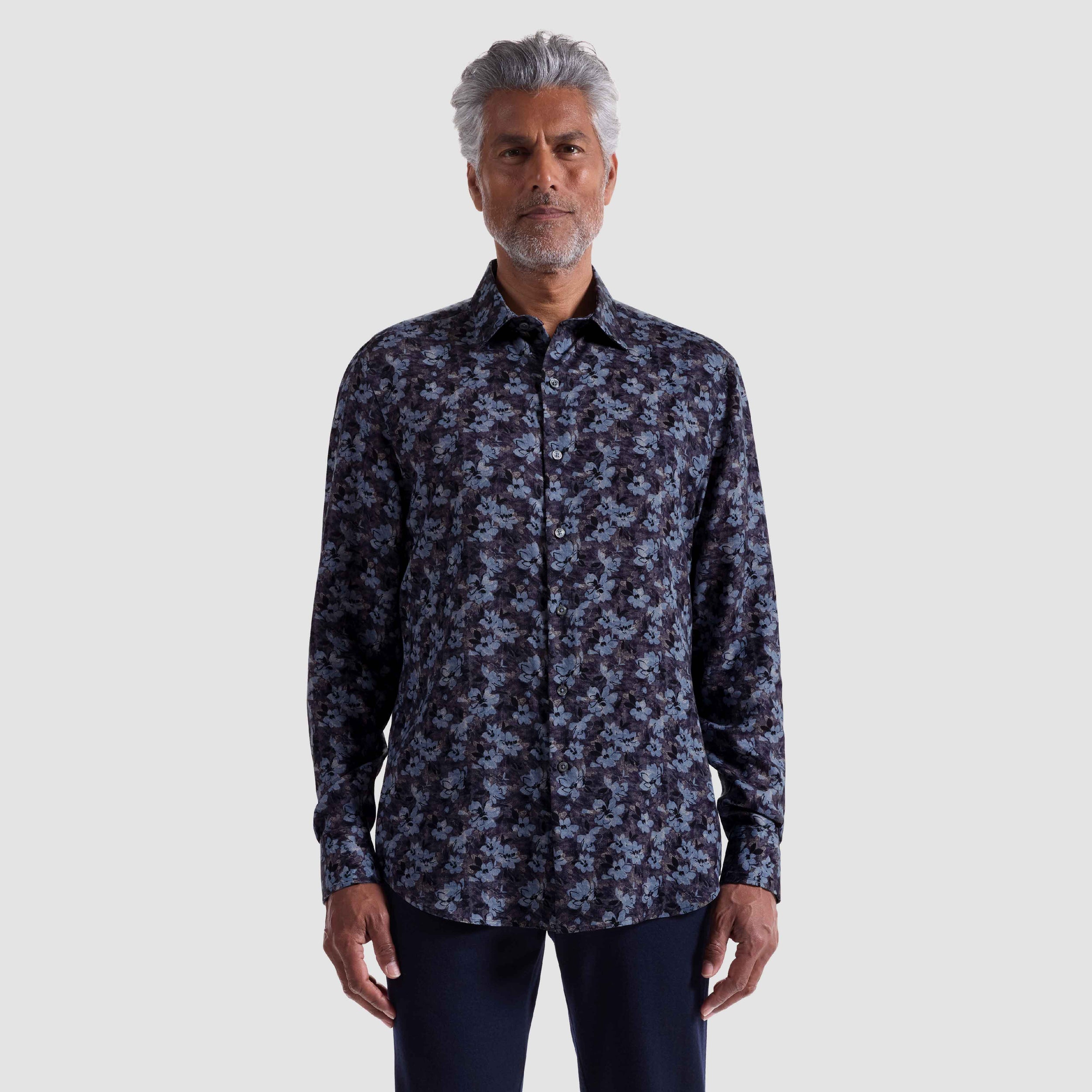 The Julian long-sleeve shirt in floral print is crafted from 100% lyocell, a premium eco-friendly fabric with soft drape and natural breathability. It features a point collar, mother-of-pearl buttons, a curved hem that looks great tucked or untucked, and adjustable notched cuffs that also convert for cufflinks. A refined, all-occasion shirt.