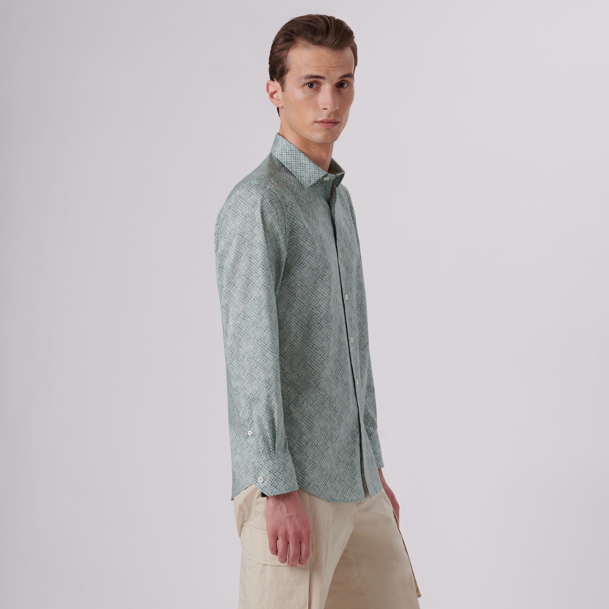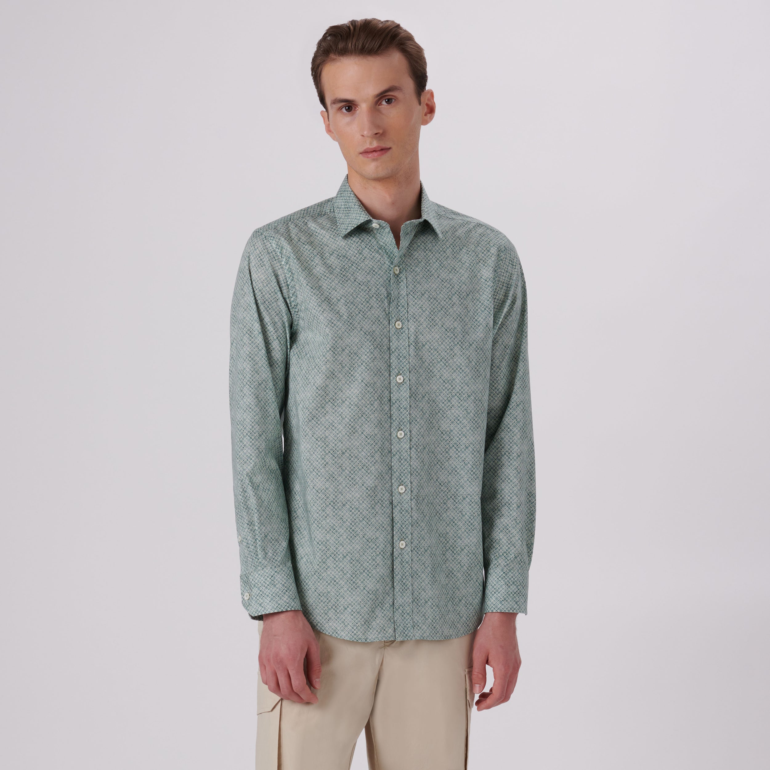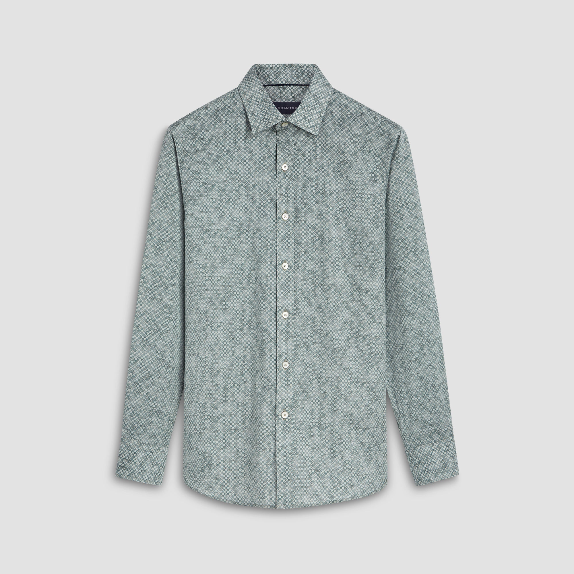 Julian geometric print long-sleeved shirt in comfort stretch cotton with point collar, adjustable notched cuffs, genuine shell buttons and a curved hemline.