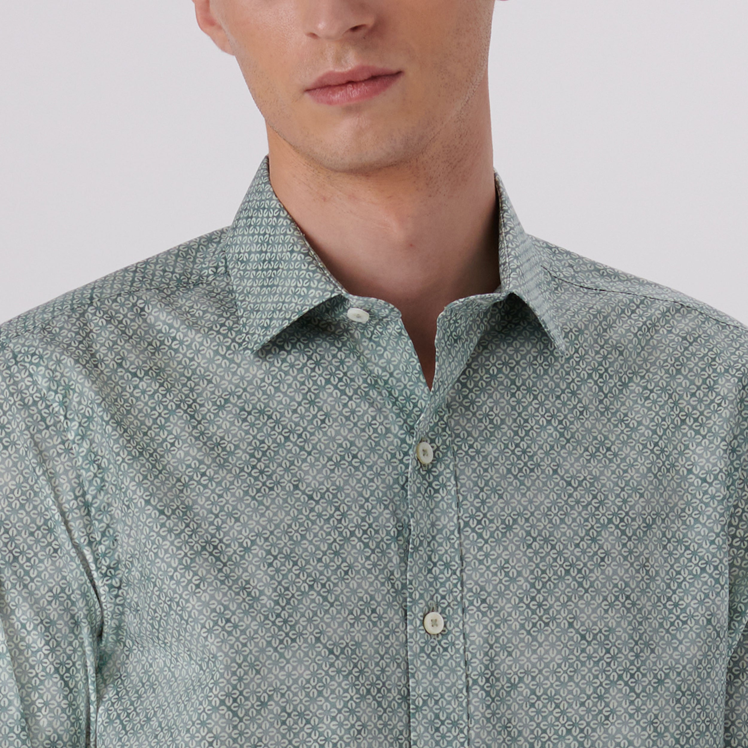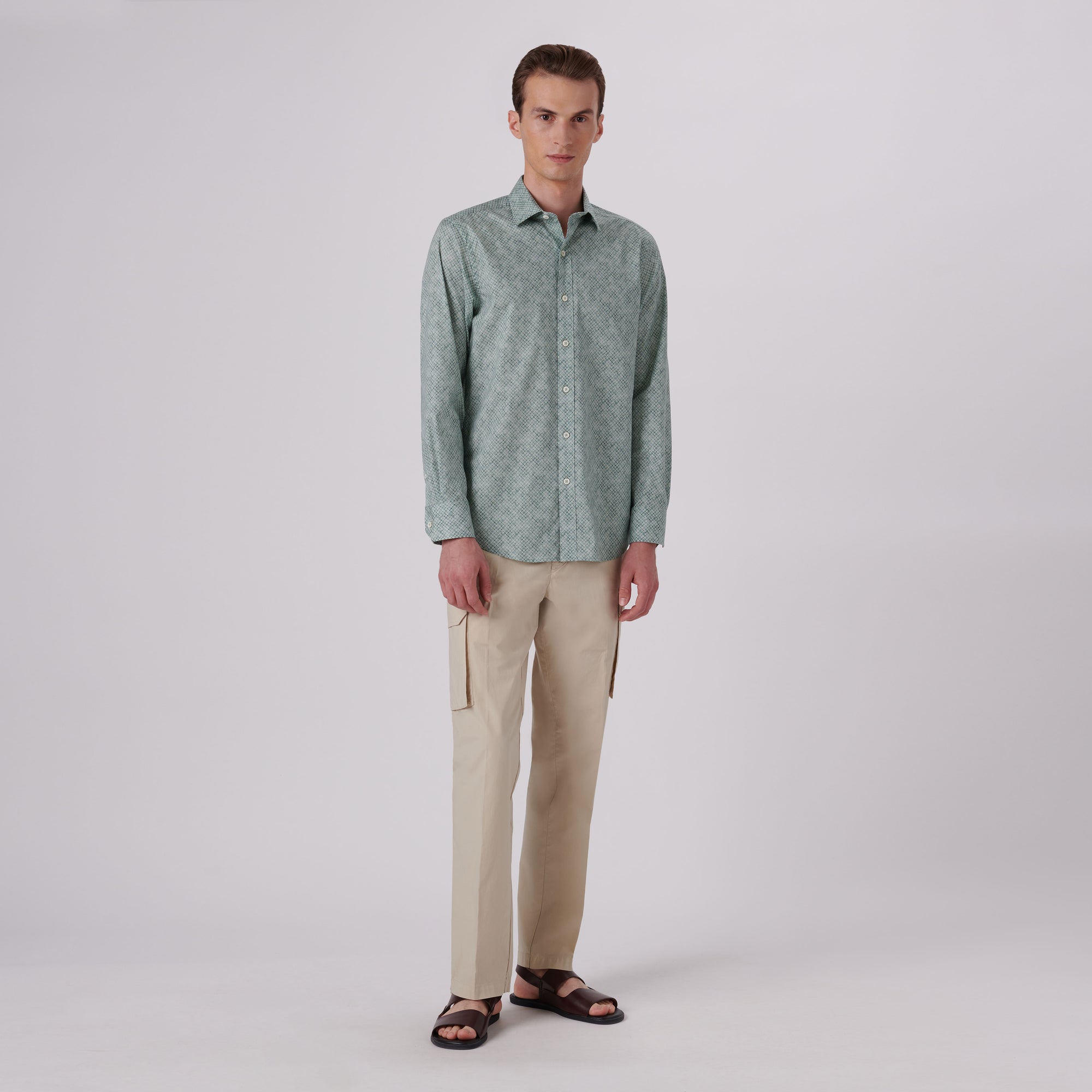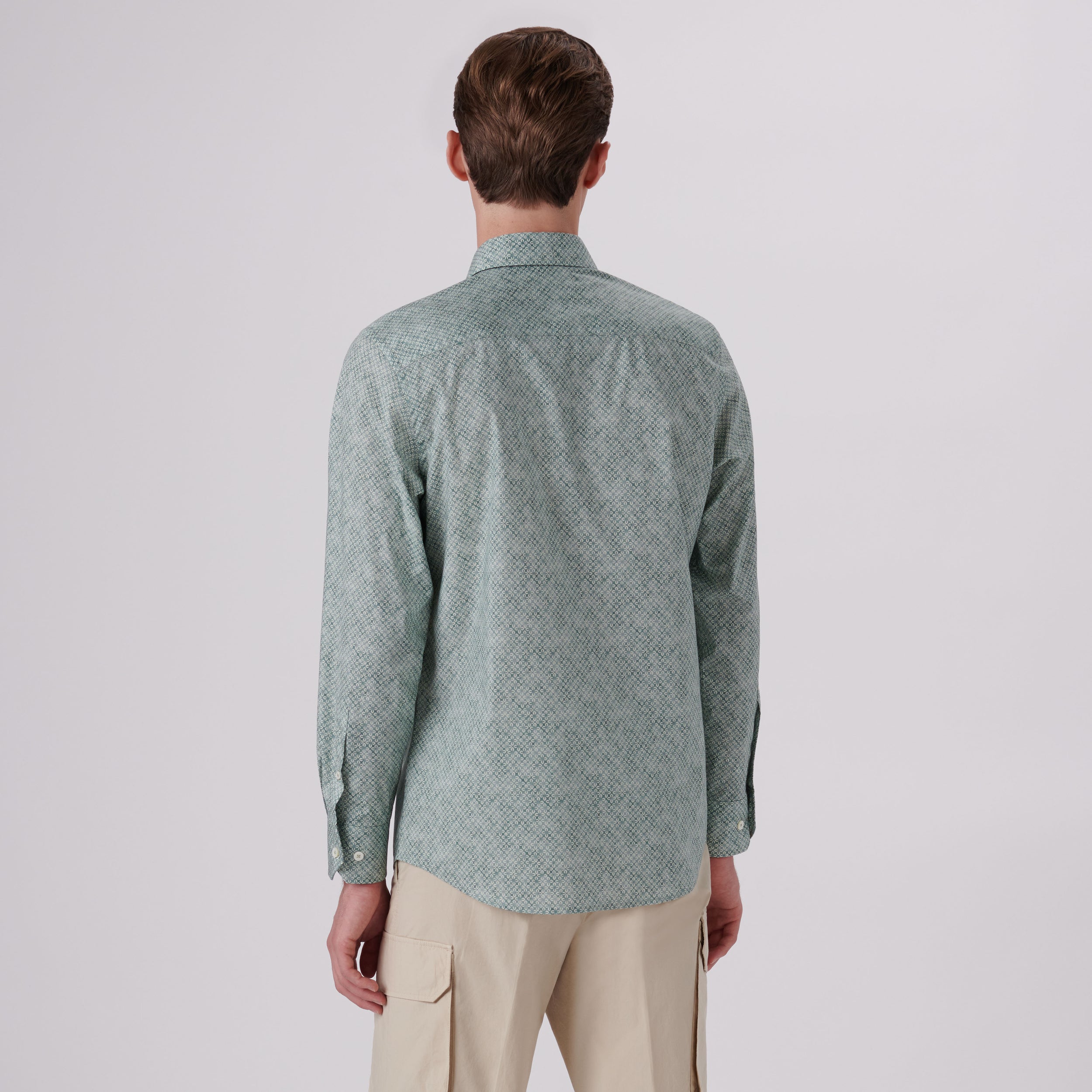Julian geometric print long-sleeved shirt in comfort stretch cotton with point collar, adjustable notched cuffs, genuine shell buttons and a curved hemline.