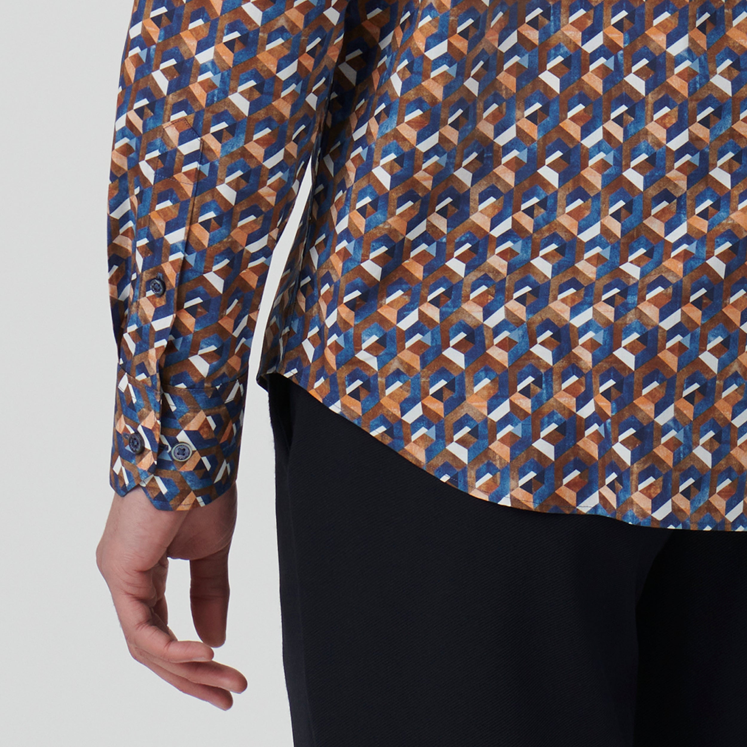 Julian long-sleeved shirt in geometric print COMFORT STRETCH cotton with point collar, adjustable notched cuffs and curved hem.
