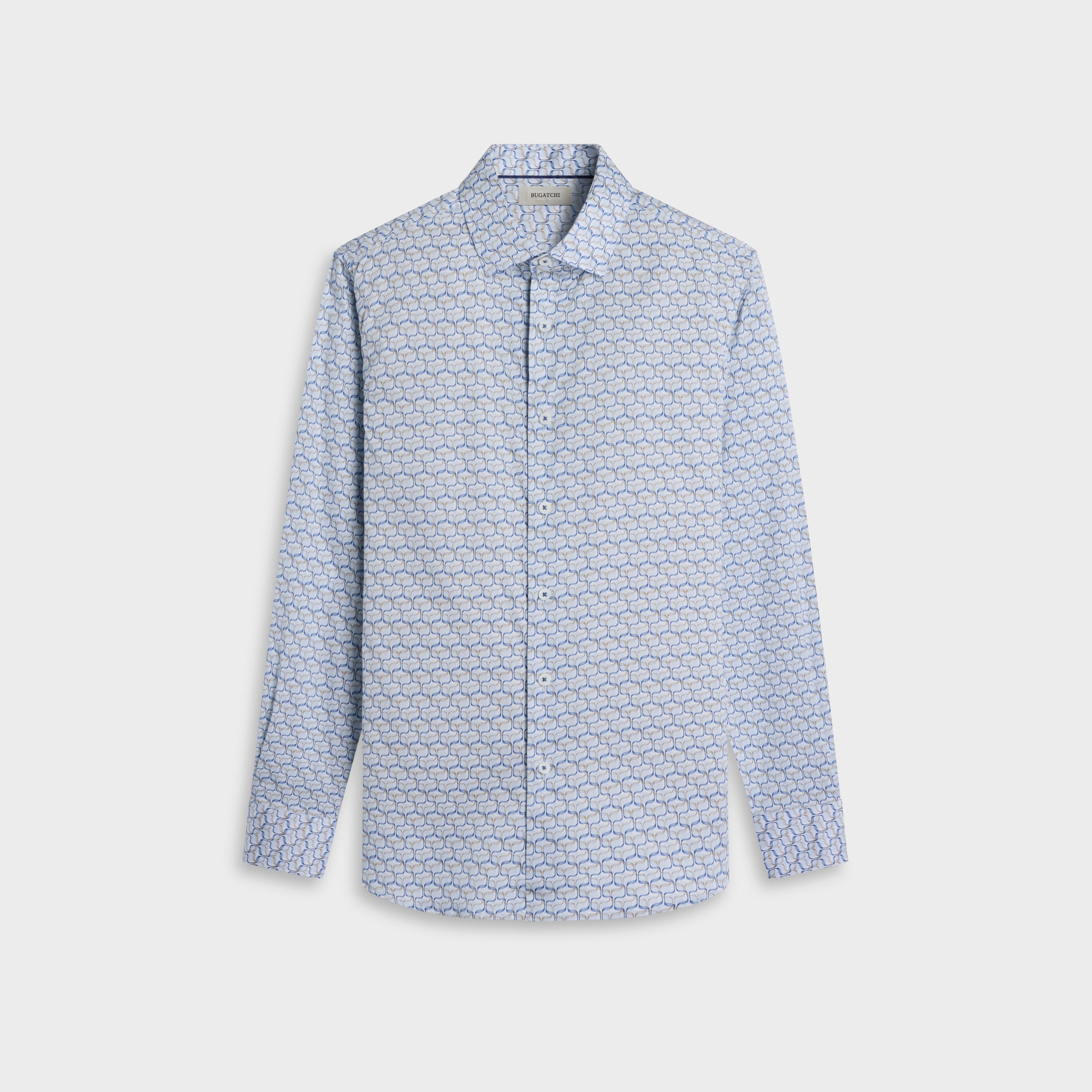 The Julian long-sleeve Comfort Stretch shirt is crafted from premium Italian cotton fabric with added stretch for all-day ease, in a retro geometric wave print. Designed with a point collar, genuine mother-of-pearl buttons, and adjustable notched cuffs that also convert for cufflinks. A versatile shirt that looks polished whether tucked or untucked.