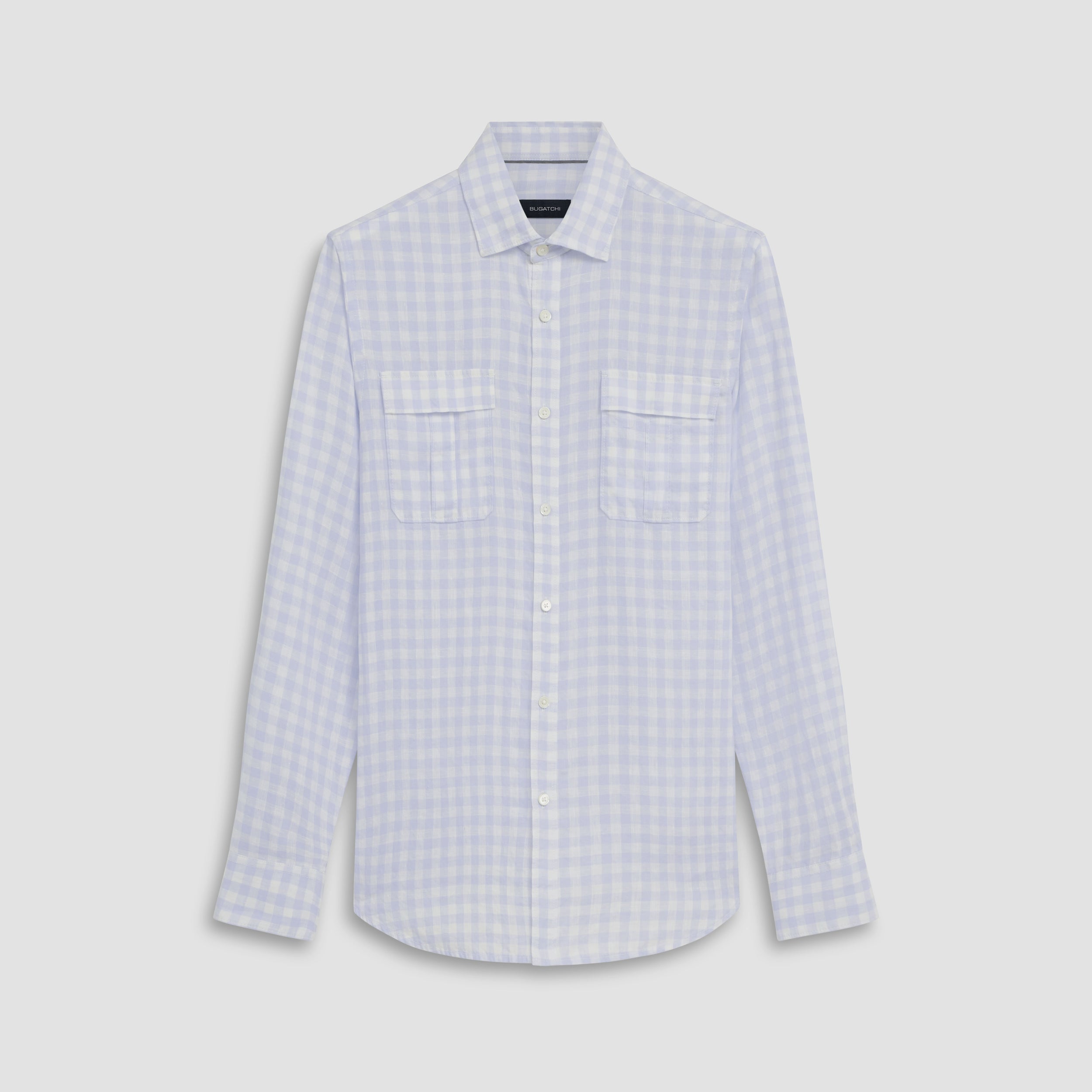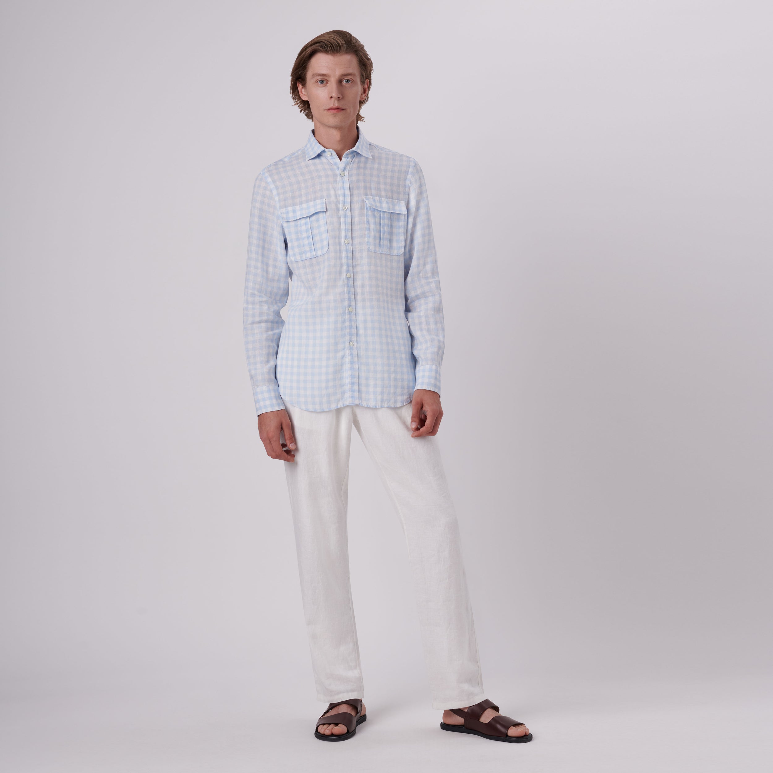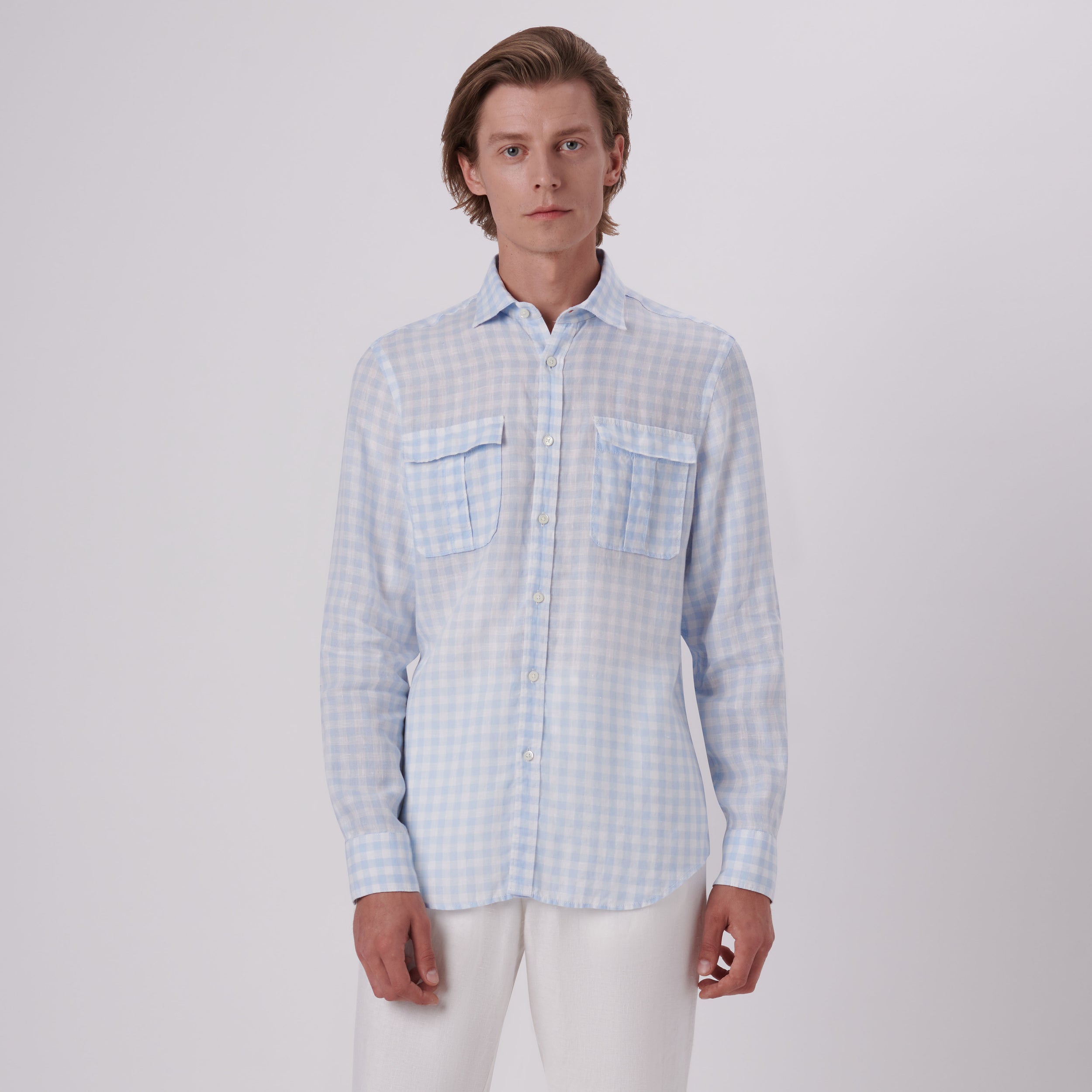 Julian gingham check long-sleeved shirt in 100% linen with point collar, adjustable notched cuffs, genuine shell buttons, chest flap pockets and a curved hemline.