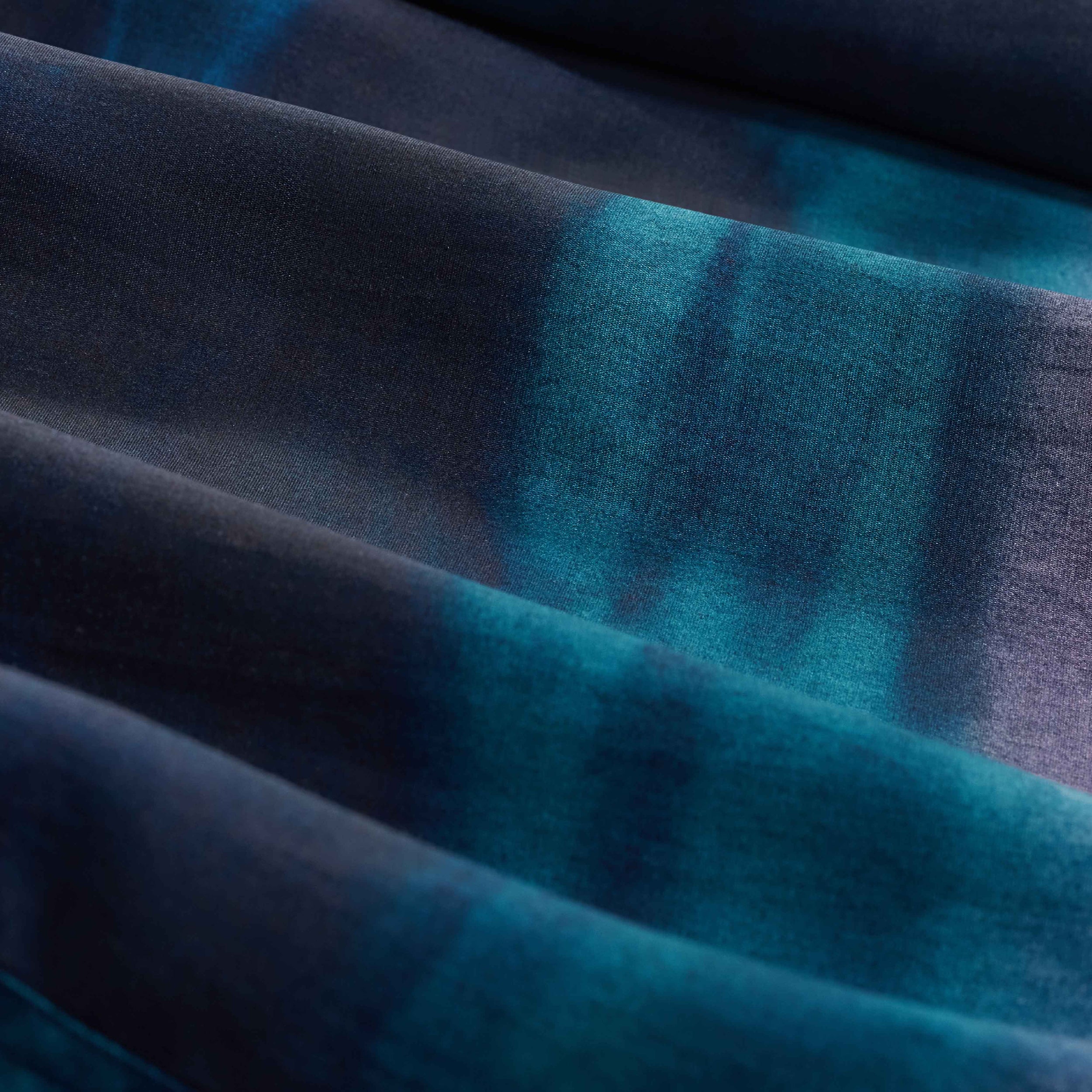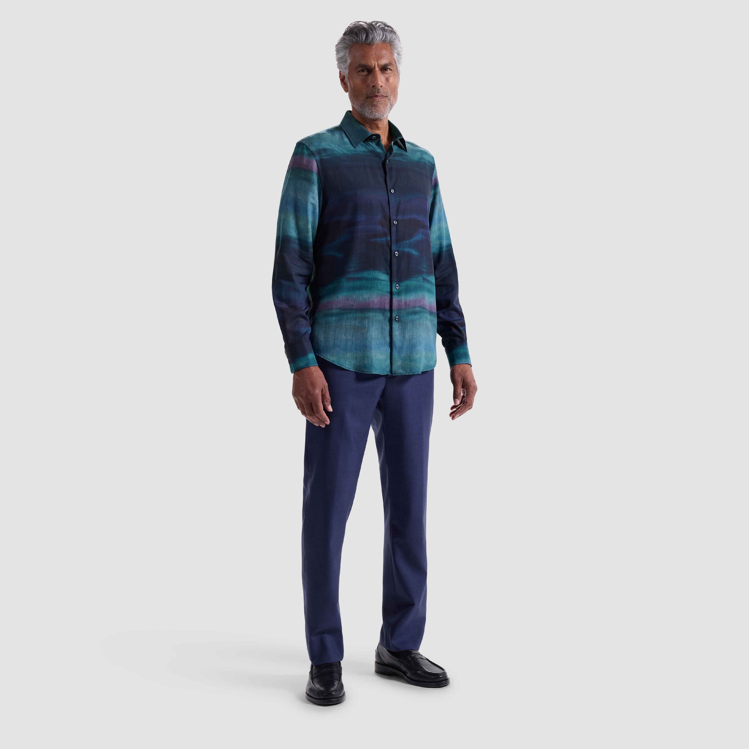 The Julian long-sleeve shirt in gradient abstract print is crafted from 100% Italian lyocell, a premium eco-friendly fabric with soft drape and natural breathability. It features a point collar, mother-of-pearl buttons, a curved hem that looks great tucked or untucked, and adjustable notched cuffs that also convert for cufflinks. A refined, all-occasion shirt.
