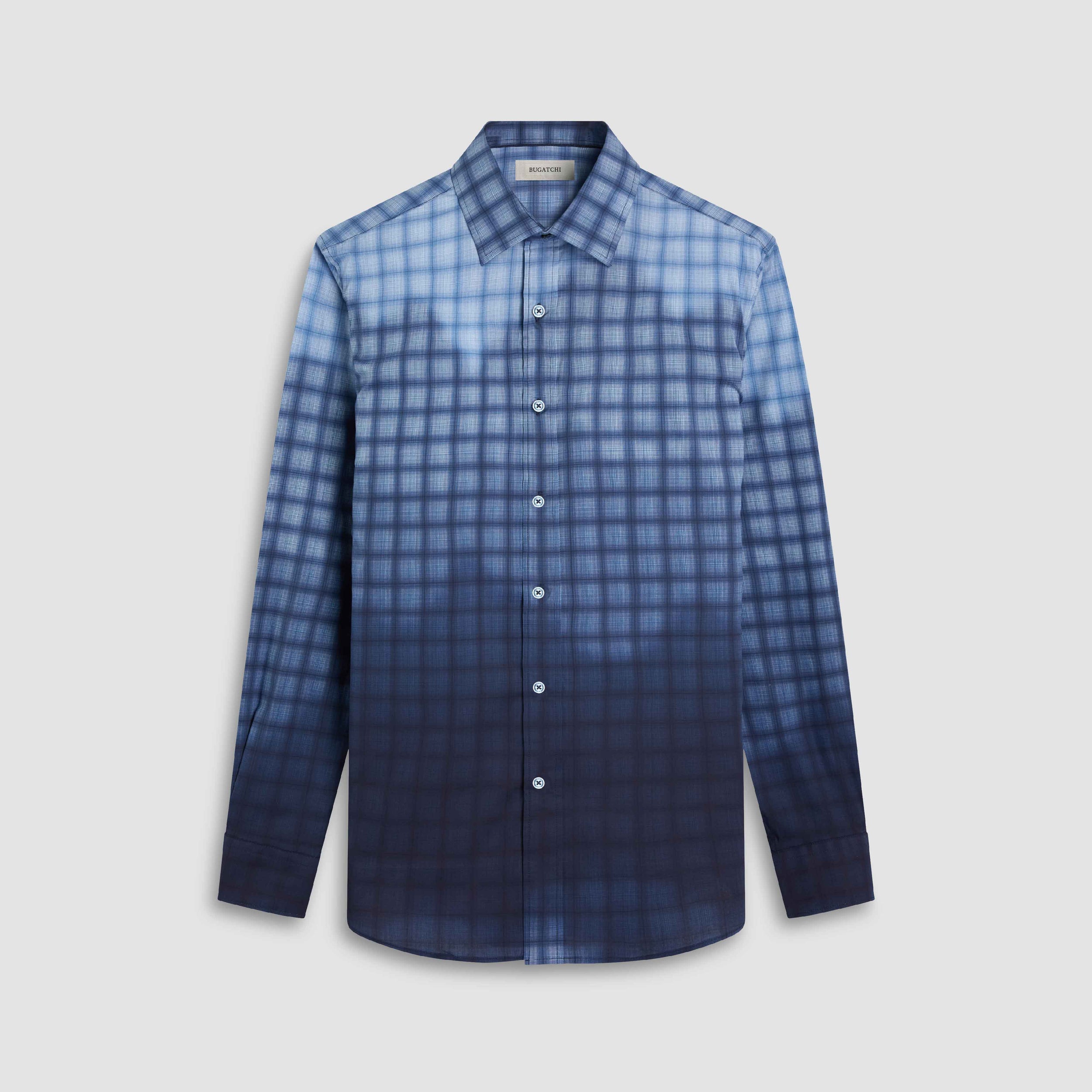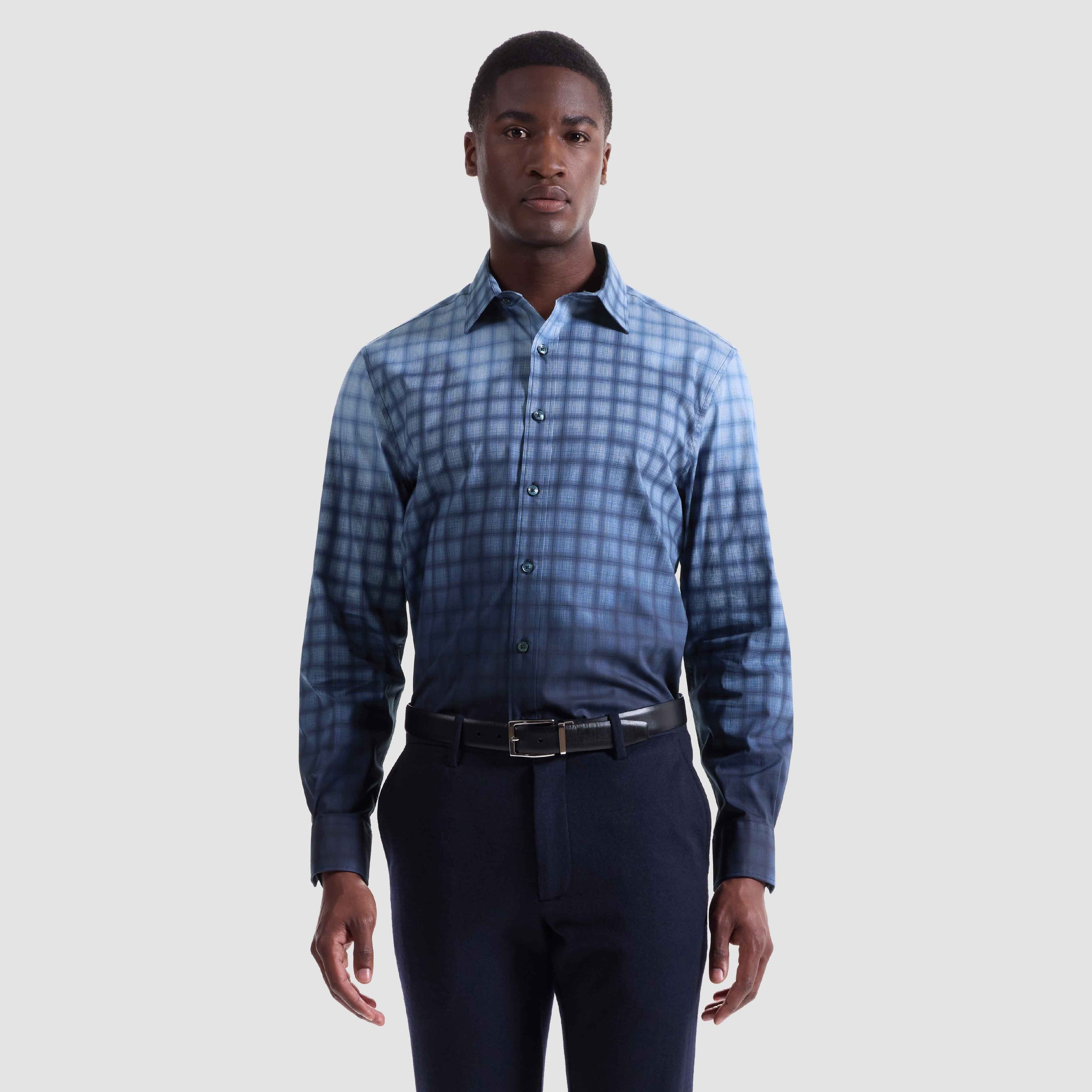 The Julian long-sleeve Comfort Stretch shirt in gradient check is crafted from premium Italian cotton with a hint of stretch for all-day comfort. It features a point collar, mother-of-pearl buttons, a curved hem that looks great tucked or untucked, and adjustable notched cuffs that also convert for cufflinks. A refined, all-occasion shirt.