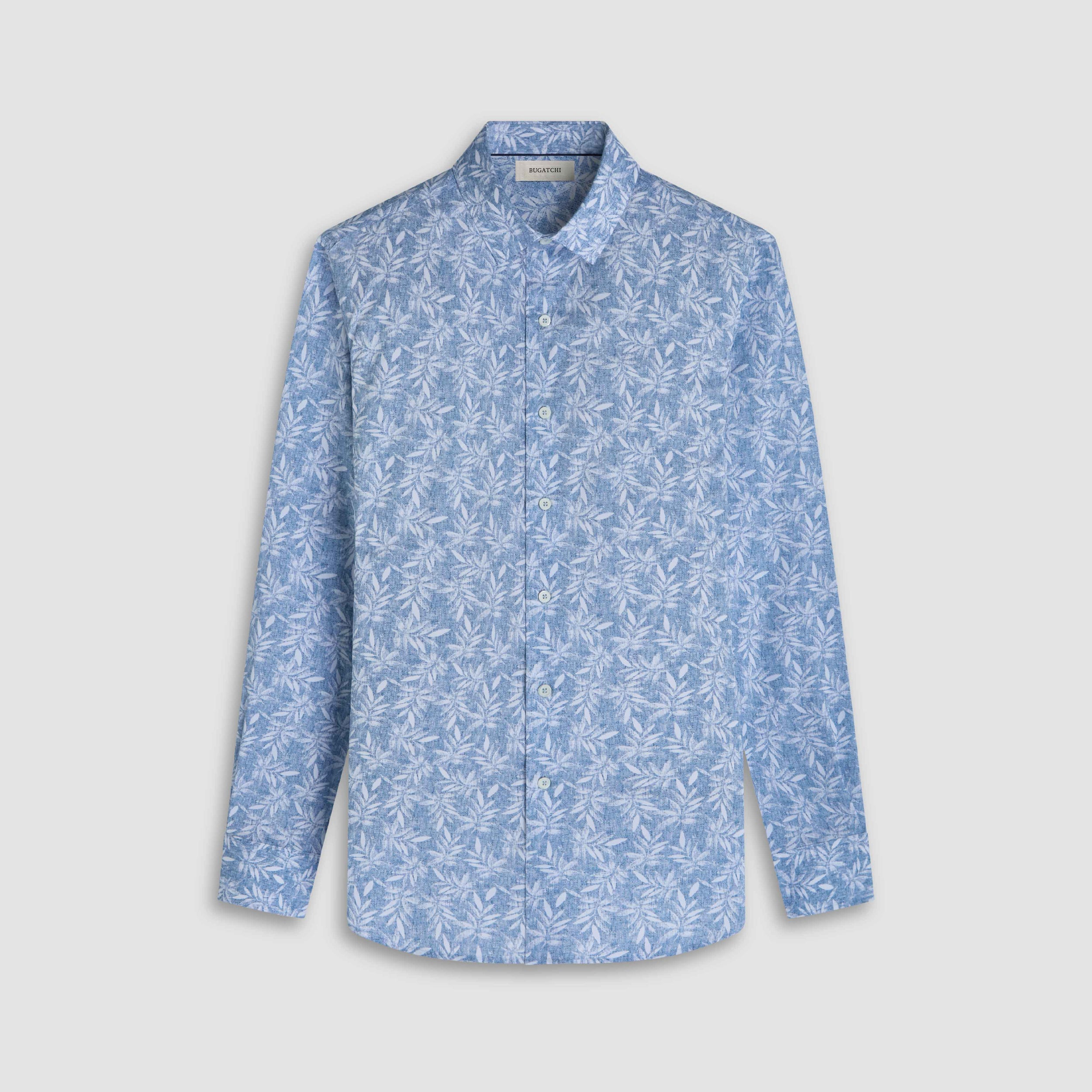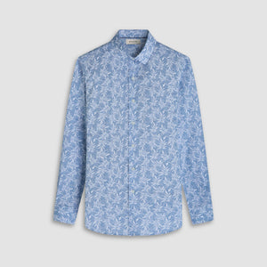The Julian long-sleeve shirt in leaf print is crafted from premium 100% cotton. It features a point collar, mother-of-pearl buttons, a curved hem that looks great tucked or untucked, and adjustable notched cuffs that also convert for cufflinks. A refined, all-occasion shirt.