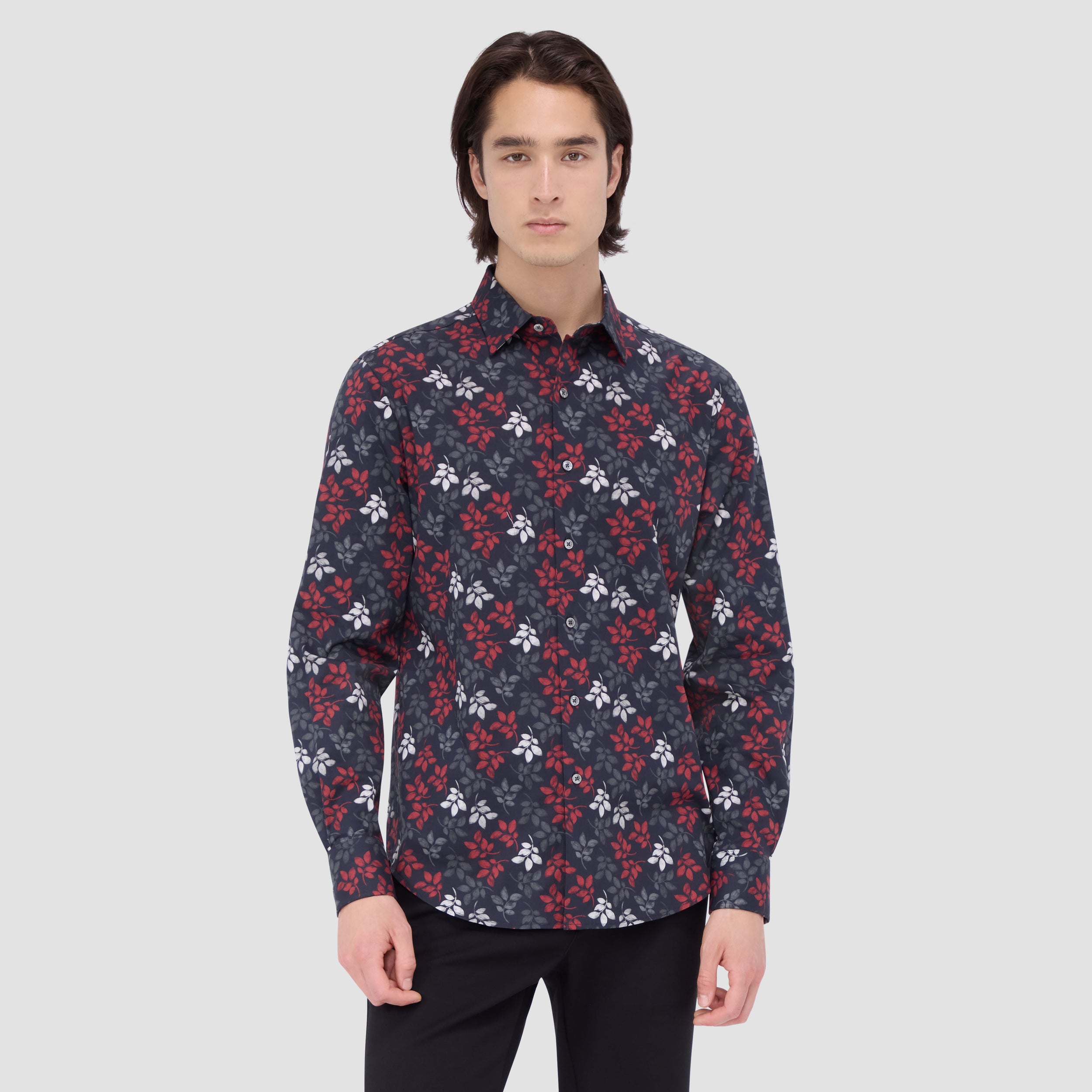 The Julian shirt in COMFORT STRETCH cotton is a contemporary and versatile shirt with optimal comfort and freedom of movement properties. Its timeless and sleek silhouette features long sleeves, a classic point collar, adjustable notched cuffs, a curved hem, and a nature-inspired leaf print. Wear it tucked or untucked with chinos or trousers for a smart-casual vibe, or with jeans for a relaxed look.