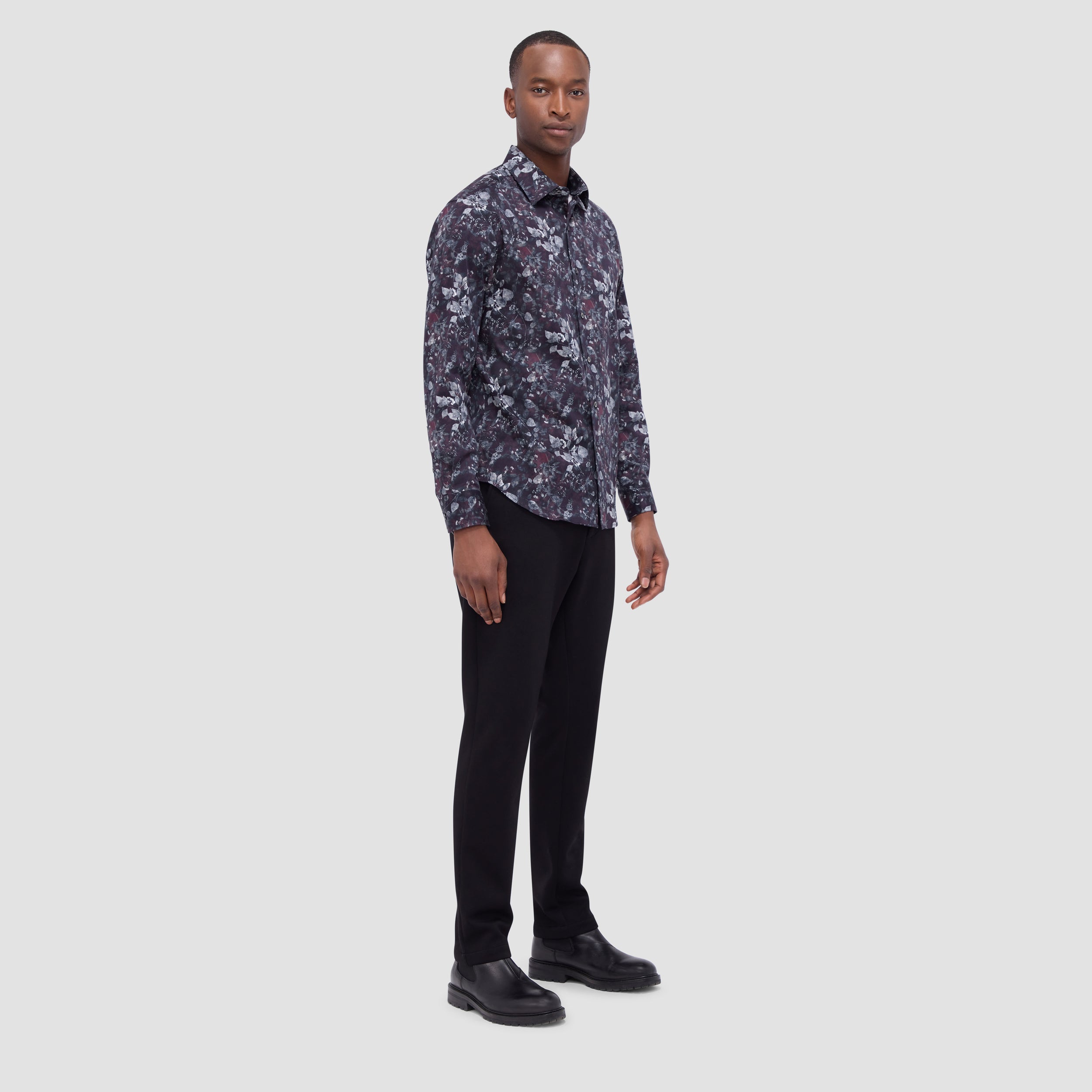 The Julian shirt in COMFORT STRETCH cotton is a contemporary and versatile shirt with optimal comfort and freedom of movement properties. Its timeless and sleek silhouette features long sleeves, a classic point collar, adjustable notched cuffs, a curved hem, and a nature-inspired leaf print. Wear it tucked or untucked with chinos or trousers for a smart-casual vibe, or with jeans for a relaxed look.