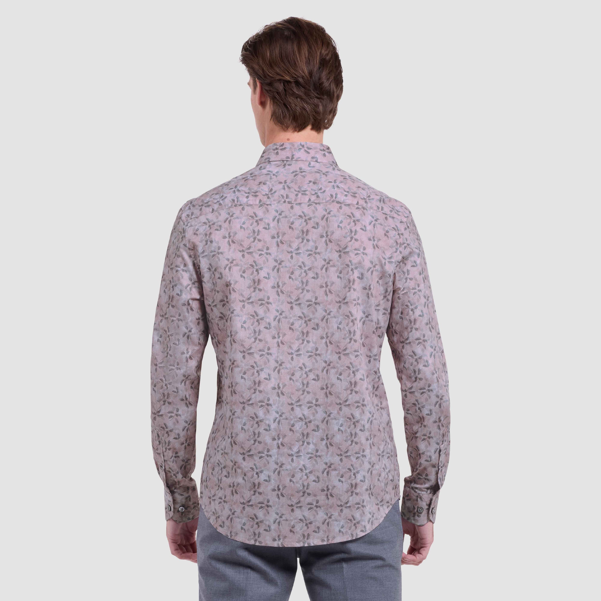 The Julian long-sleeve shirt in leaf print is crafted from premium 100% cotton. It features a point collar, mother-of-pearl buttons, a curved hem that looks great tucked or untucked, and adjustable notched cuffs that also convert for cufflinks. A refined, all-occasion shirt.