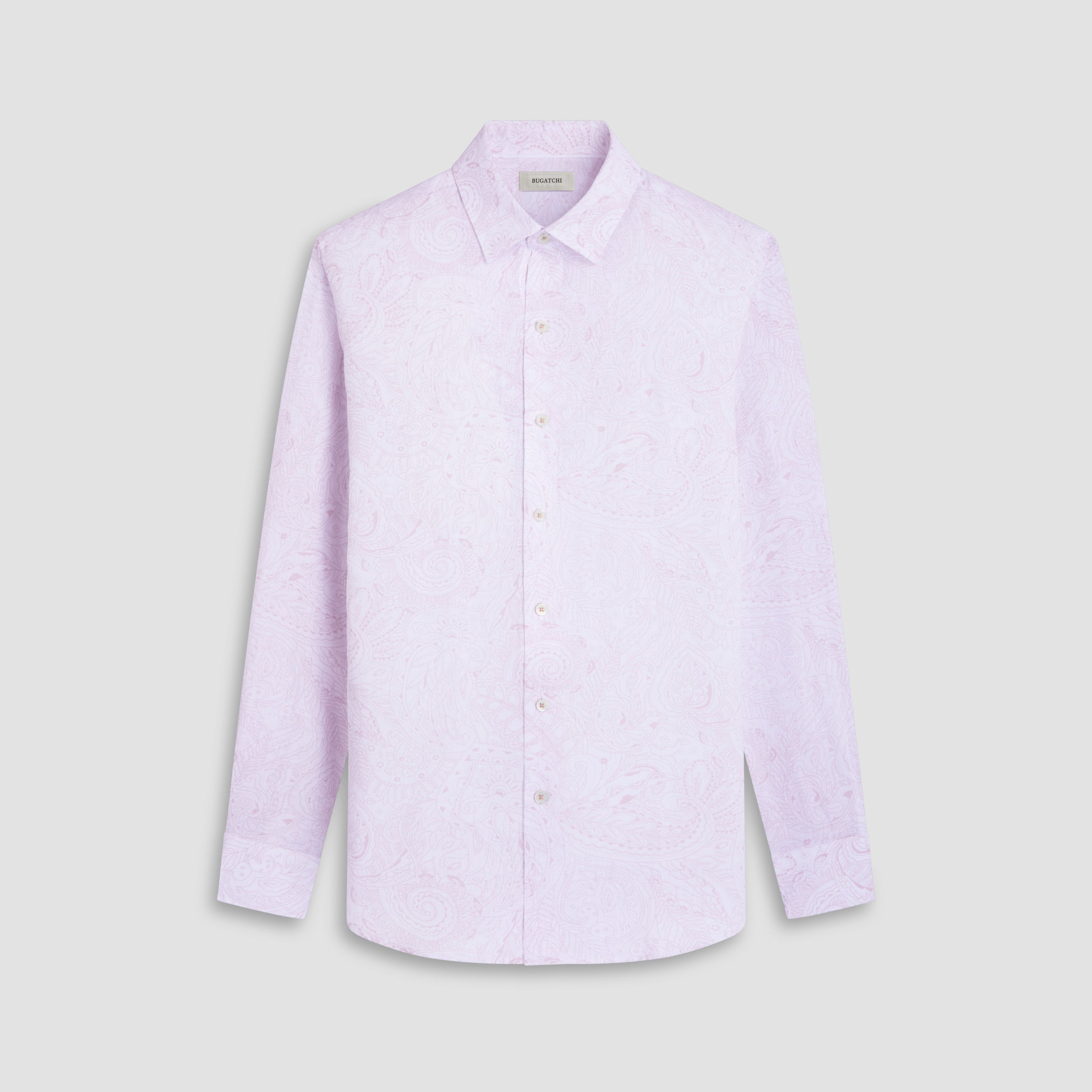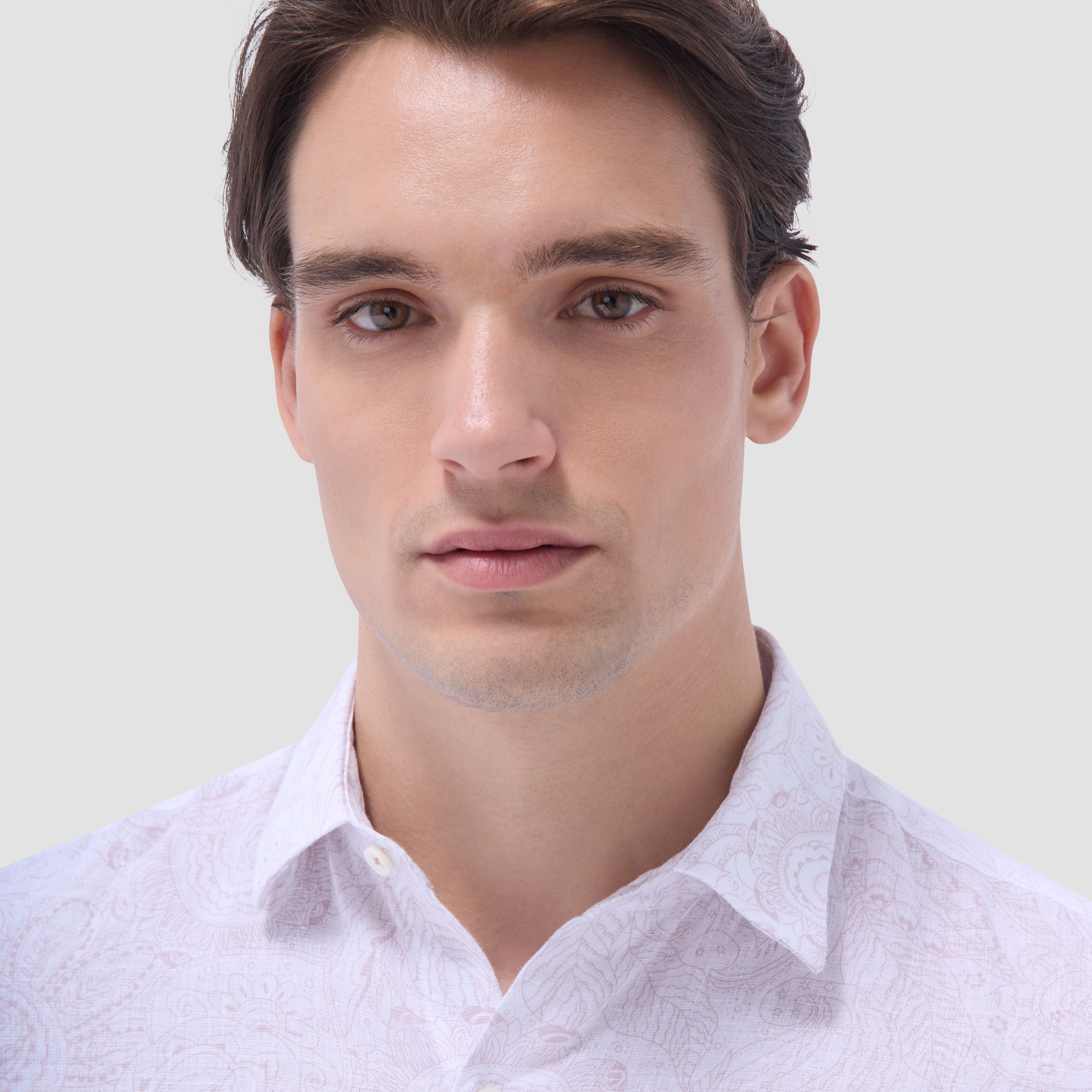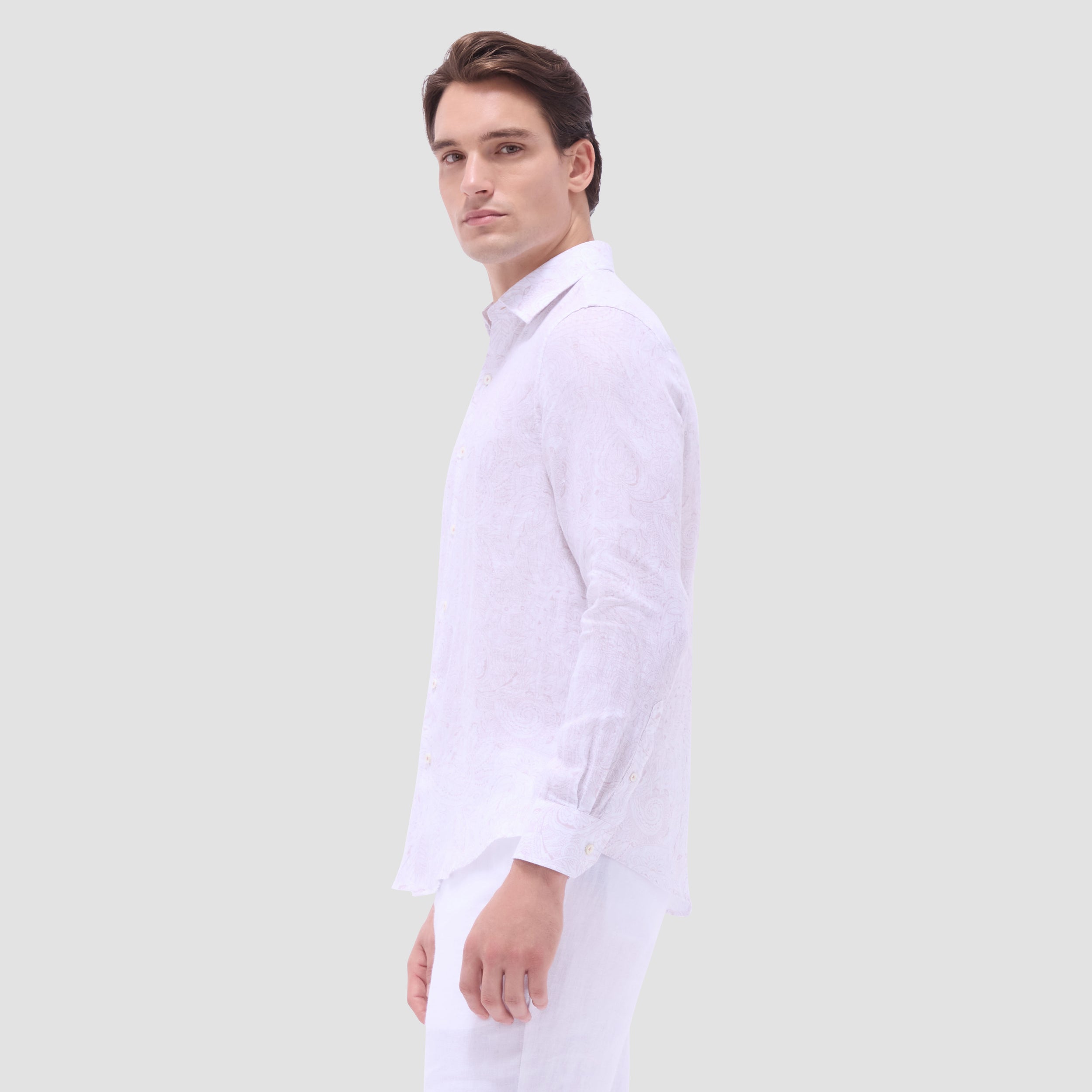 The Julian long-sleeve shirt in paisley print is crafted from 100% Italian linen fabric. It features a point collar, a curved hem that can be worn tucked or untucked, mother-of-pearl buttons, and notched cuffs adjustable for a custom fit-wear them snug or loose. The natural texture of linen adds a laid-back, effortless charm to any outfit.