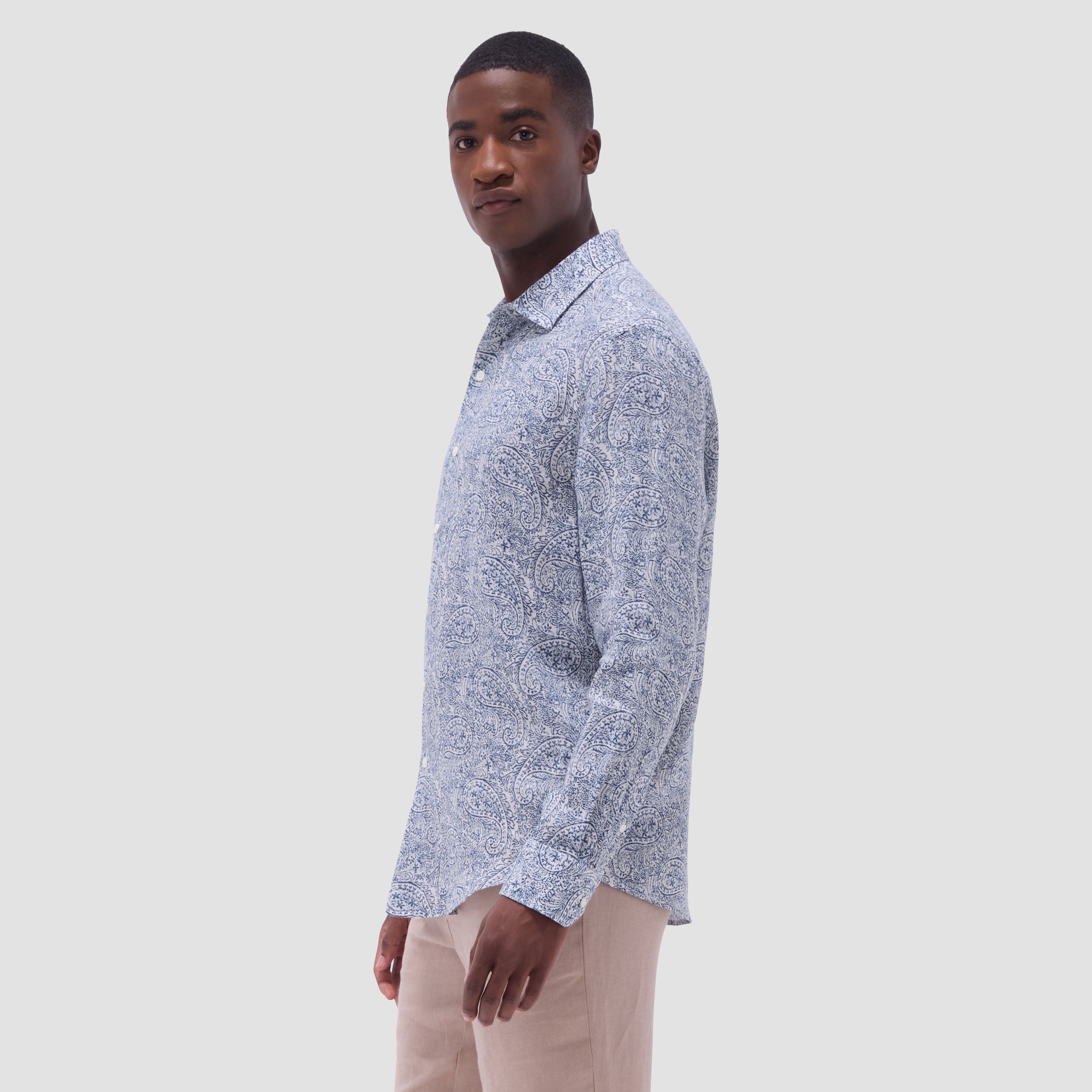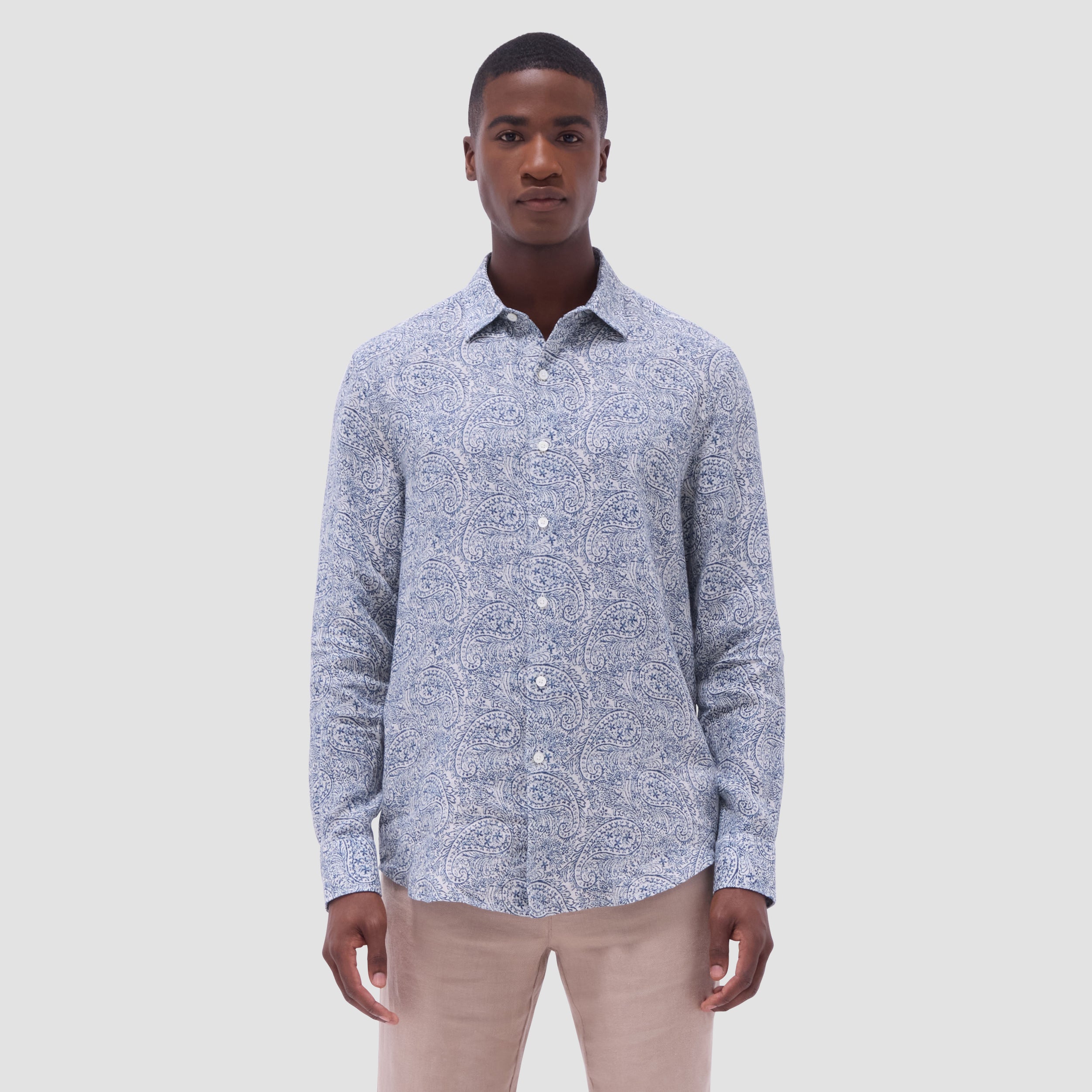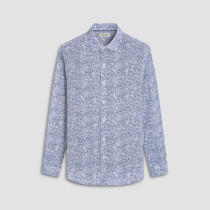 The Julian long-sleeve shirt in paisley print is crafted from 100% Italian linen fabric. It features a point collar, a curved hem that can be worn tucked or untucked, mother-of-pearl buttons, and notched cuffs adjustable for a custom fit-wear them snug or loose. The natural texture of linen adds a laid-back, effortless charm to any outfit.