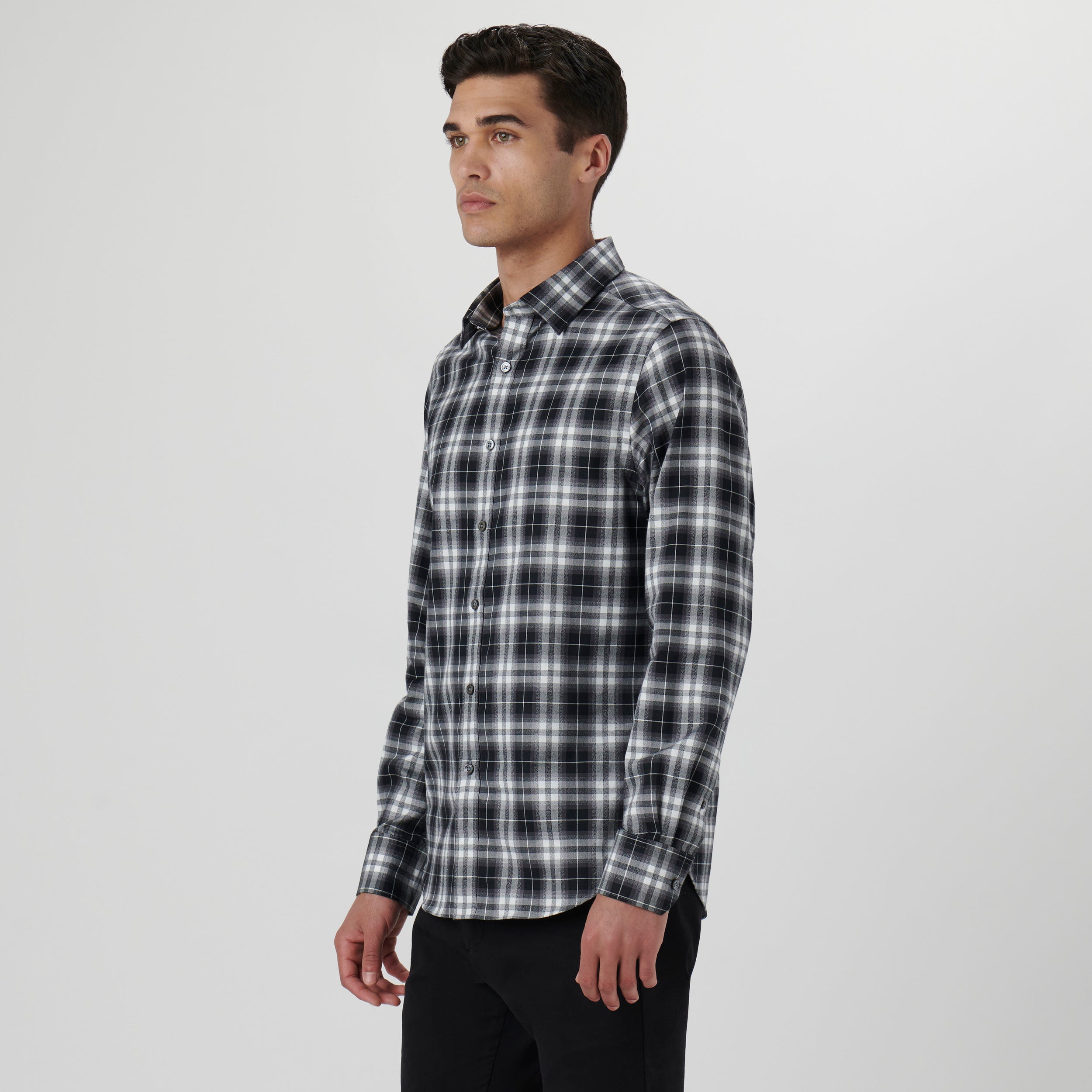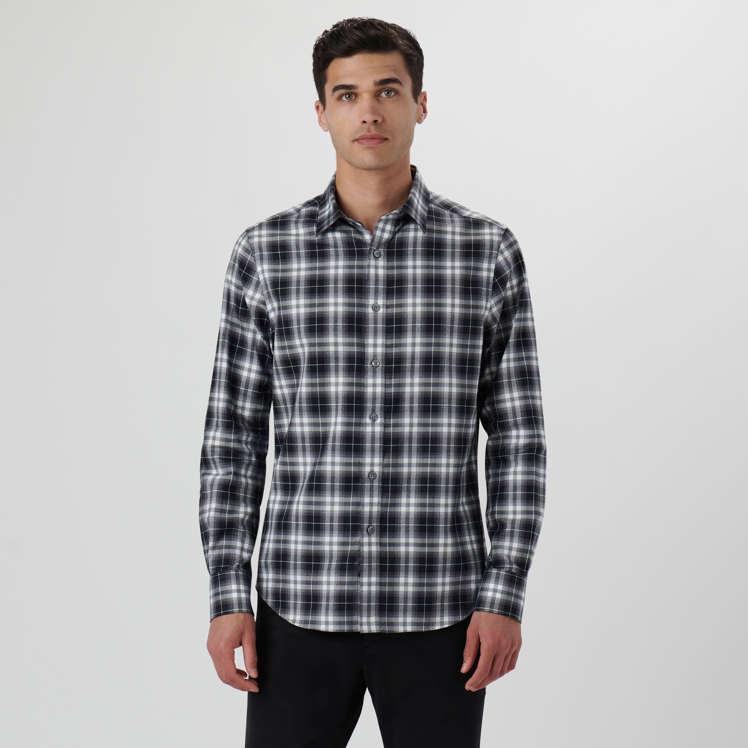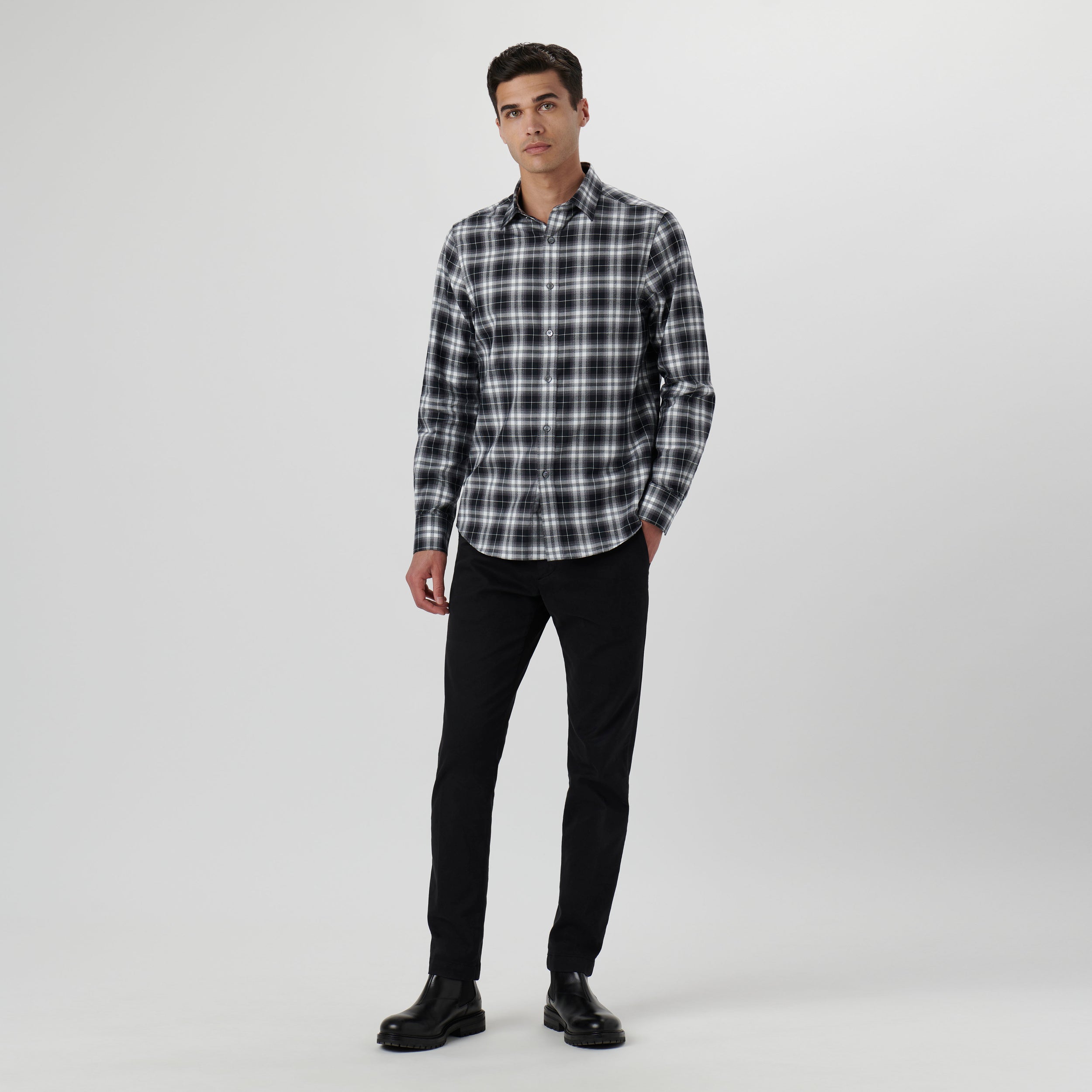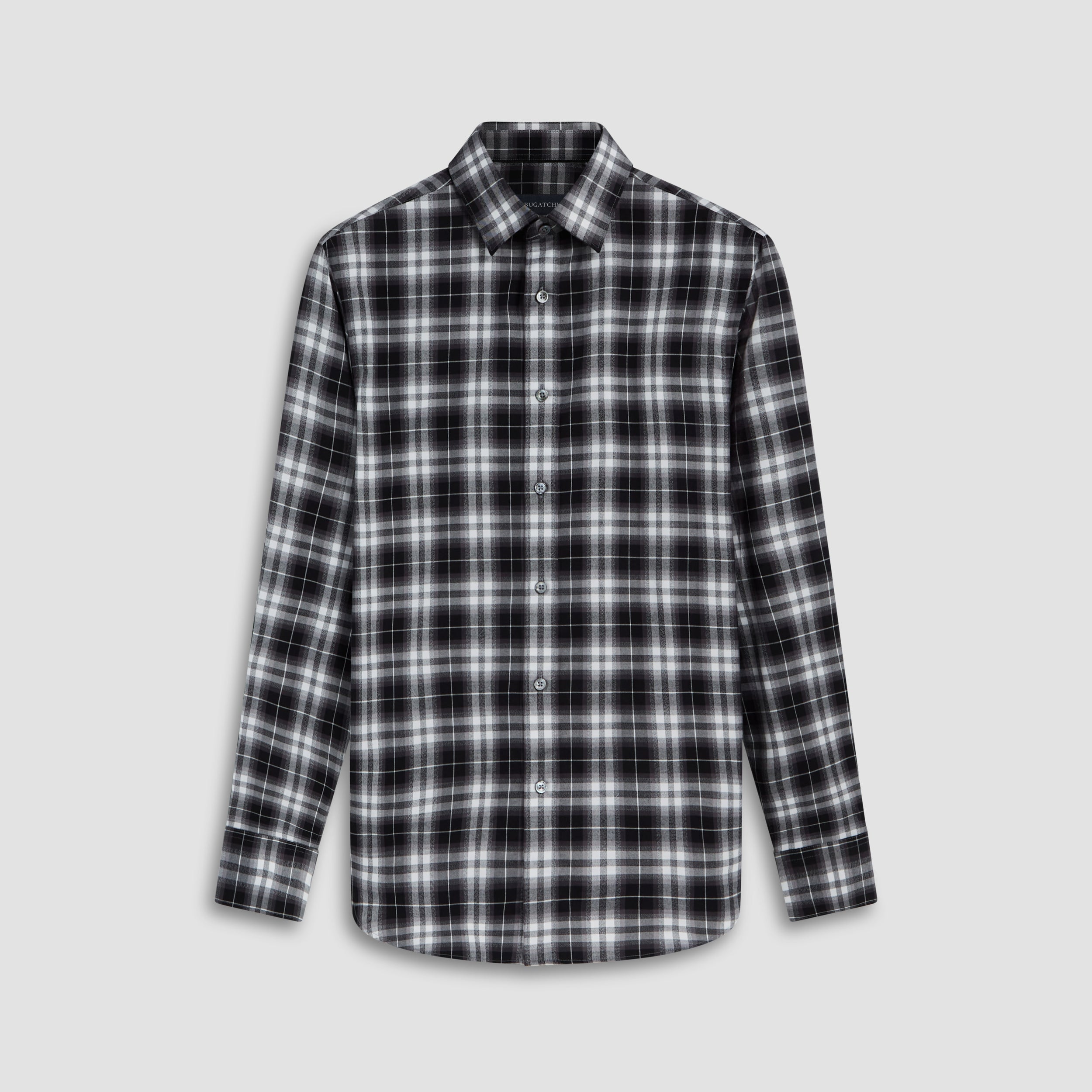 Julian long-sleeved shirt in 100% cotton plaid check with point collar, adjustable notched cuffs and curved hem.