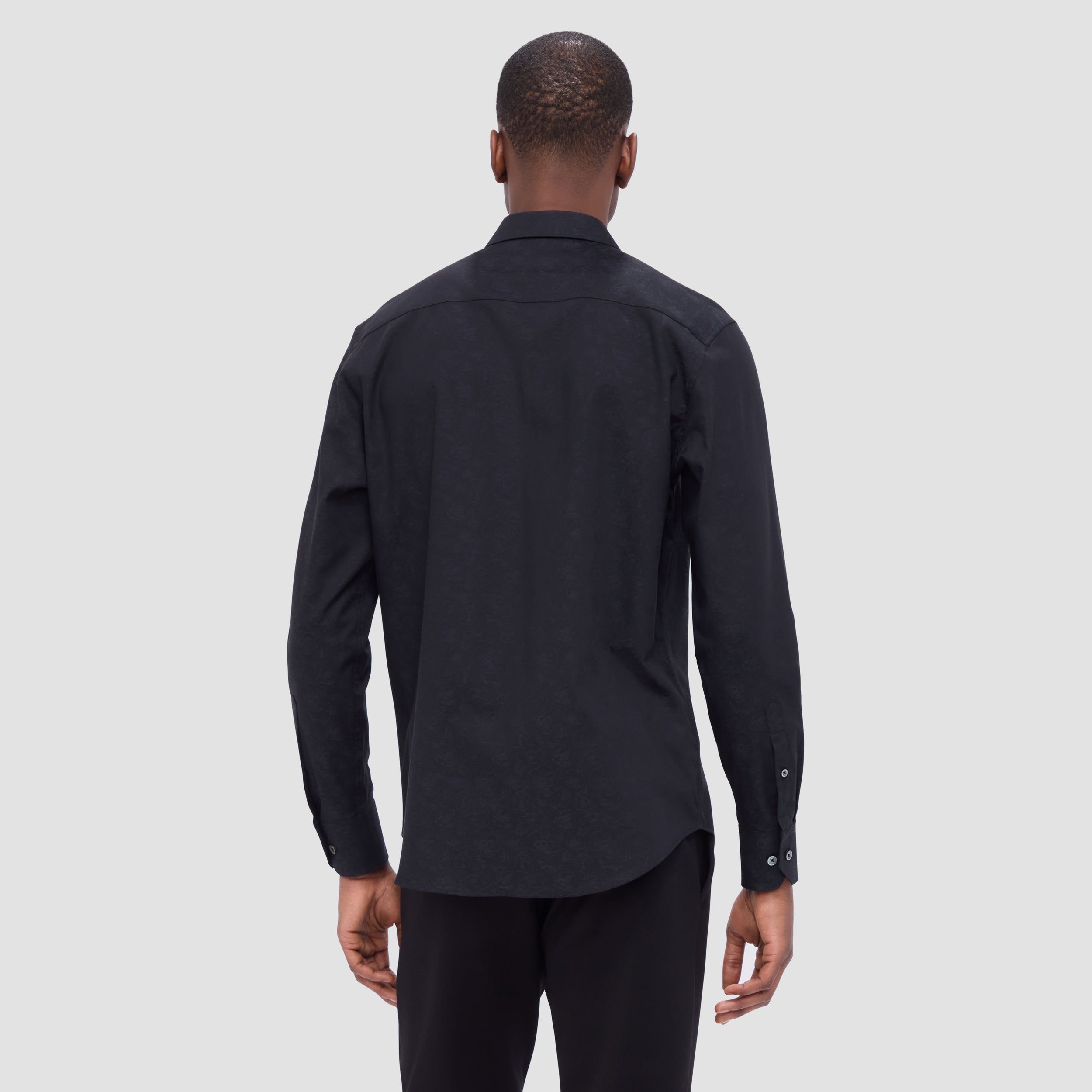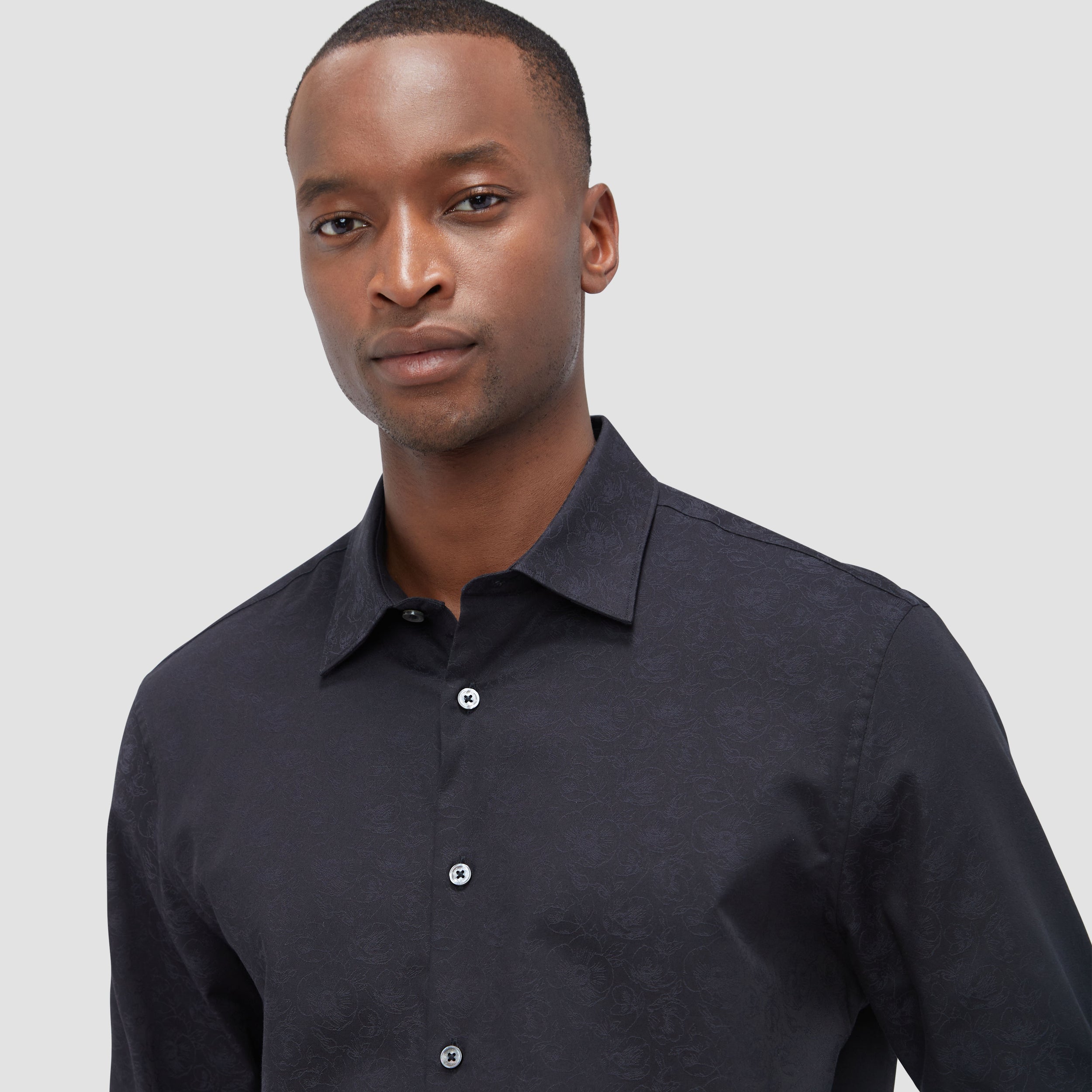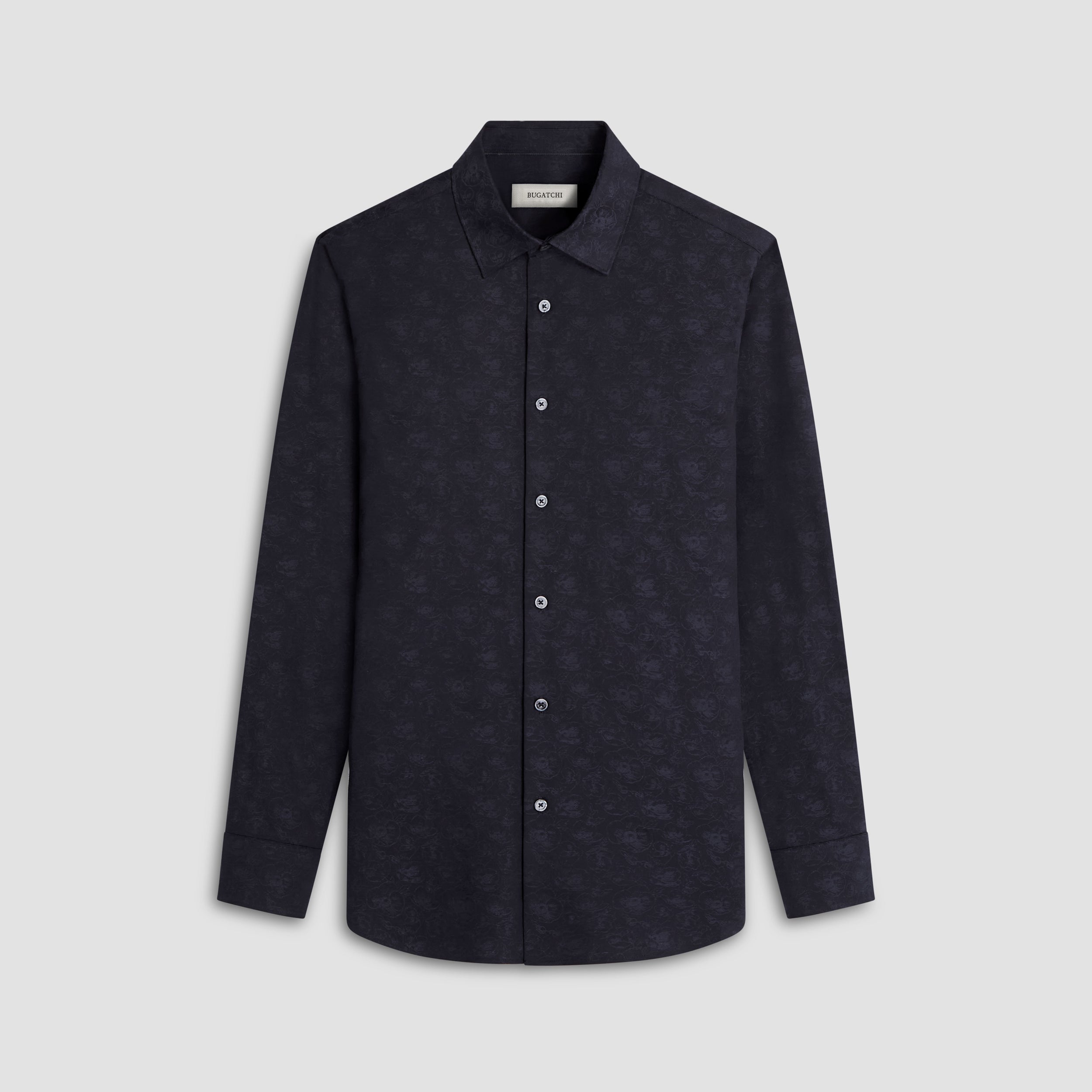 The Julian shirt in COMFORT STRETCH cotton jacquard is a contemporary and versatile shirt with optimal comfort and freedom of movement properties. Its timeless and sleek silhouette features long sleeves, a classic point collar, adjustable notched cuffs, a curved hem, and a tonal jacquard pattern. Wear it tucked or untucked with chinos and jeans for a smart-casual vibe, or with tailored trousers and a blazer for a formal occasion.