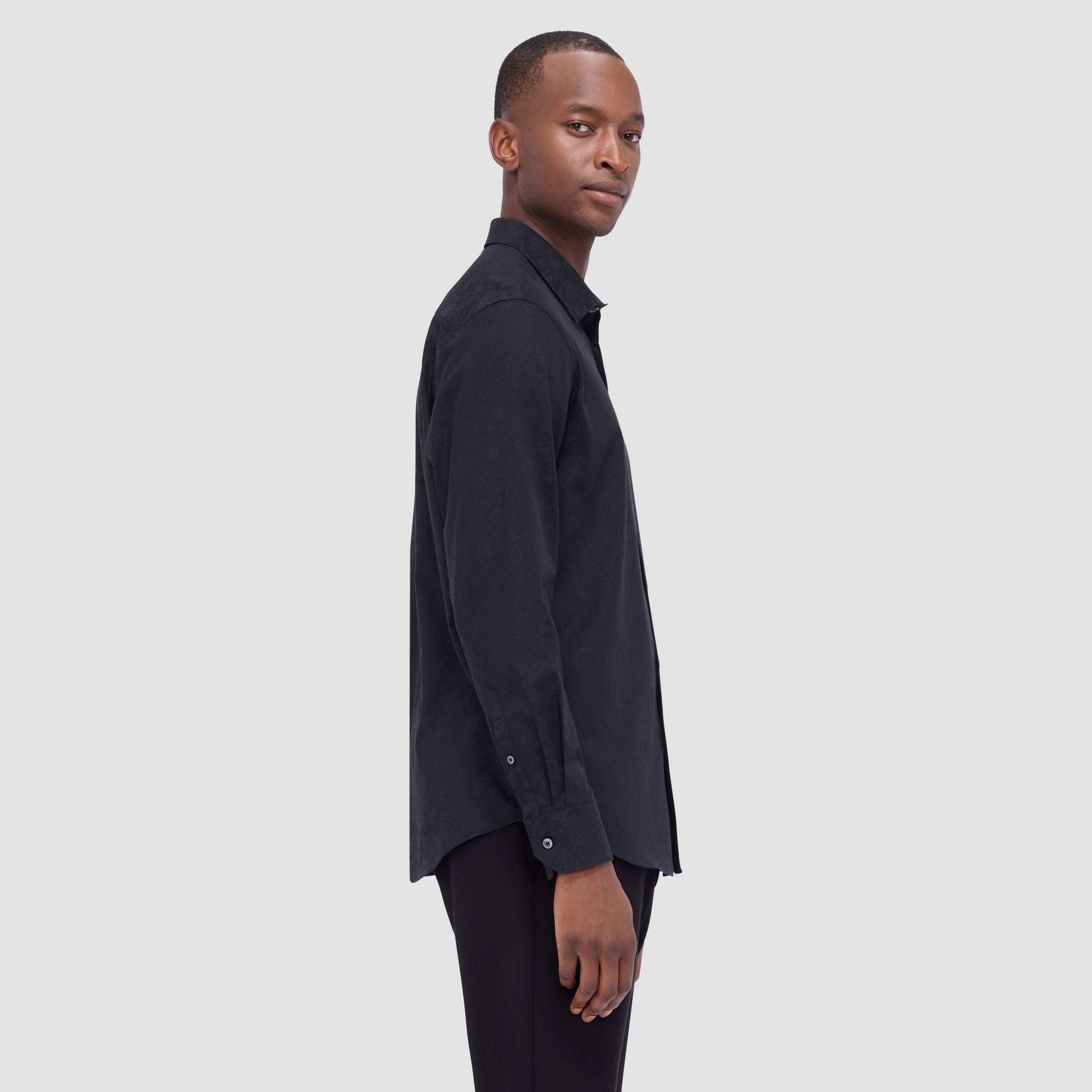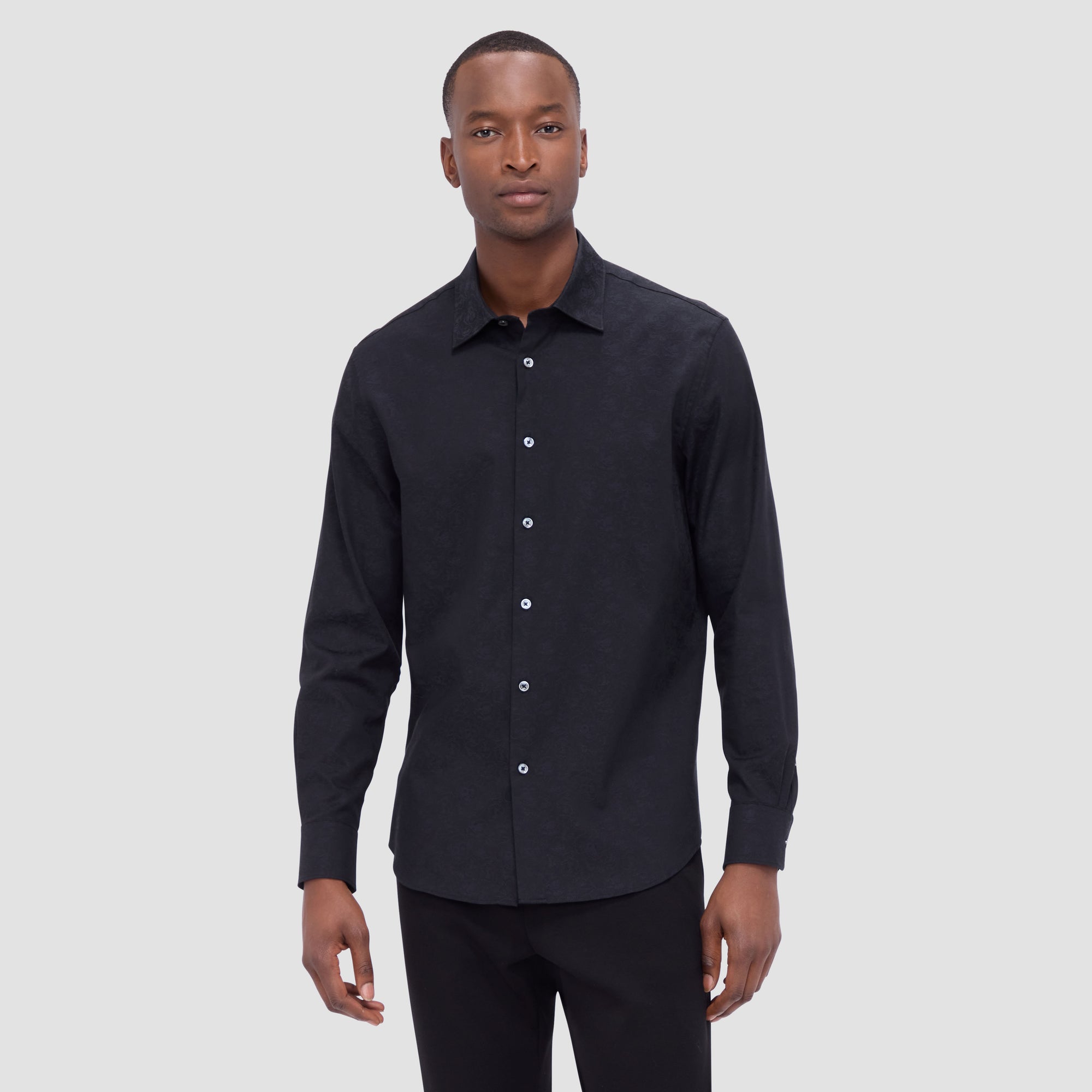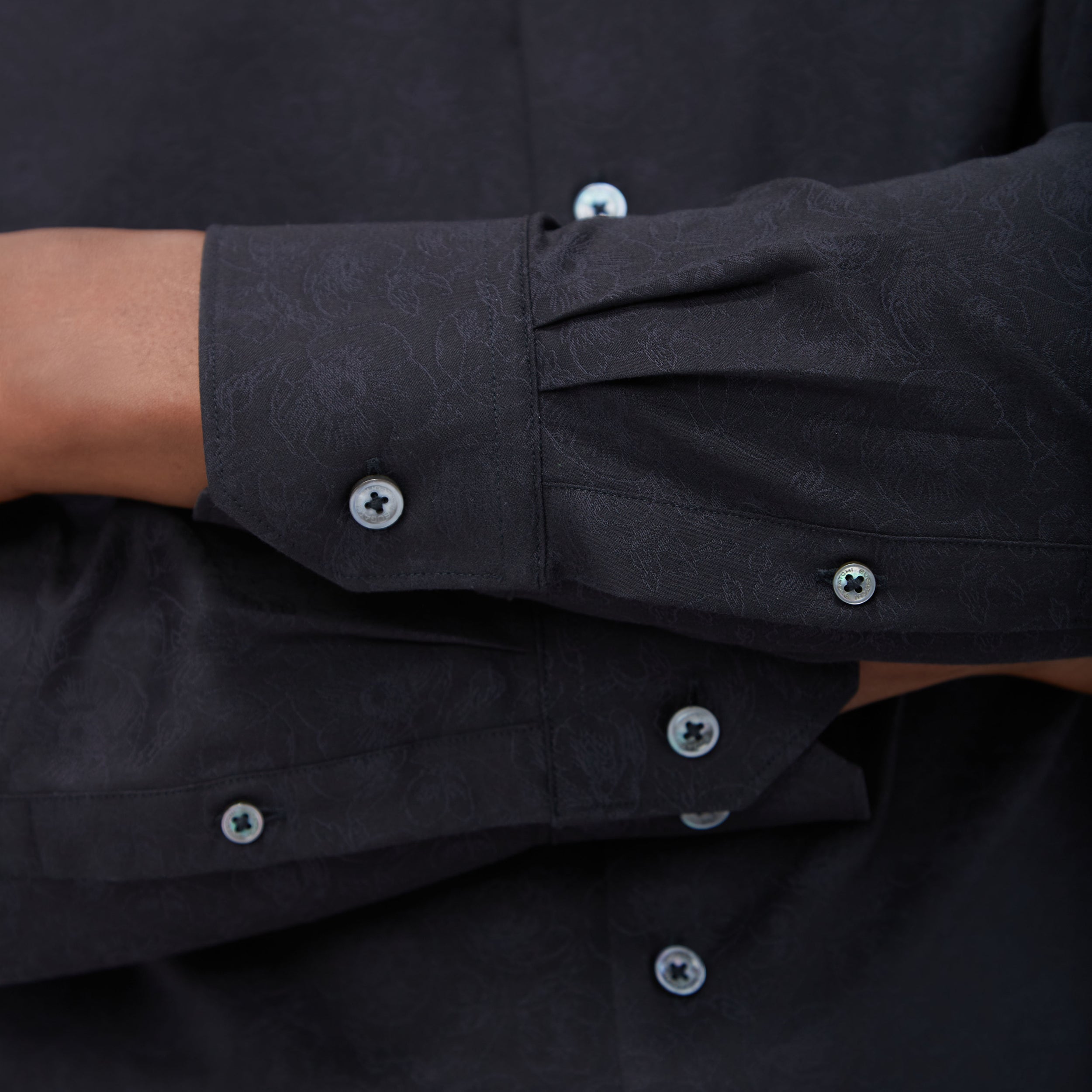 The Julian shirt in COMFORT STRETCH cotton jacquard is a contemporary and versatile shirt with optimal comfort and freedom of movement properties. Its timeless and sleek silhouette features long sleeves, a classic point collar, adjustable notched cuffs, a curved hem, and a tonal jacquard pattern. Wear it tucked or untucked with chinos and jeans for a smart-casual vibe, or with tailored trousers and a blazer for a formal occasion.