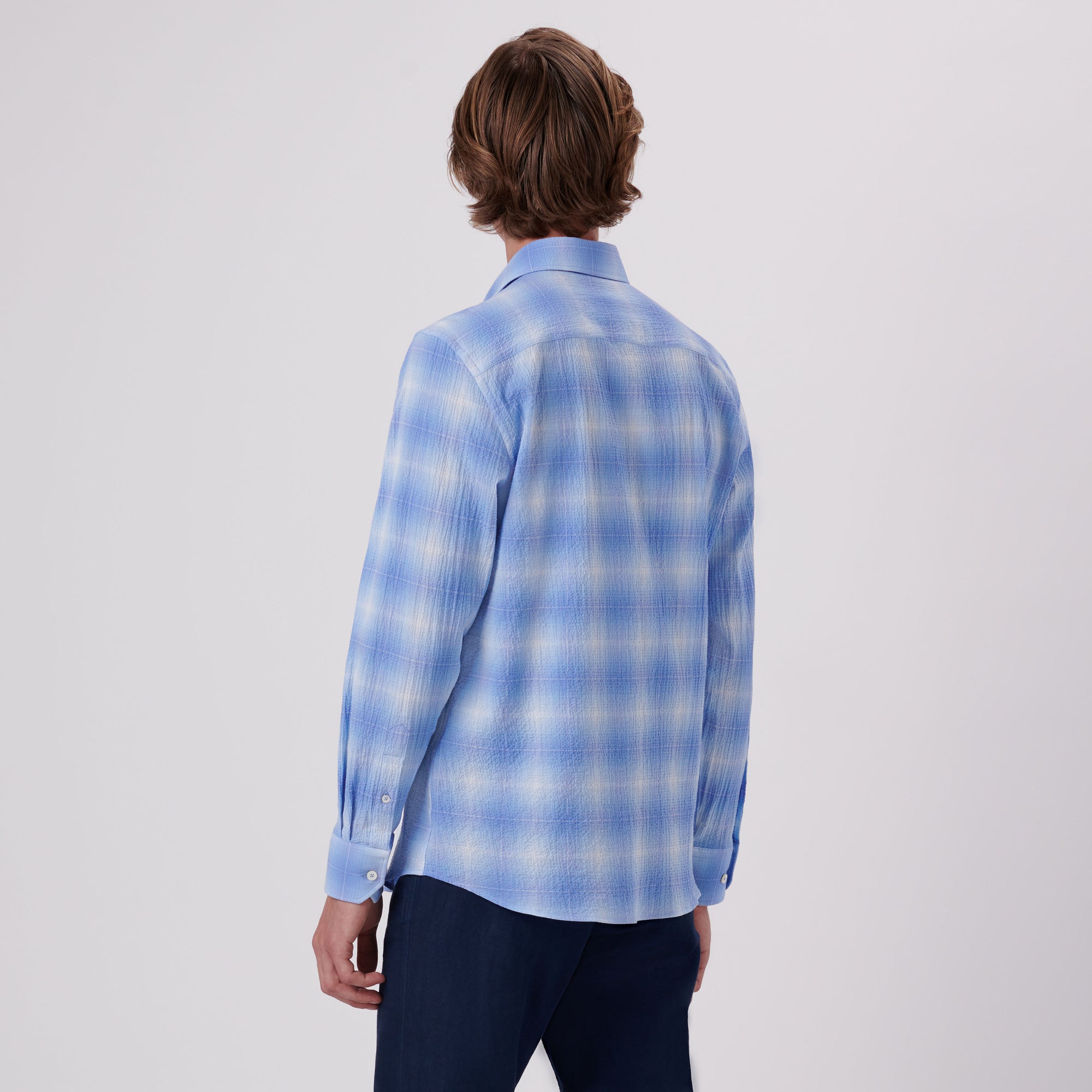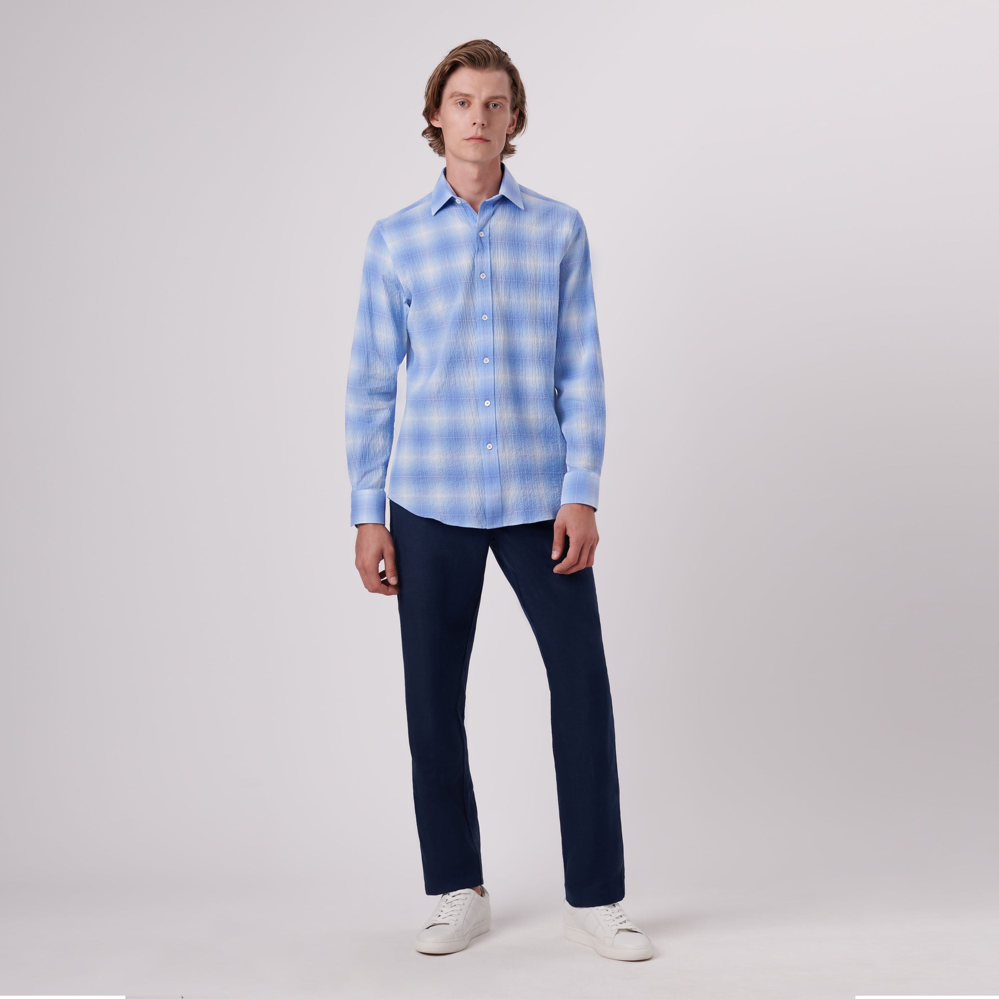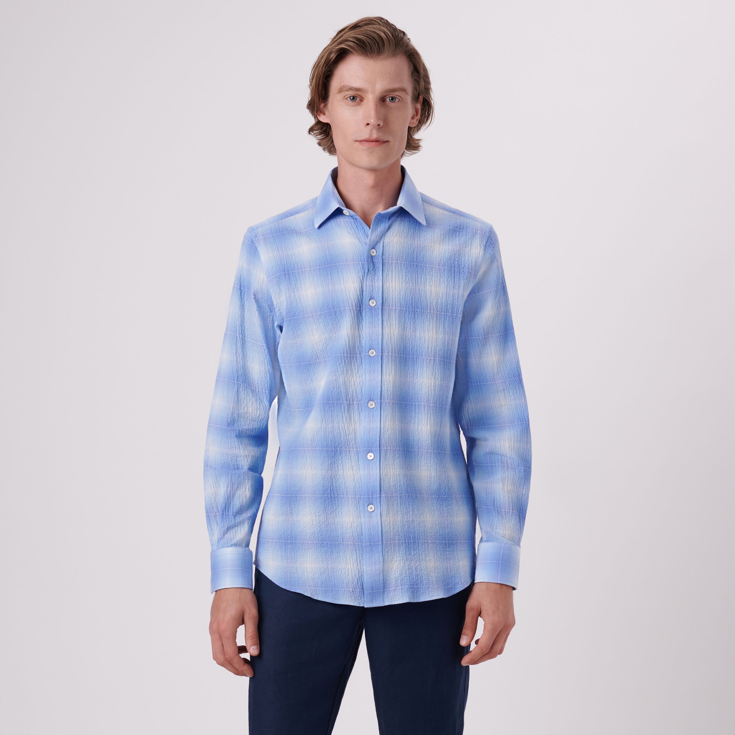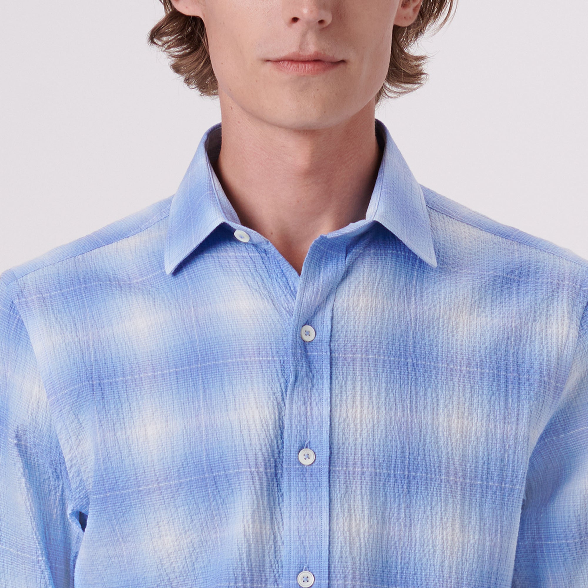 Julian windowpane check long-sleeved shirt in comfort stretch cotton with point collar, adjustable notched cuffs, genuine shell buttons and a curved hemline.
