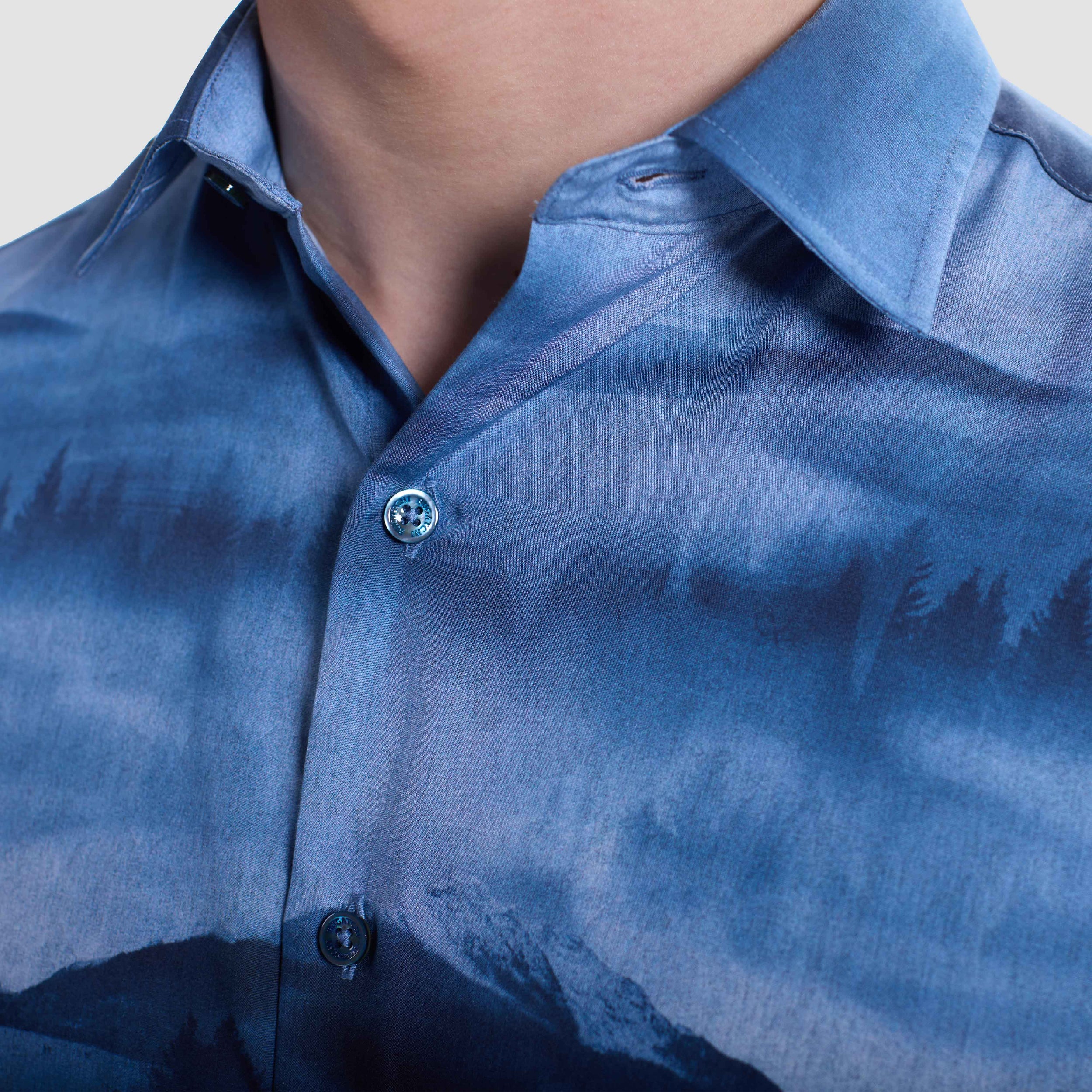The Julian long-sleeve shirt in winter landscape print is crafted from 100% Italian lyocell, a premium eco-friendly fabric with soft drape and natural breathability. It features a point collar, mother-of-pearl buttons, a curved hem that looks great tucked or untucked, and adjustable notched cuffs that also convert for cufflinks. A refined, all-occasion shirt.