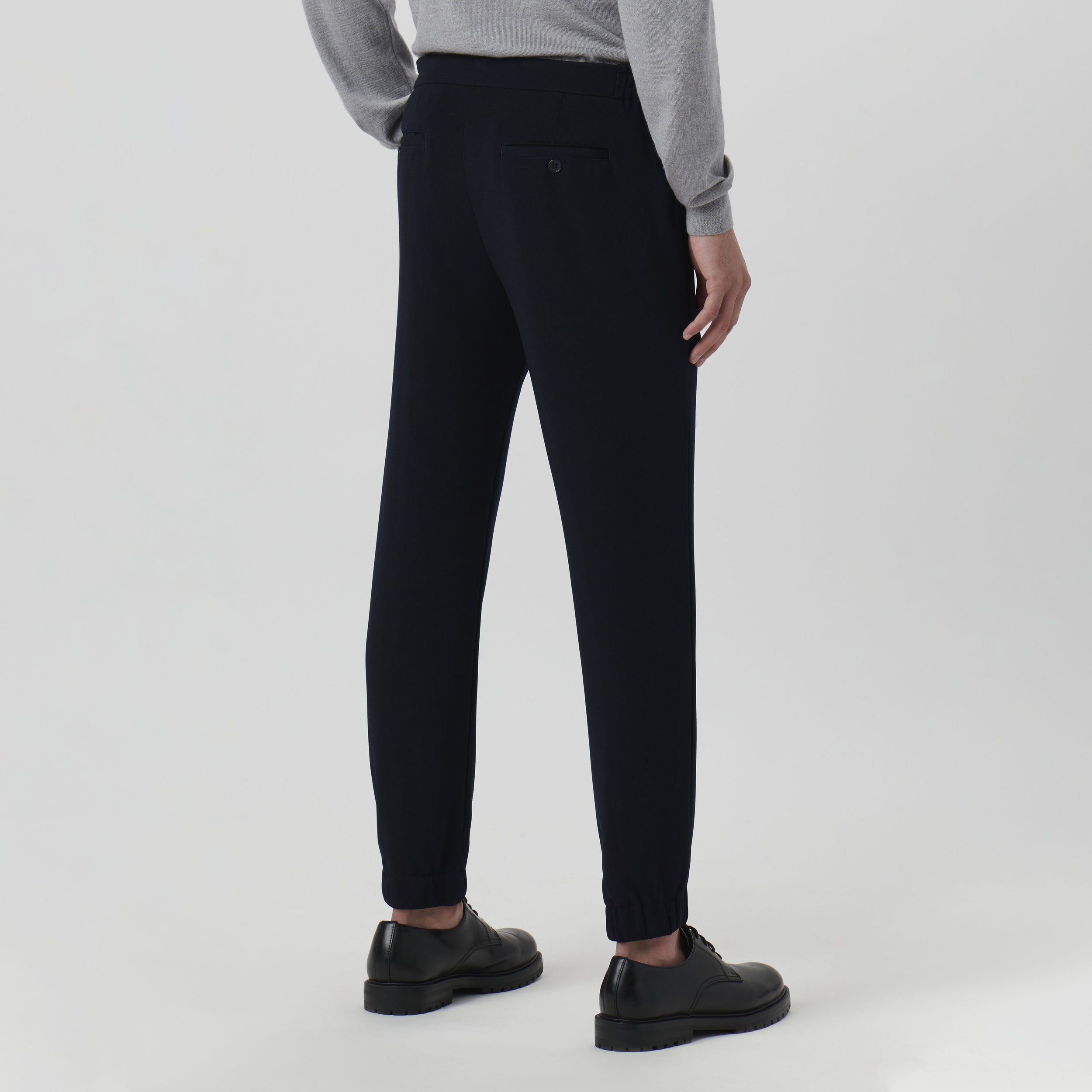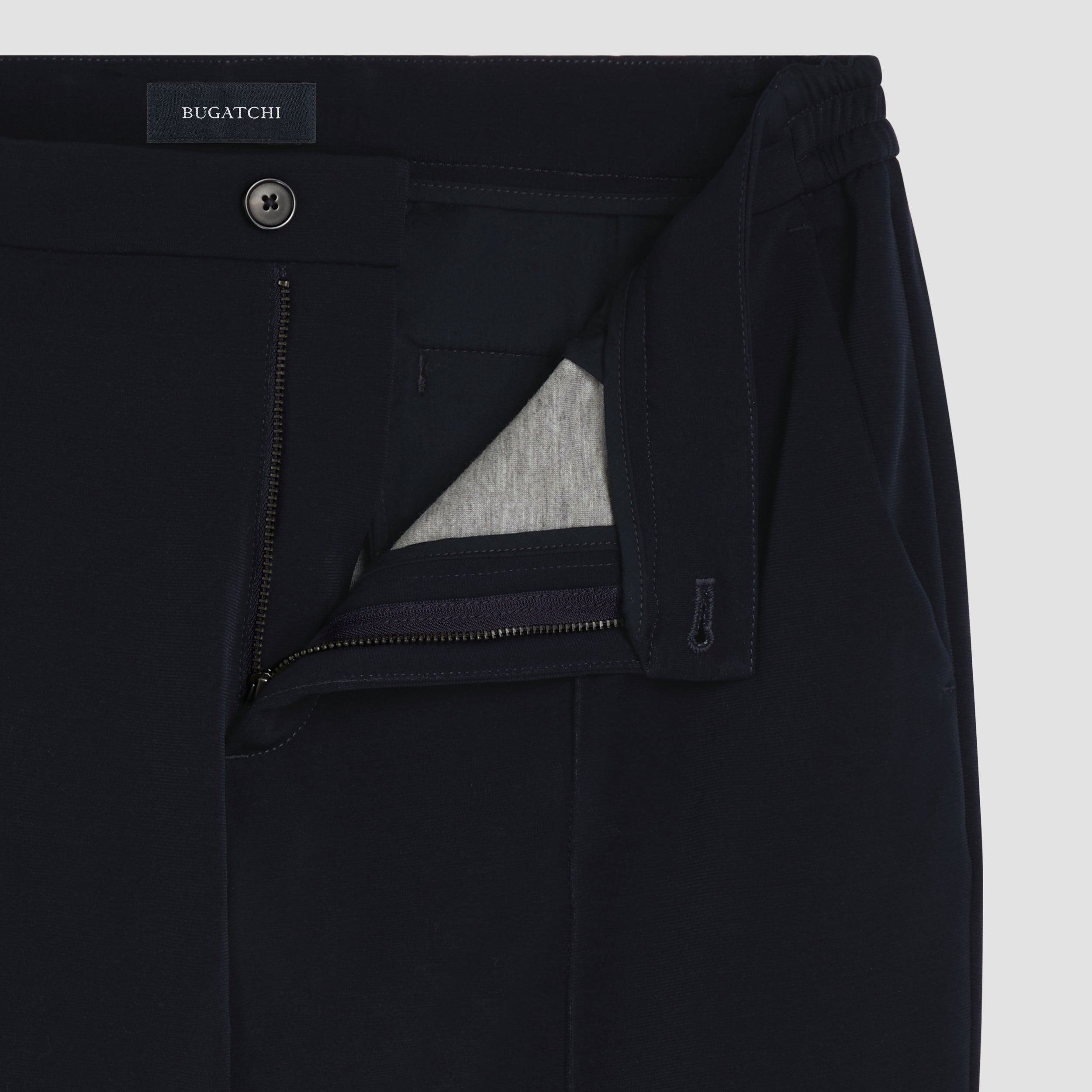Chino pants in stretch double knit fabric with comfort side elasticized waistband, fly and button closure and slanted side pocket and buttoned back pockets.