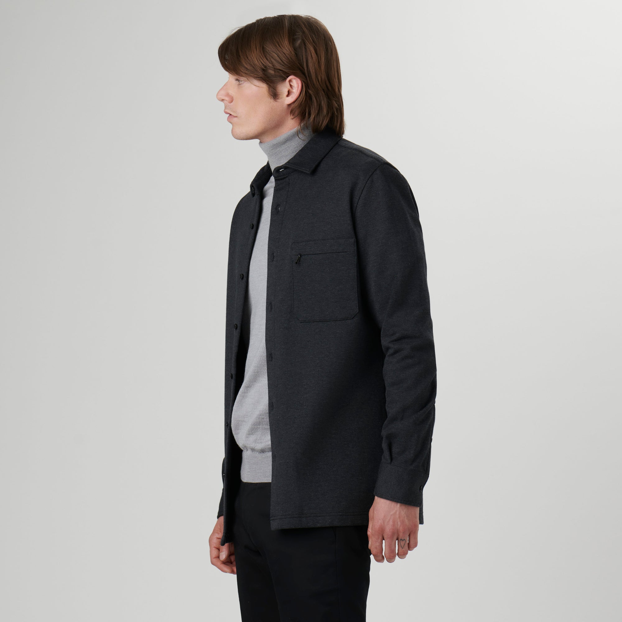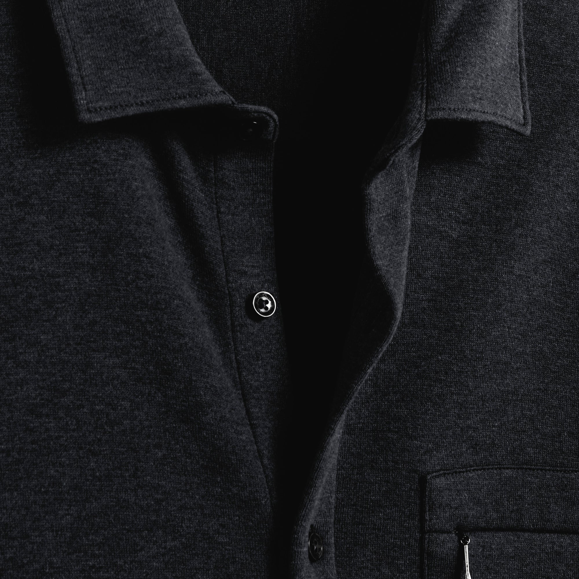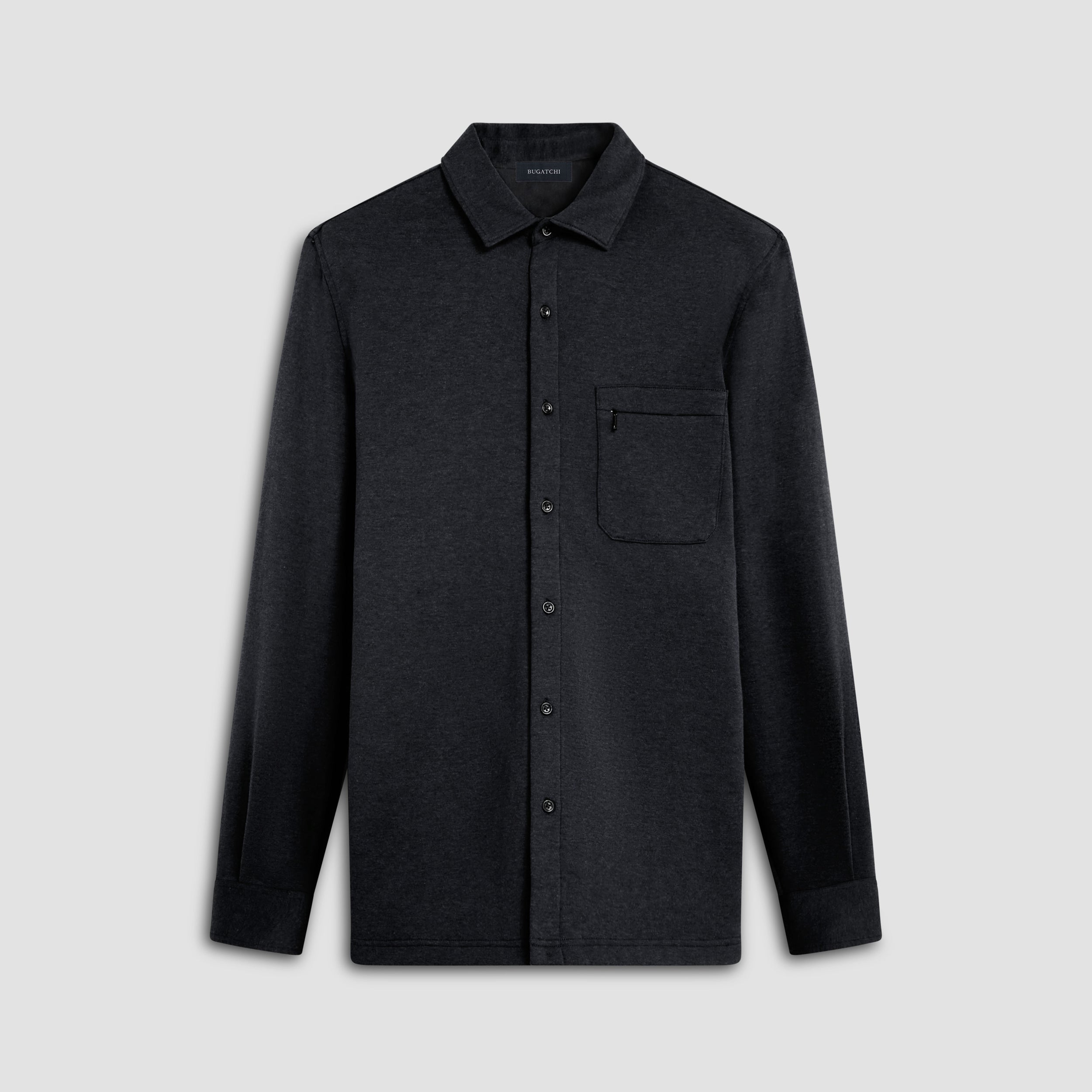 Solid knit shirt jacket in cotton with full button closure and zippered chest pocket.