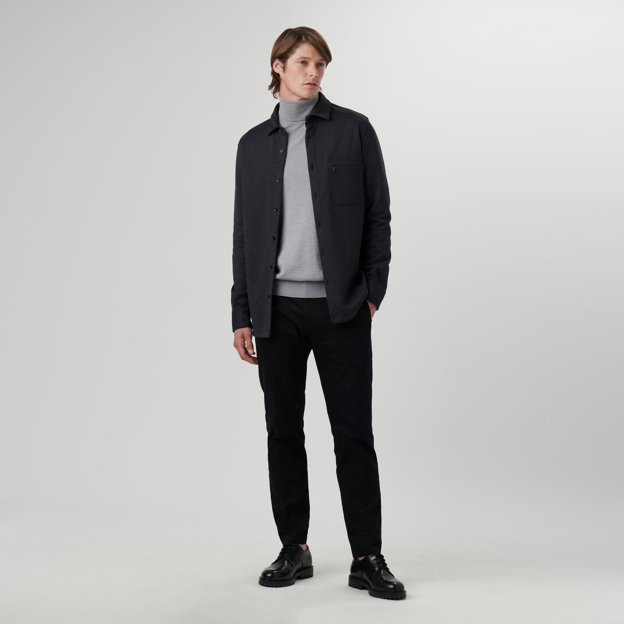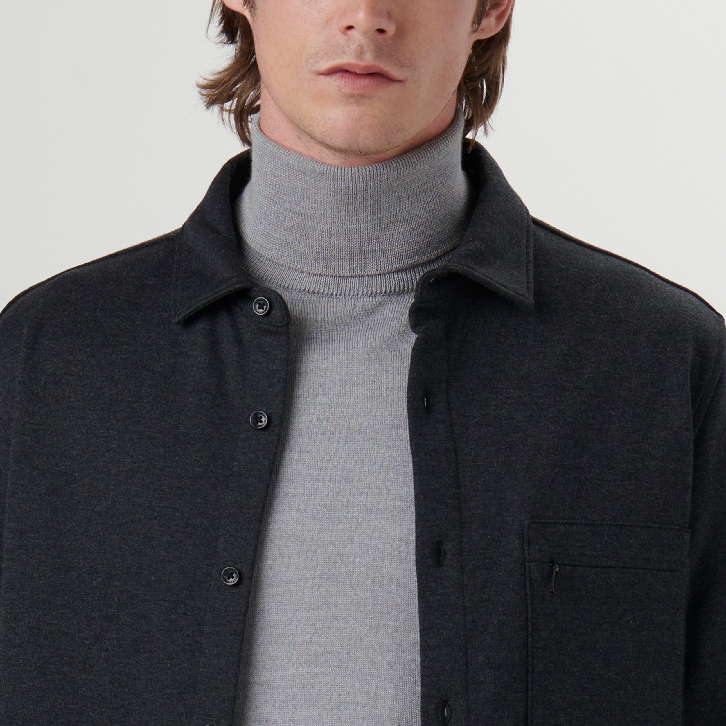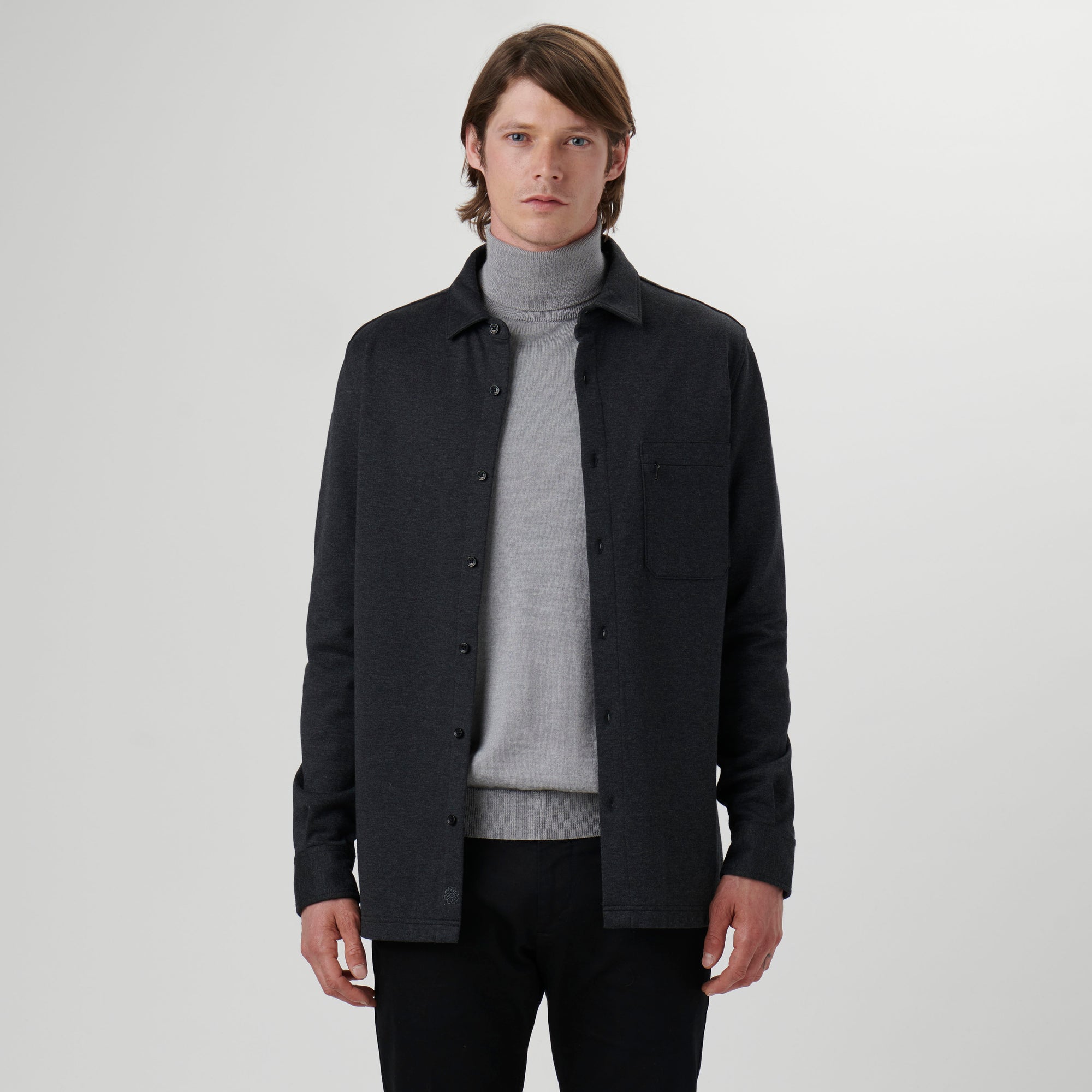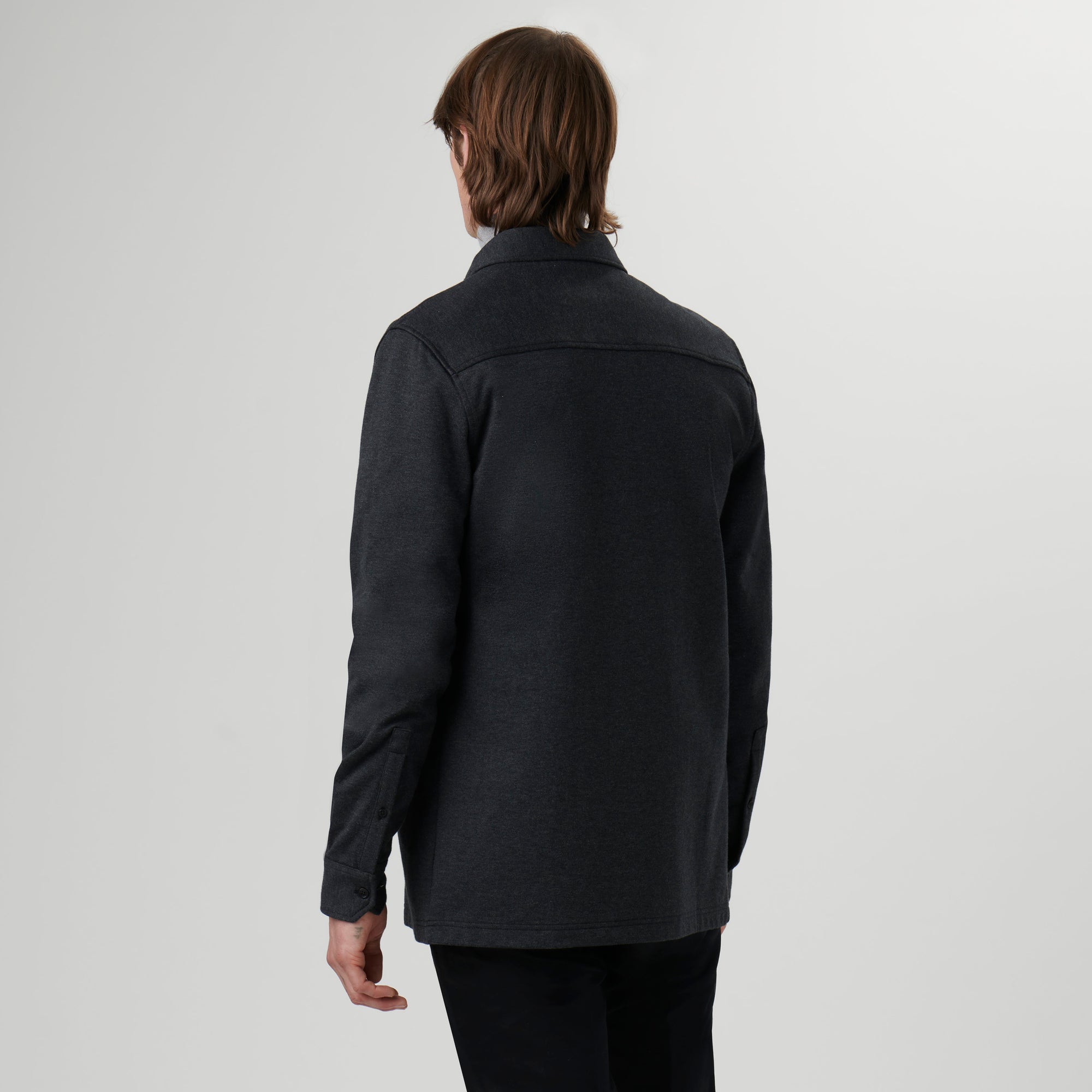Solid knit shirt jacket in cotton with full button closure and zippered chest pocket.