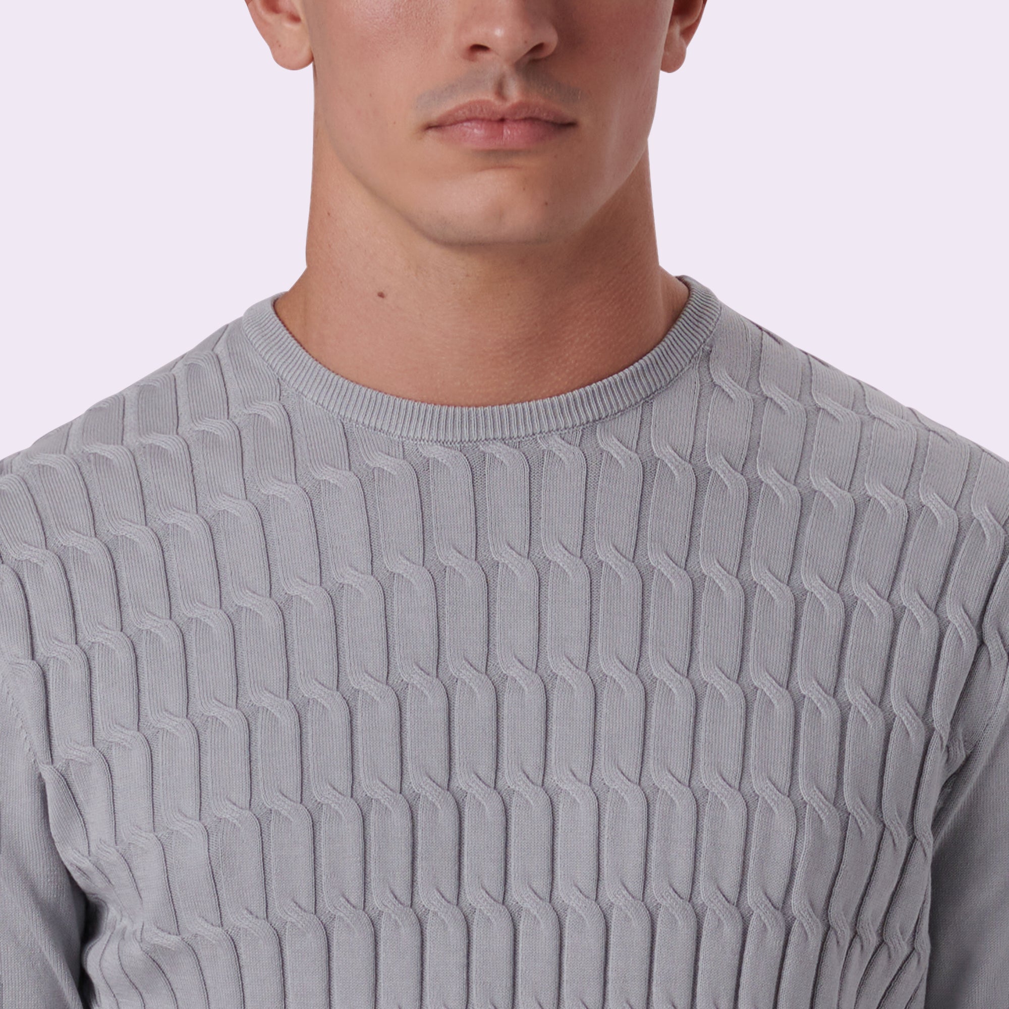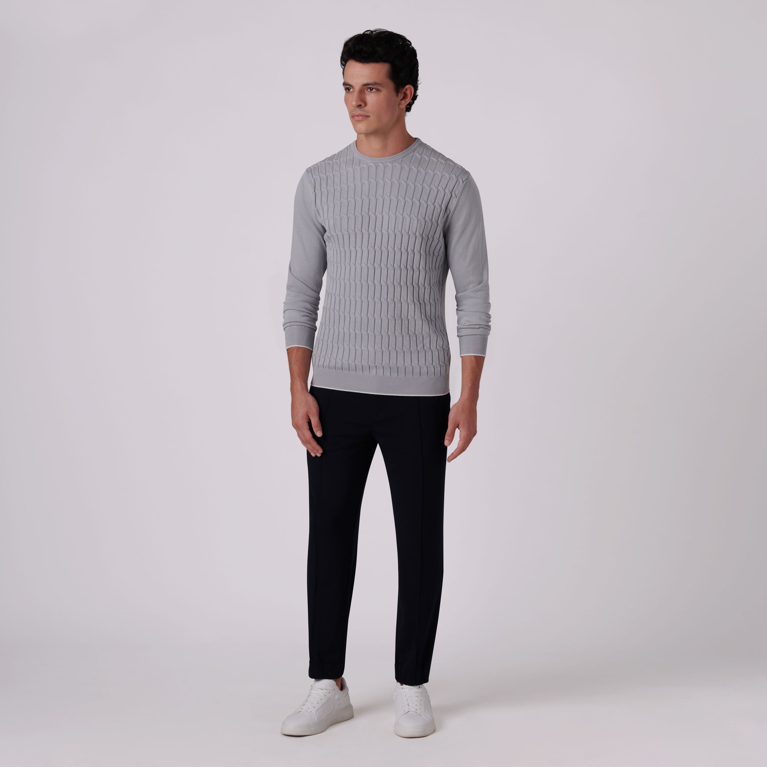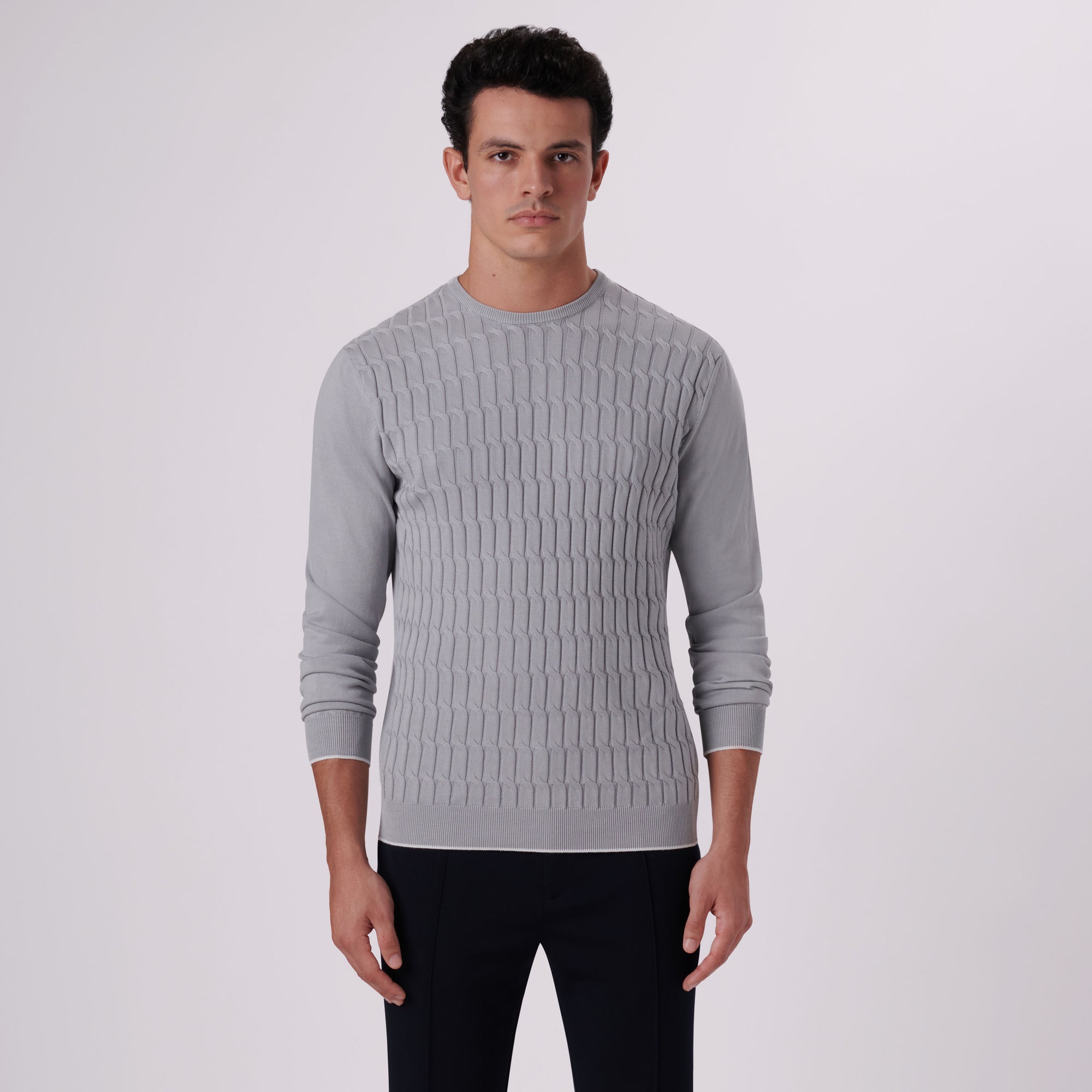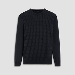 Knit stitch long-sleeved crew neck sweater in 100% cotton with solid rib knit collar, cuffs and waistband. Made in Italy.