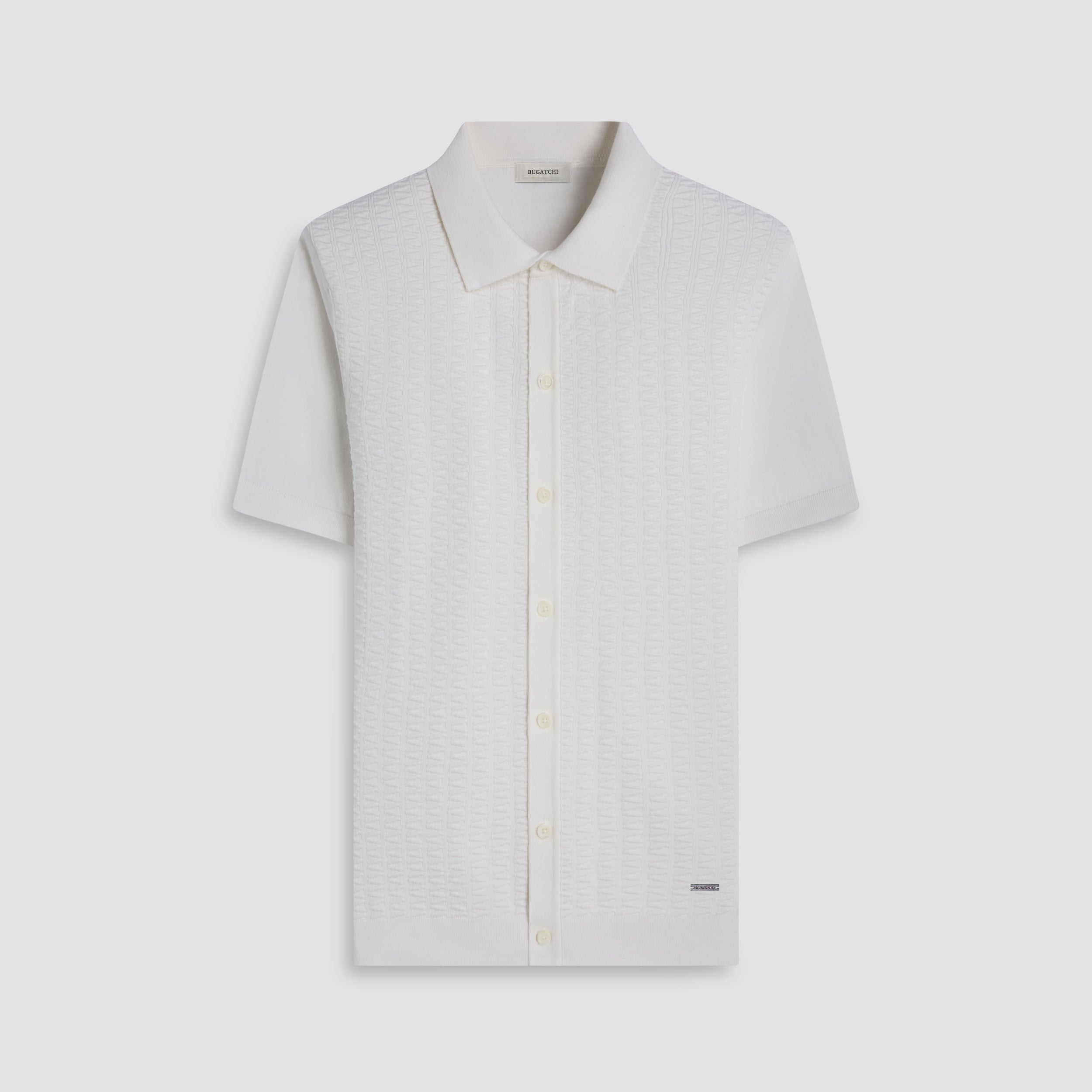 Crafted from a refined cotton-blend, this sweaters features a textured ladder stitch design across the front, complemented by a plain knit back. Short sleeves and a full button closure with mother-of-pearl buttons add a refined touch. Finished with ribbed collar, cuffs, and hem for a polished yet relaxed look.