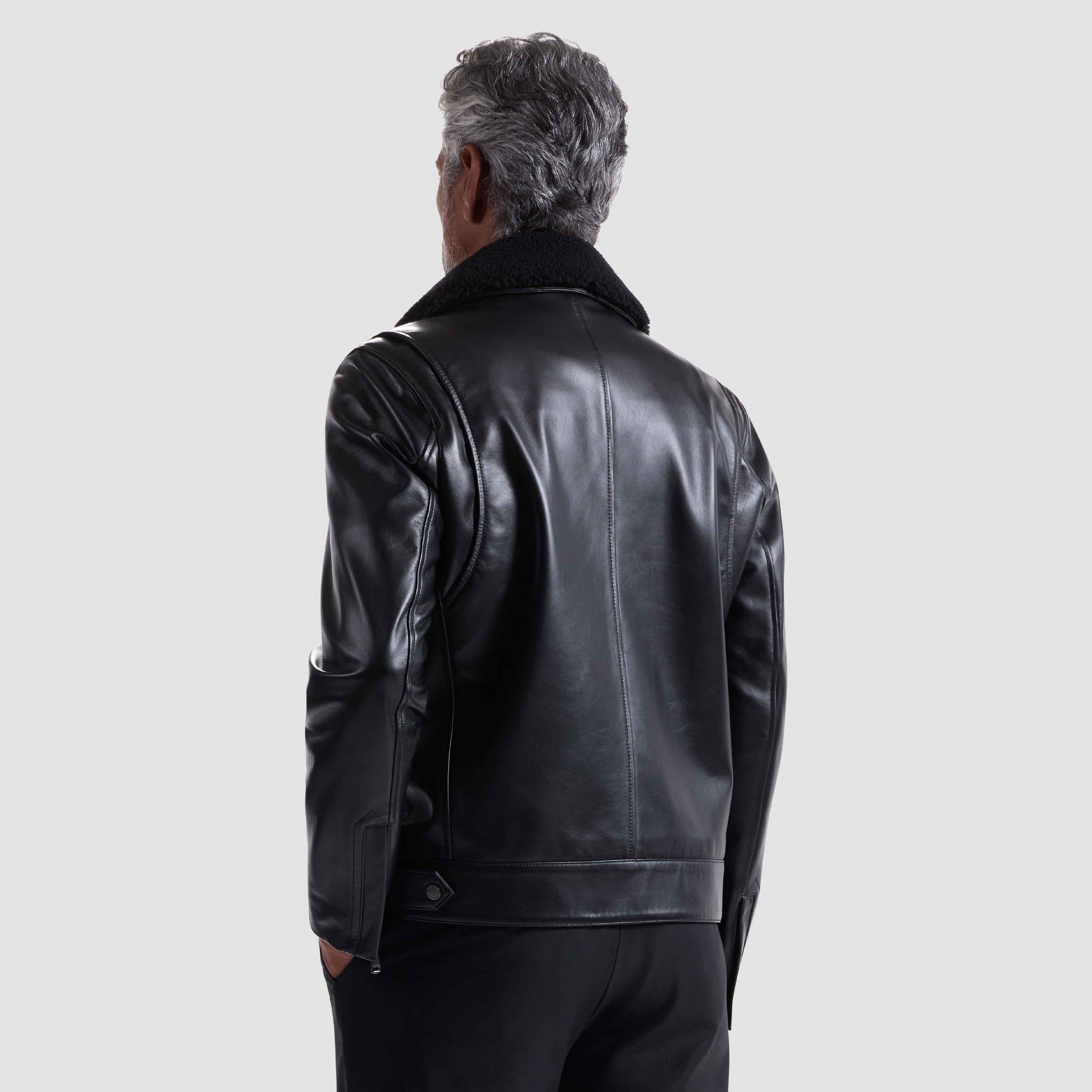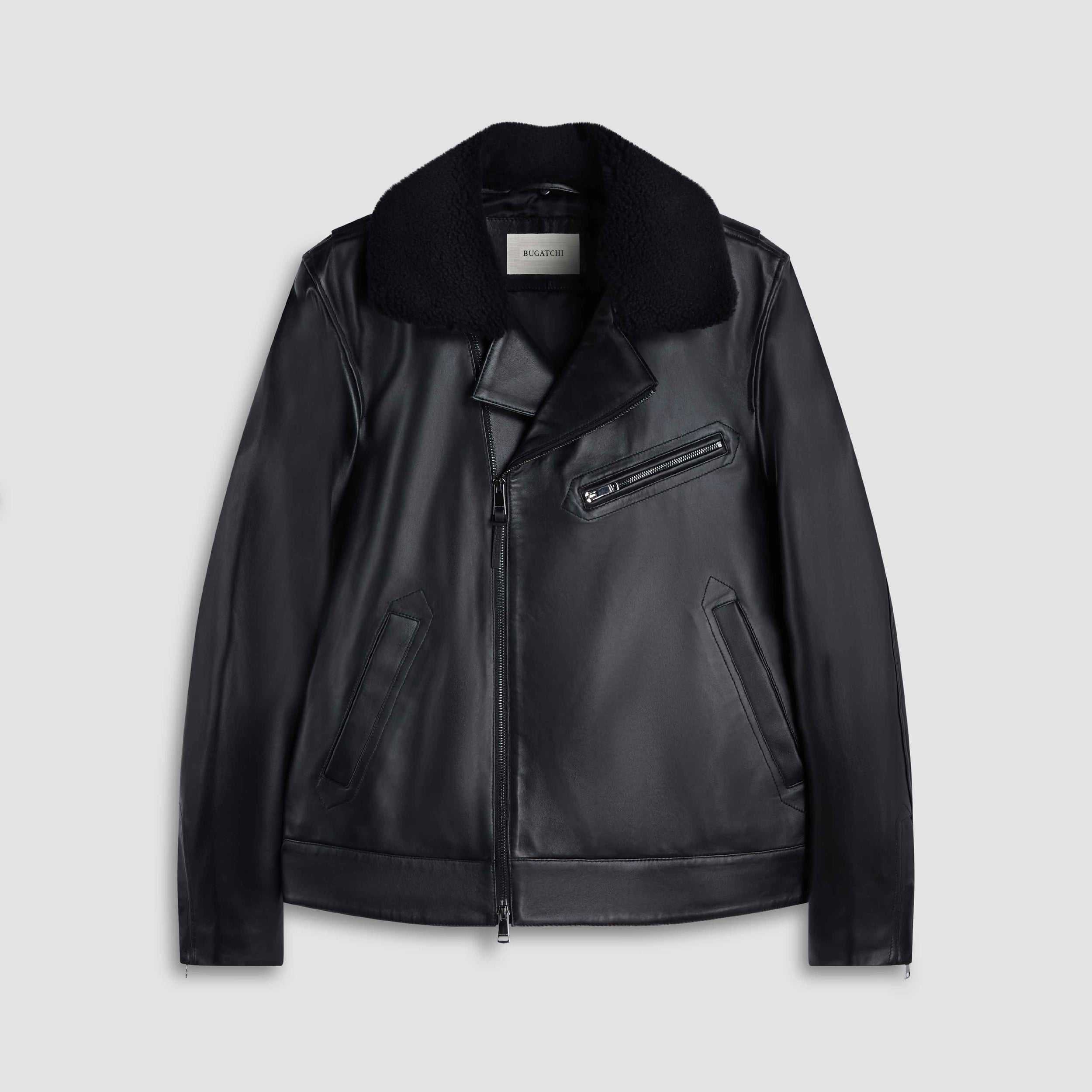 Crafted from 100% lamb leather, this biker jacket merges classic style with refined detailing. Fully lined for warmth, it features a removable shearling collar for versatile styling, a two-way zipper, and zippered cuffs with covered plackets. Functional pockets include two angled welt pockets, a zippered chest pocket, and two interior pockets. Designed to elevate any look with rugged sophistication.