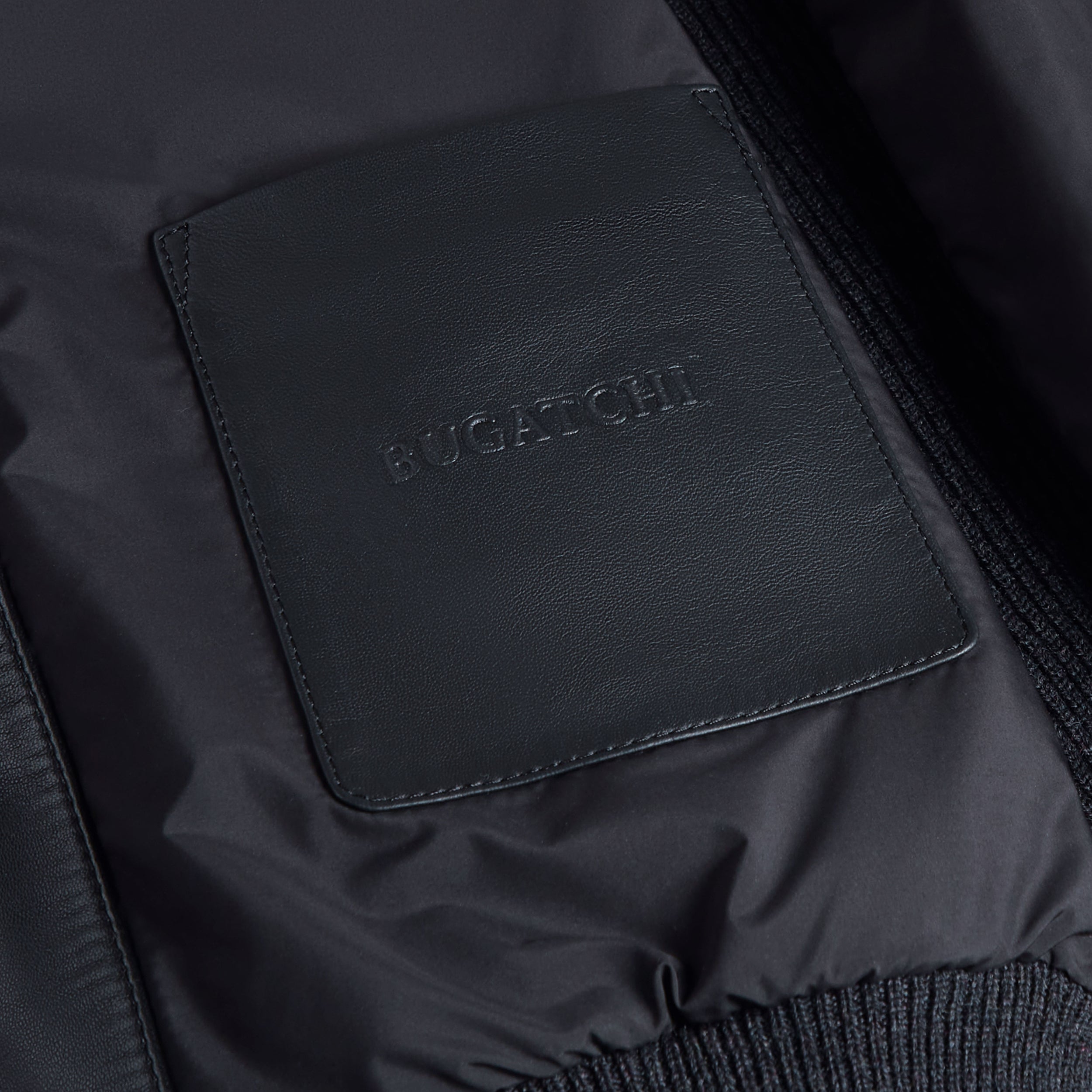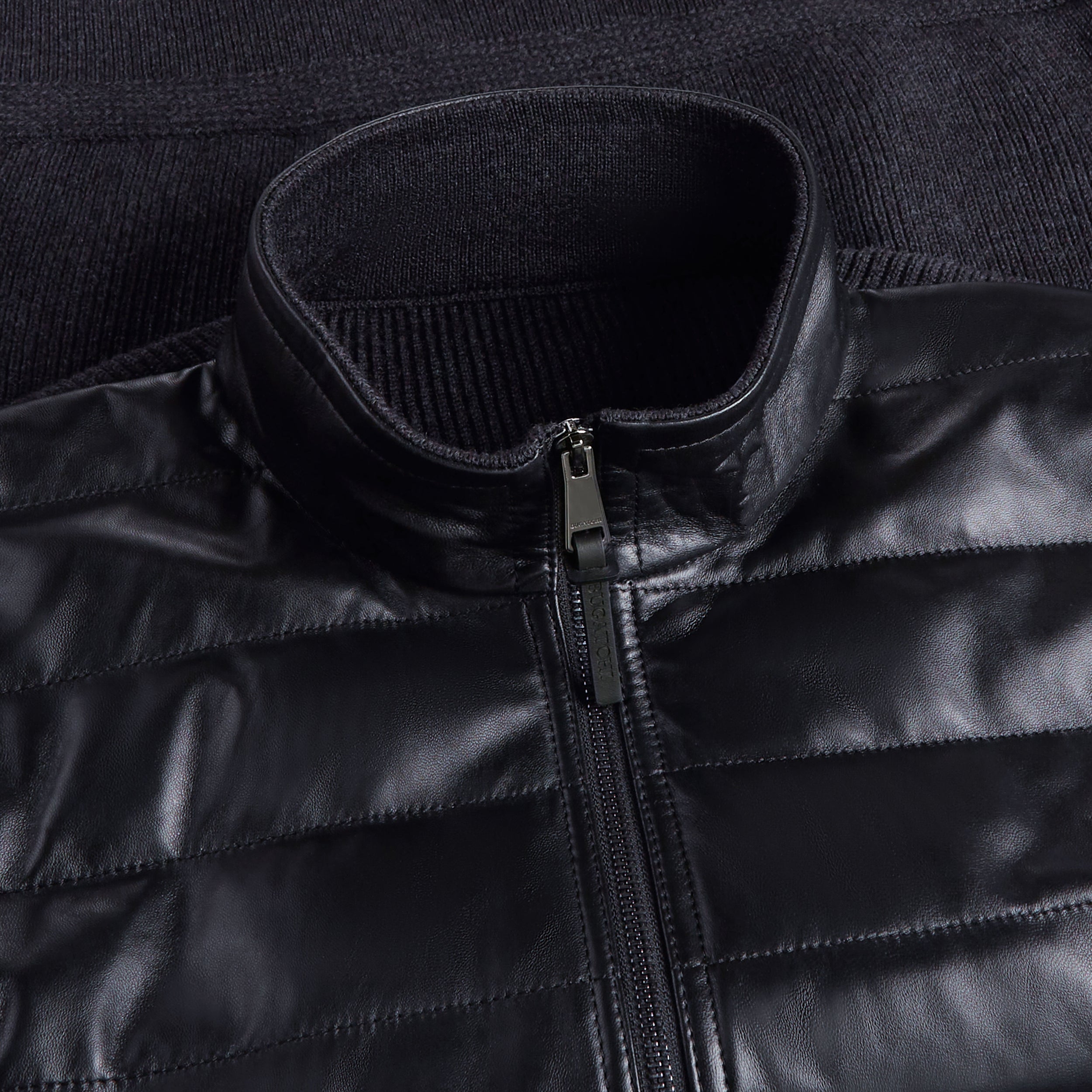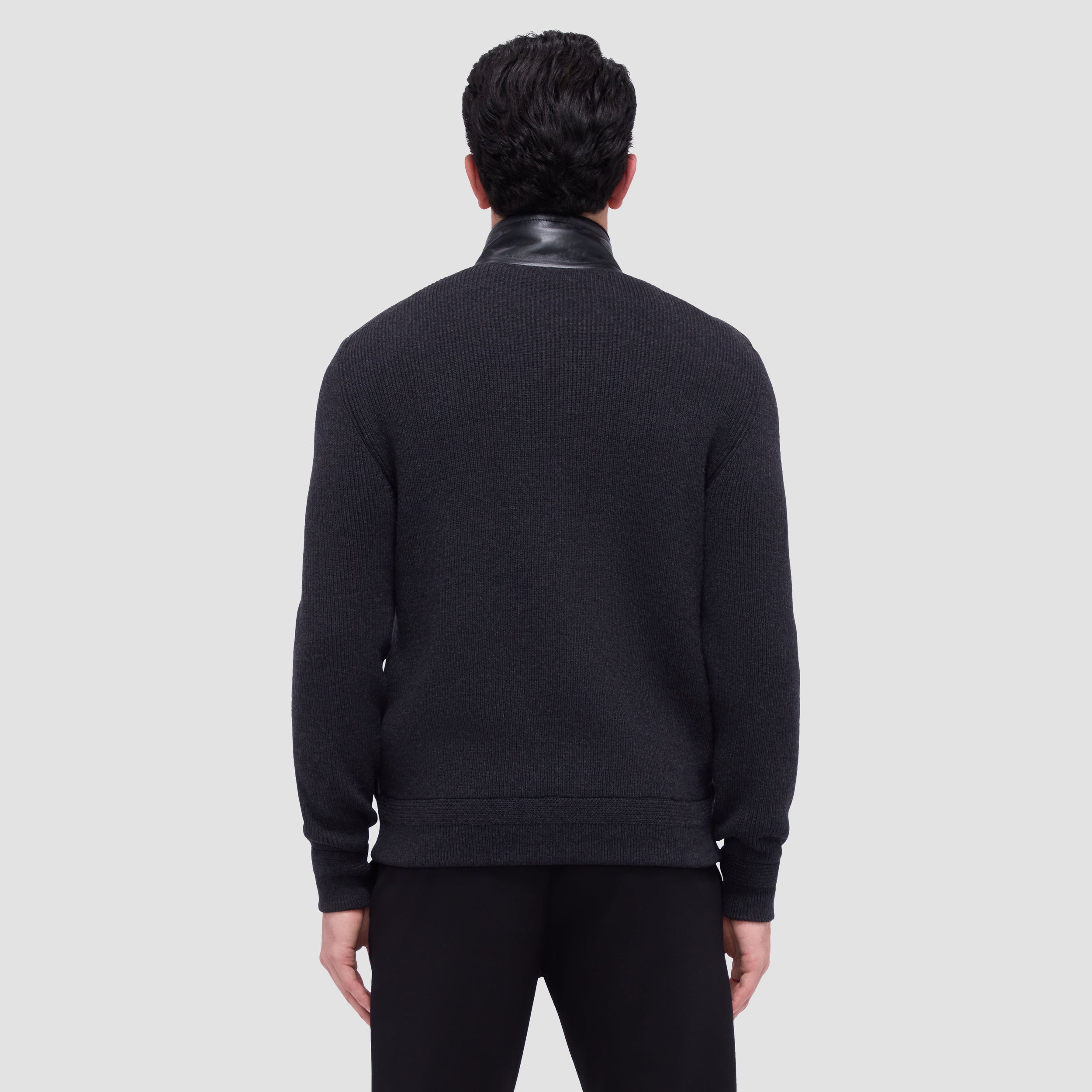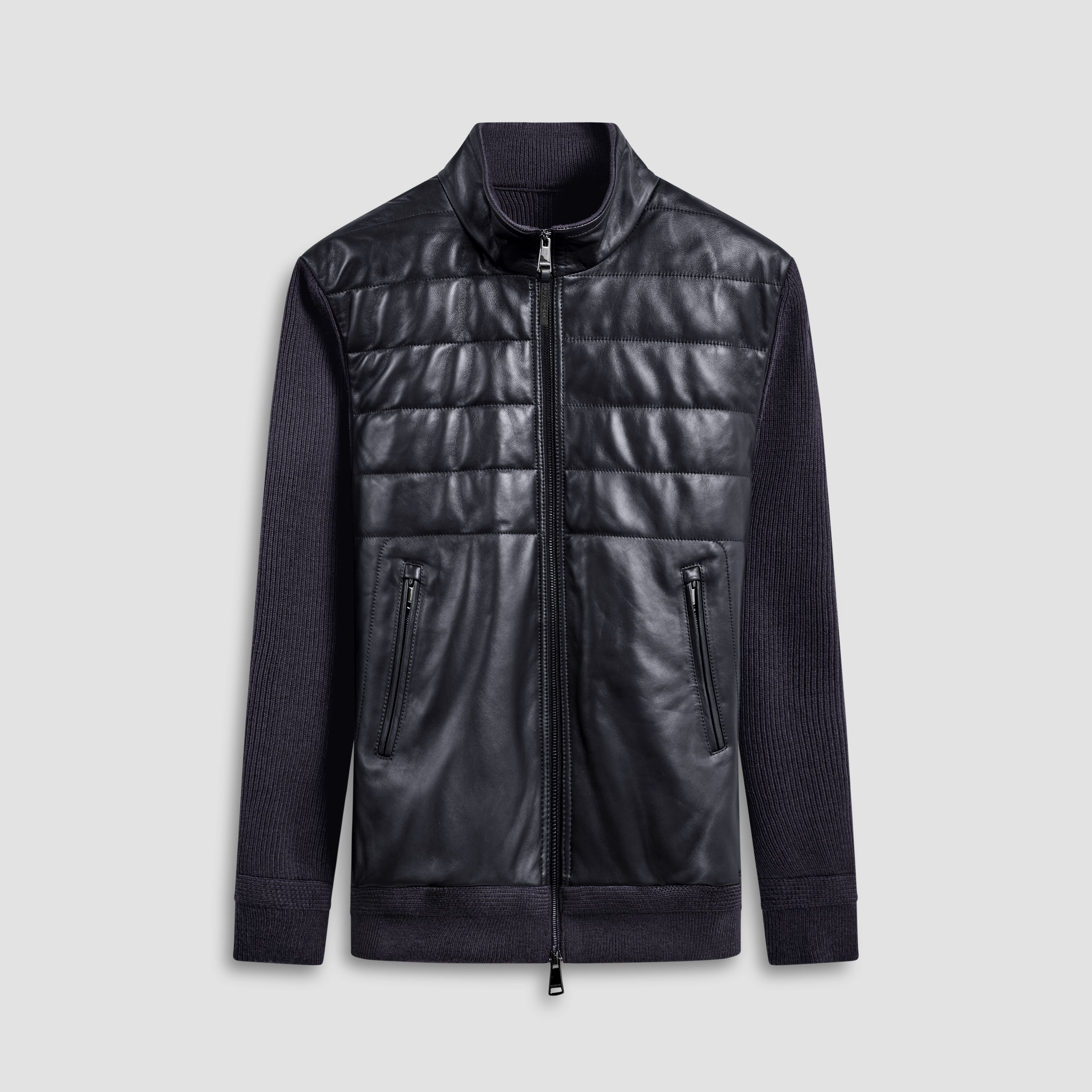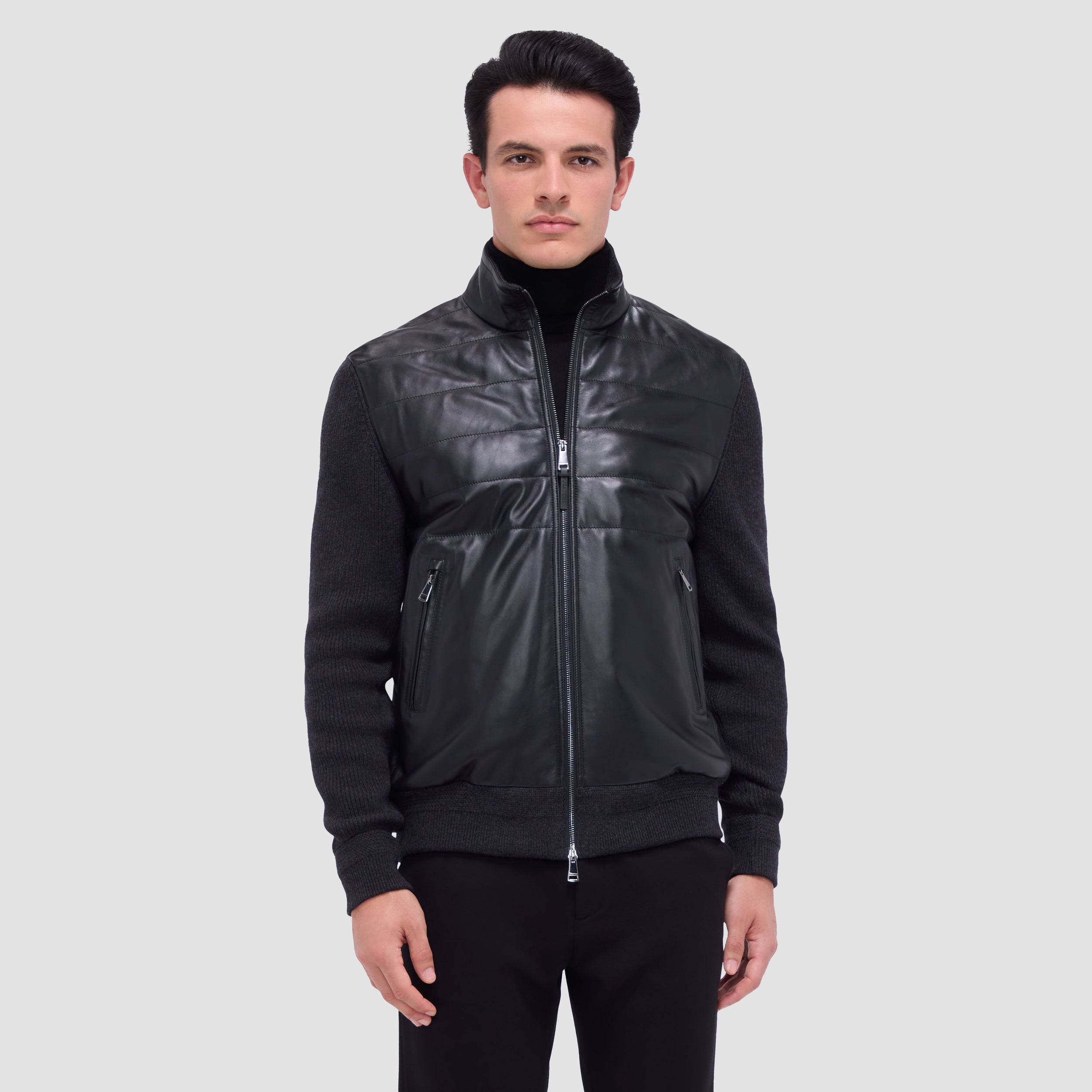 This contemporary leather and knit combination jacket blends timeless appeal with the comfort of Merino wool. It features a fully lined, lightly padded leather front, fisherman knit sleeves and back, a knit lined stand-up leather collar, a two-way zipper, slanted zipper pockets, and an inside pocket with a snap for storing valuables.