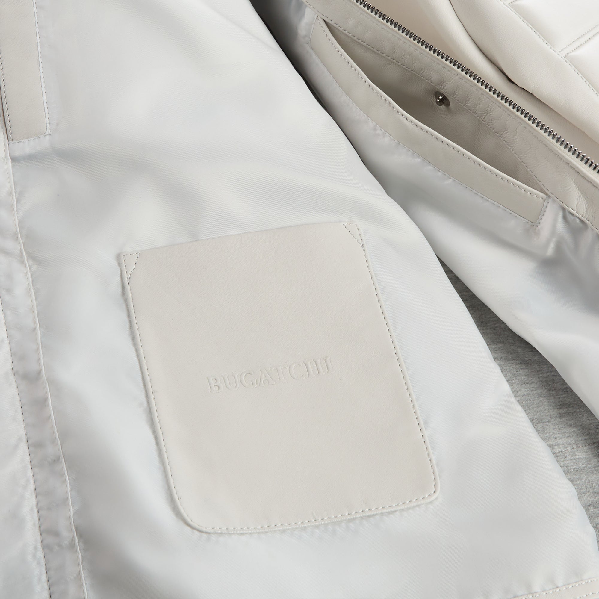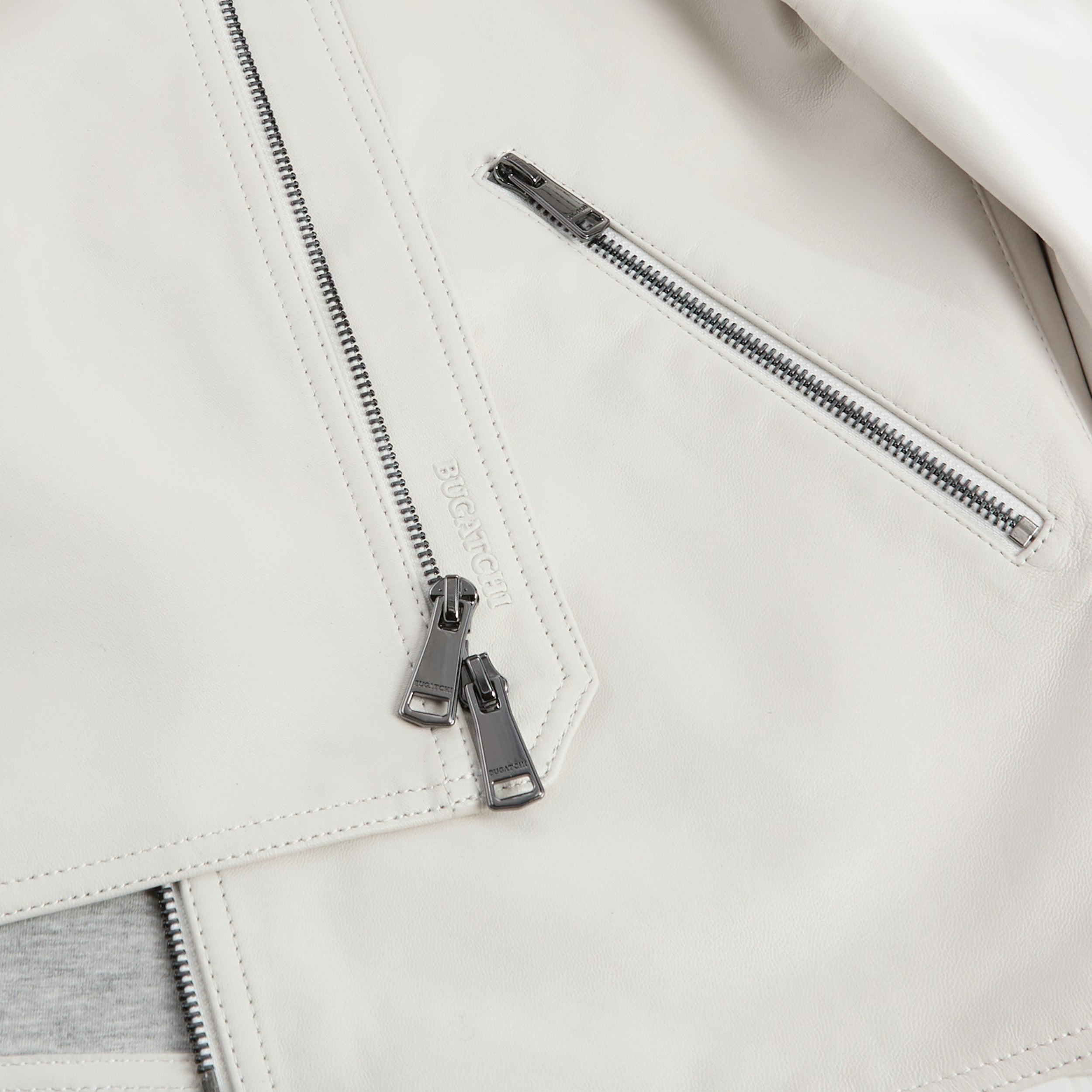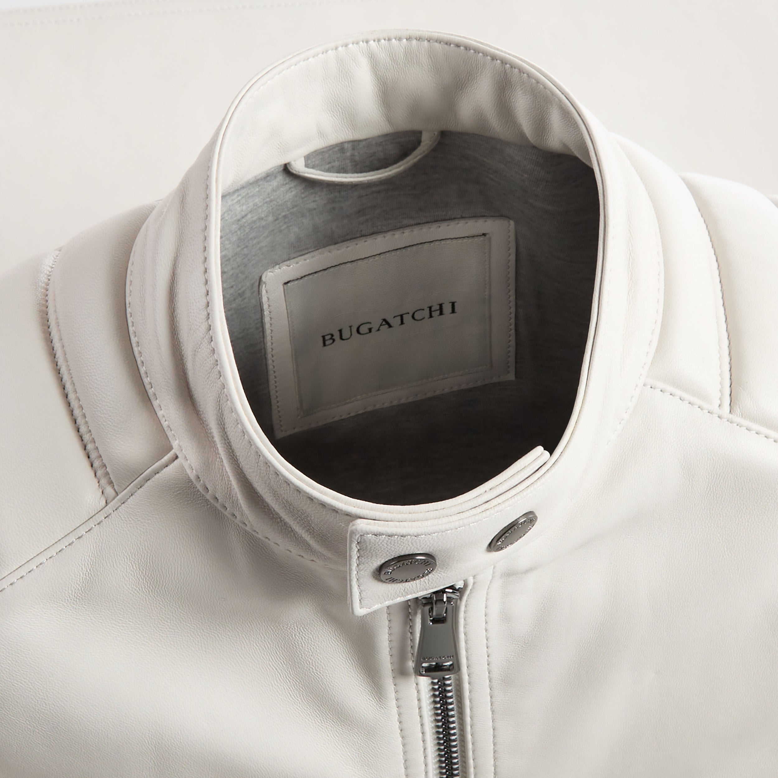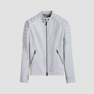 Inspired by motorcycle culture, this sleek jacket is crafted from luxurious and supple lamb leather, with barrel-padded shoulders, a two-way zipper, and slanted zipper pockets. The body is lined in cotton jersey for comfort and the sleeves in nylon for durability. A minimalist look and clean lines perfect for the open road or the town.