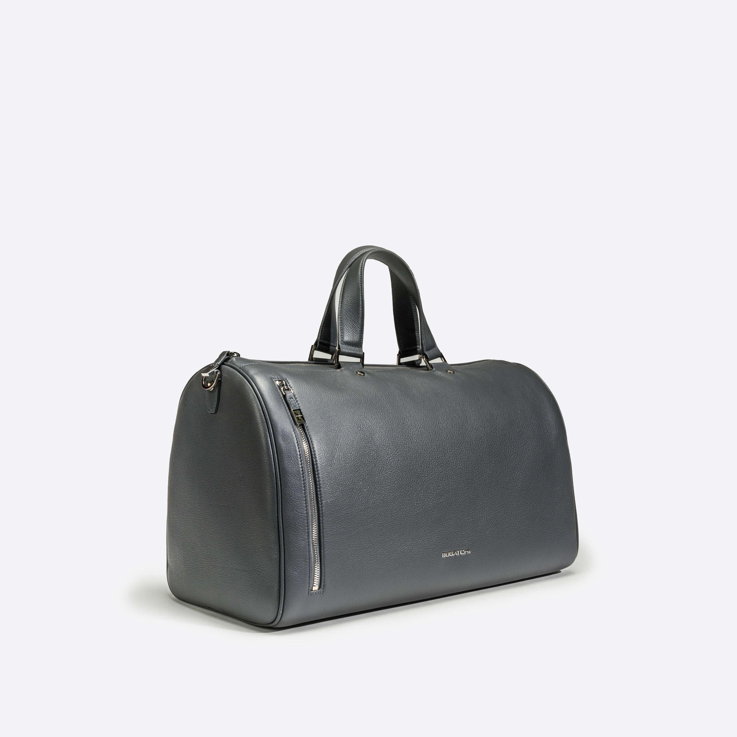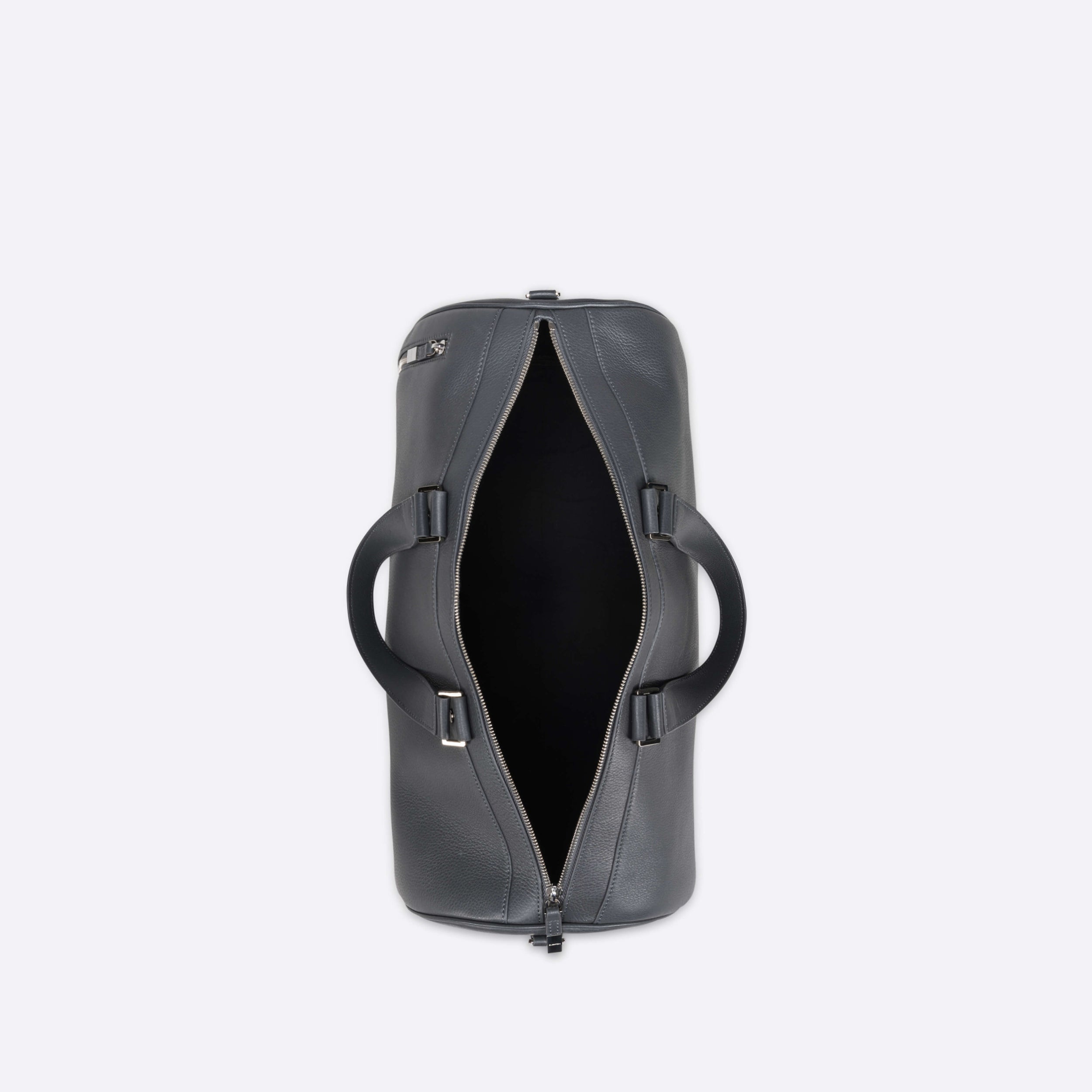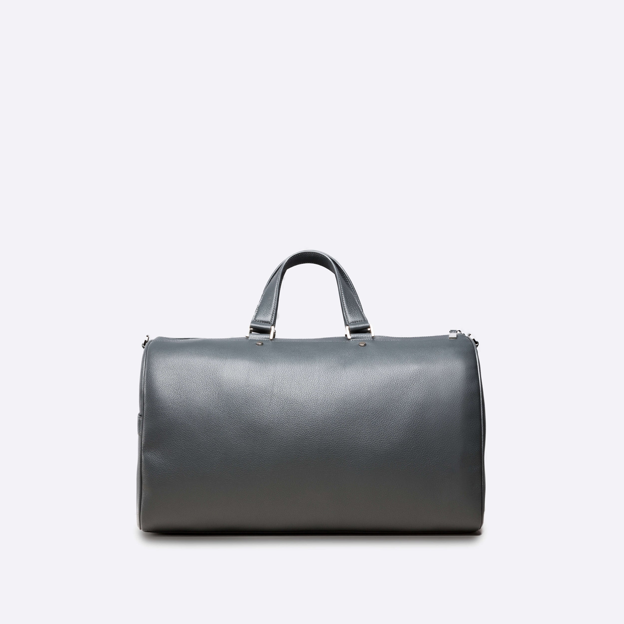 Full grain Pebble leather weekender duffel features detachable adjustable shoulder strap rolled top handles top zip closure and outside pocket with vertical zipper. Interior includes one zipped and multiple slip pockets. Silver tone hardware logo engraved zipper pulls ottoman lining and tonal stitching.