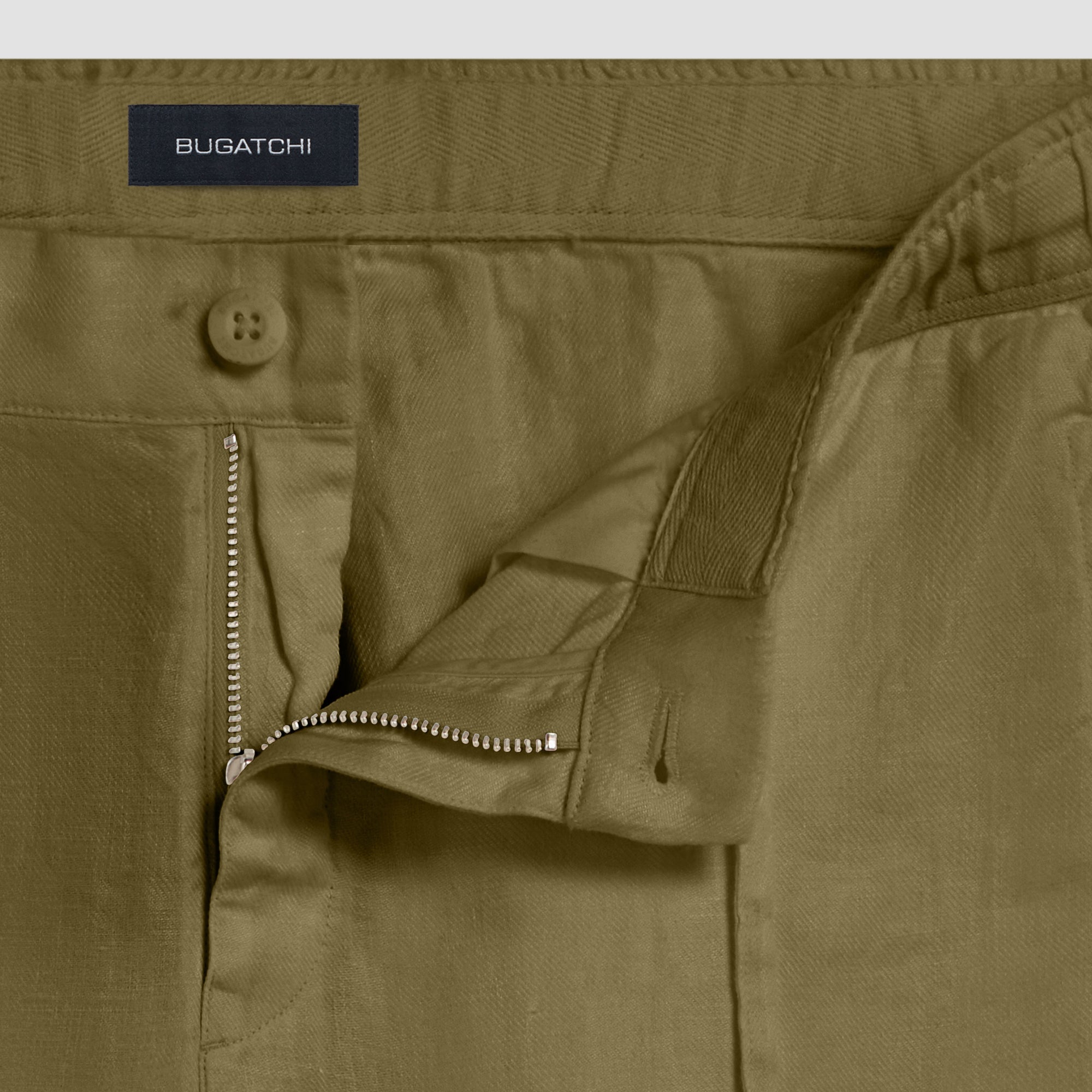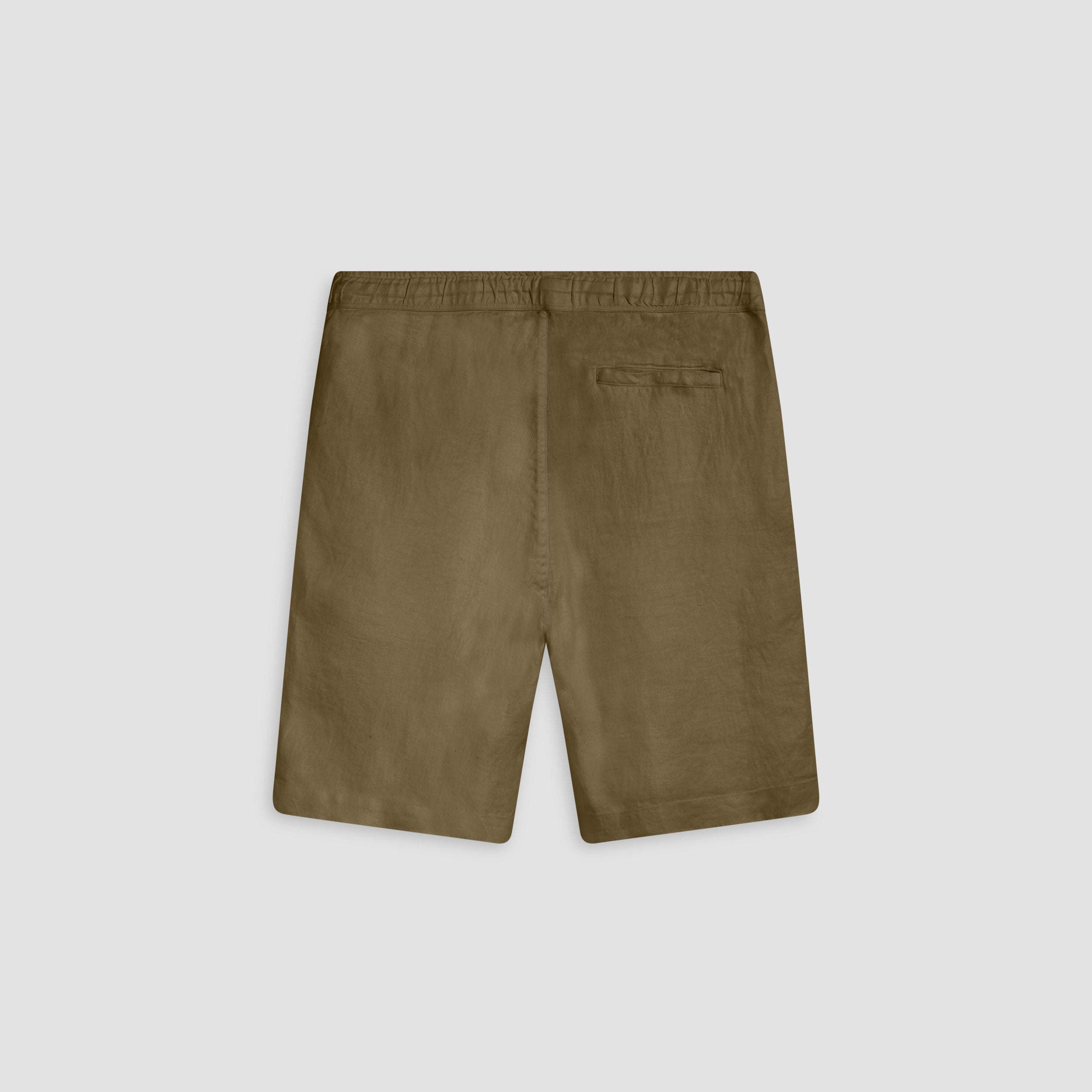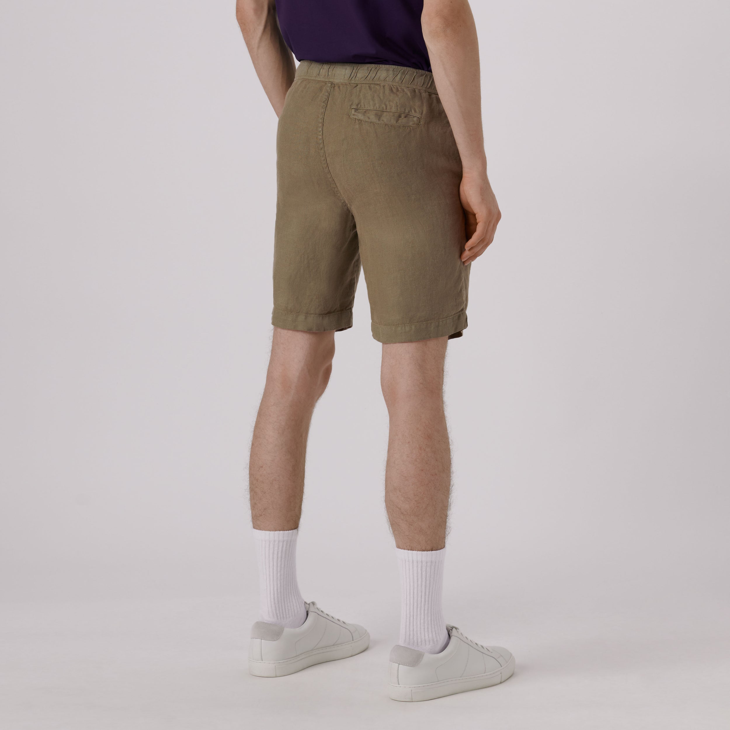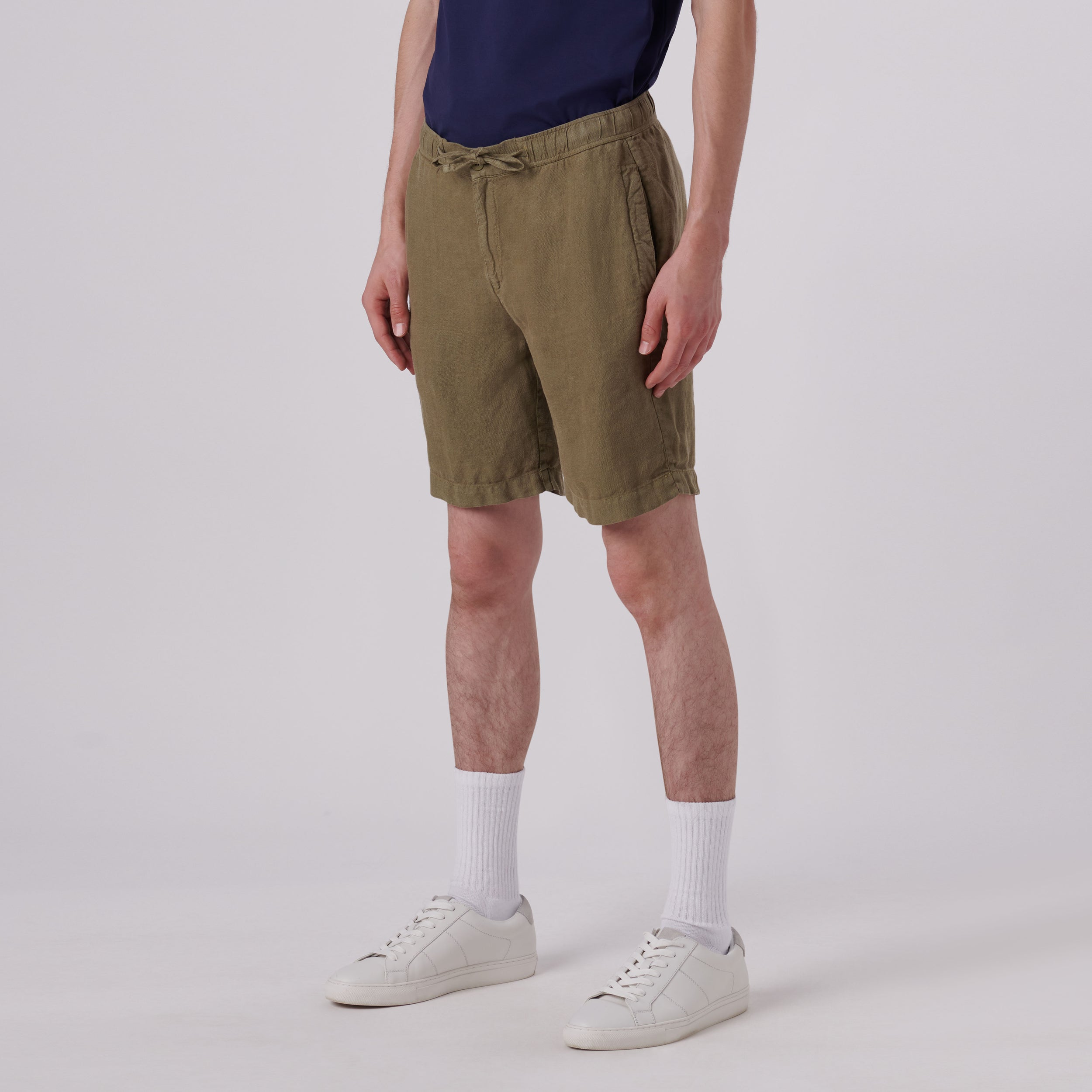 Straight leg, casual Bermuda shorts in 100% linen with side pockets, one back pocket, elasticized waistband with drawstring and zipper and button fly closure.