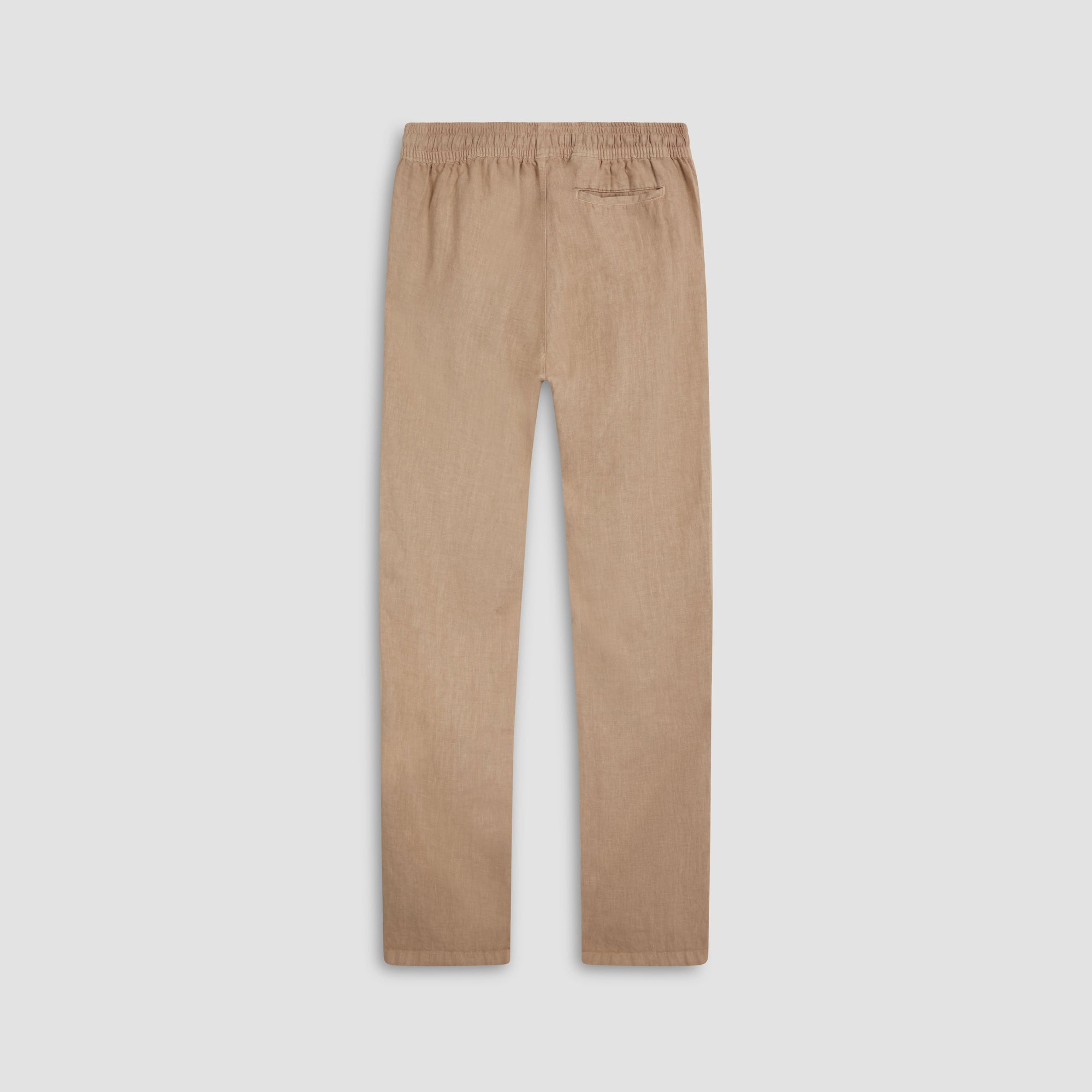 Straight leg pant in 100% linen with side pockets, one back pocket, elasticized waistband with drawstring and zipper fly.