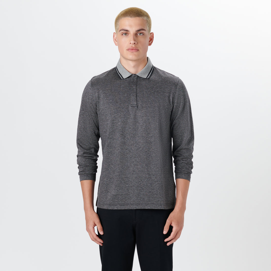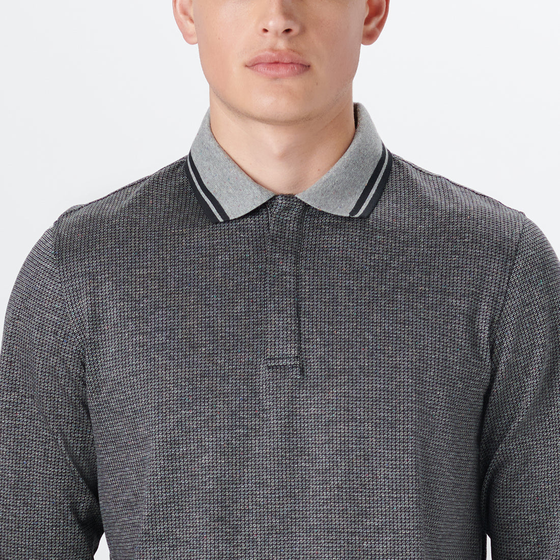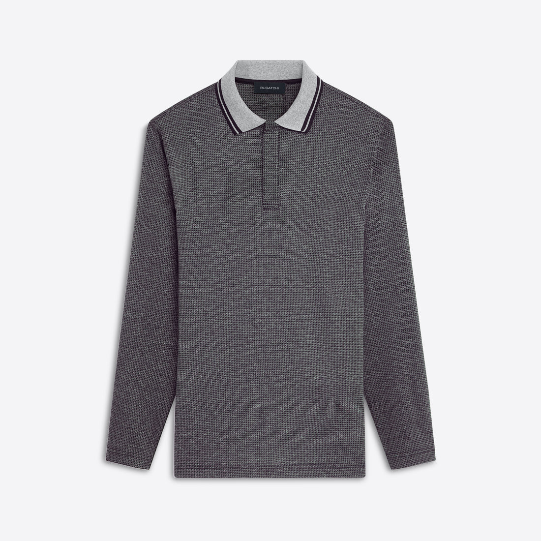 Long sleeve polo in bird's eye 100% cotton with two-button covered placket and double striped polo collar.