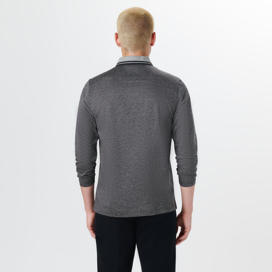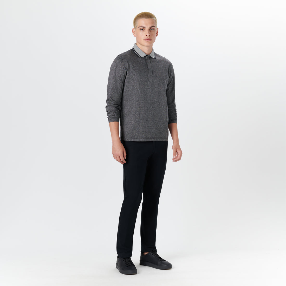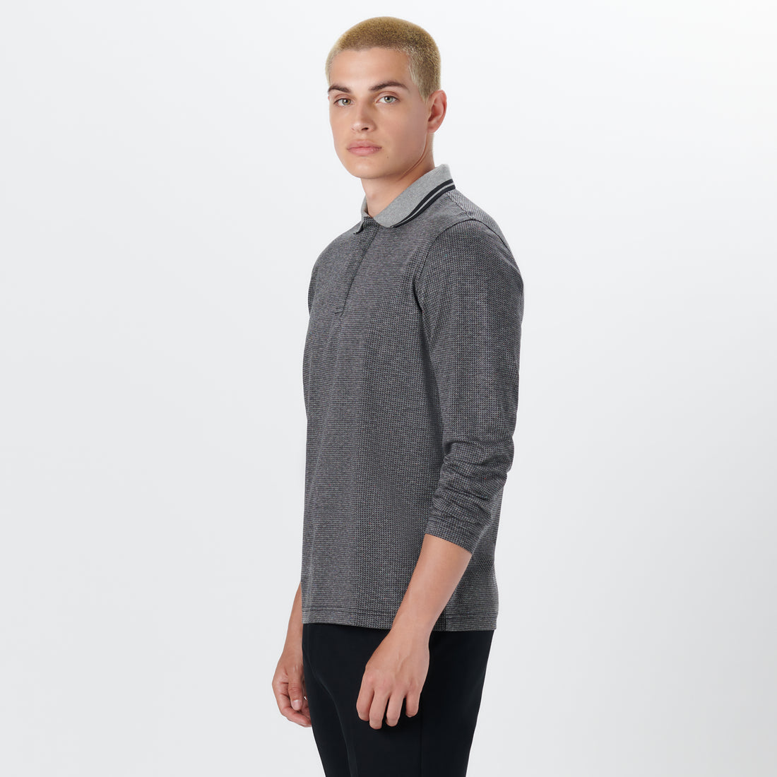 Long sleeve polo in bird's eye 100% cotton with two-button covered placket and double striped polo collar.