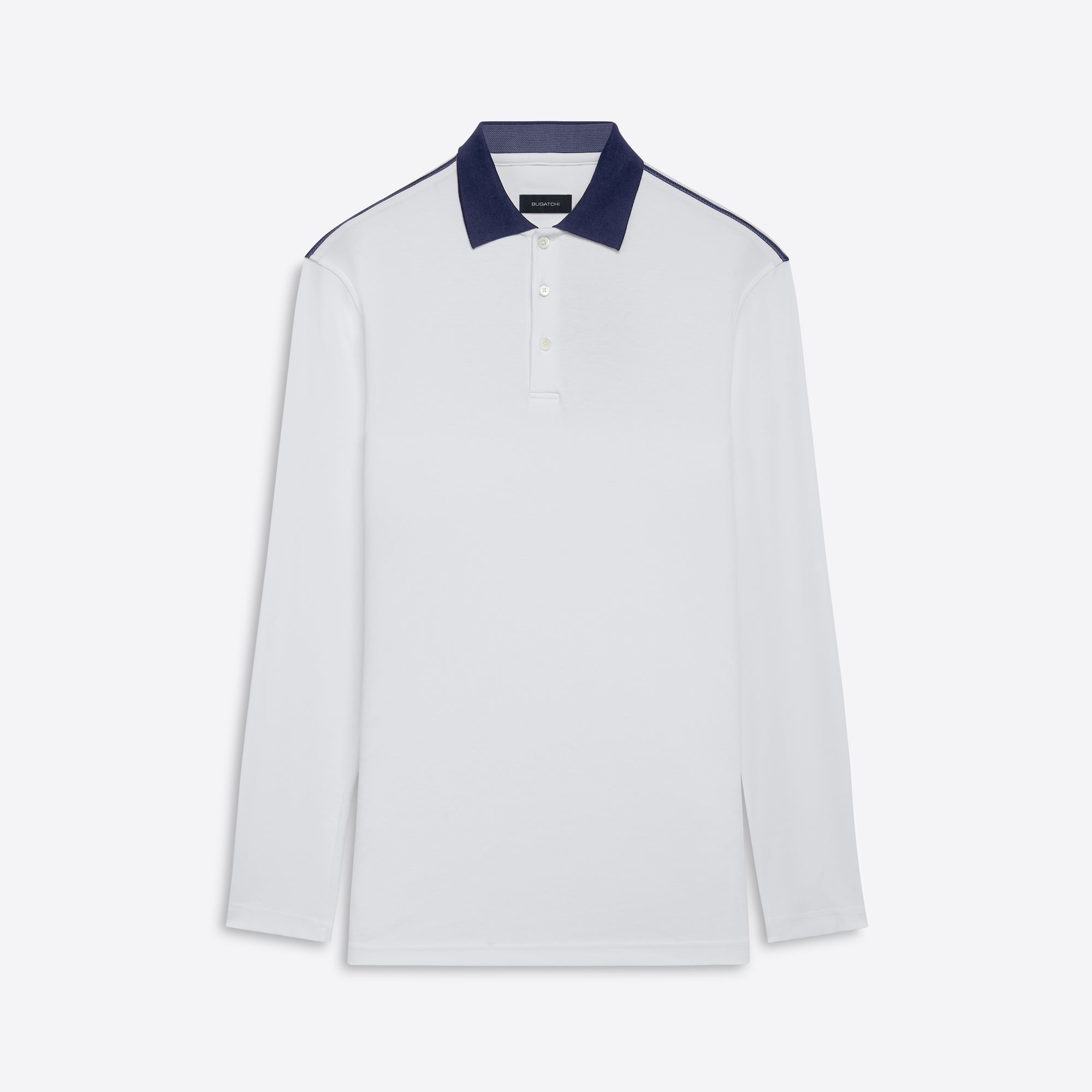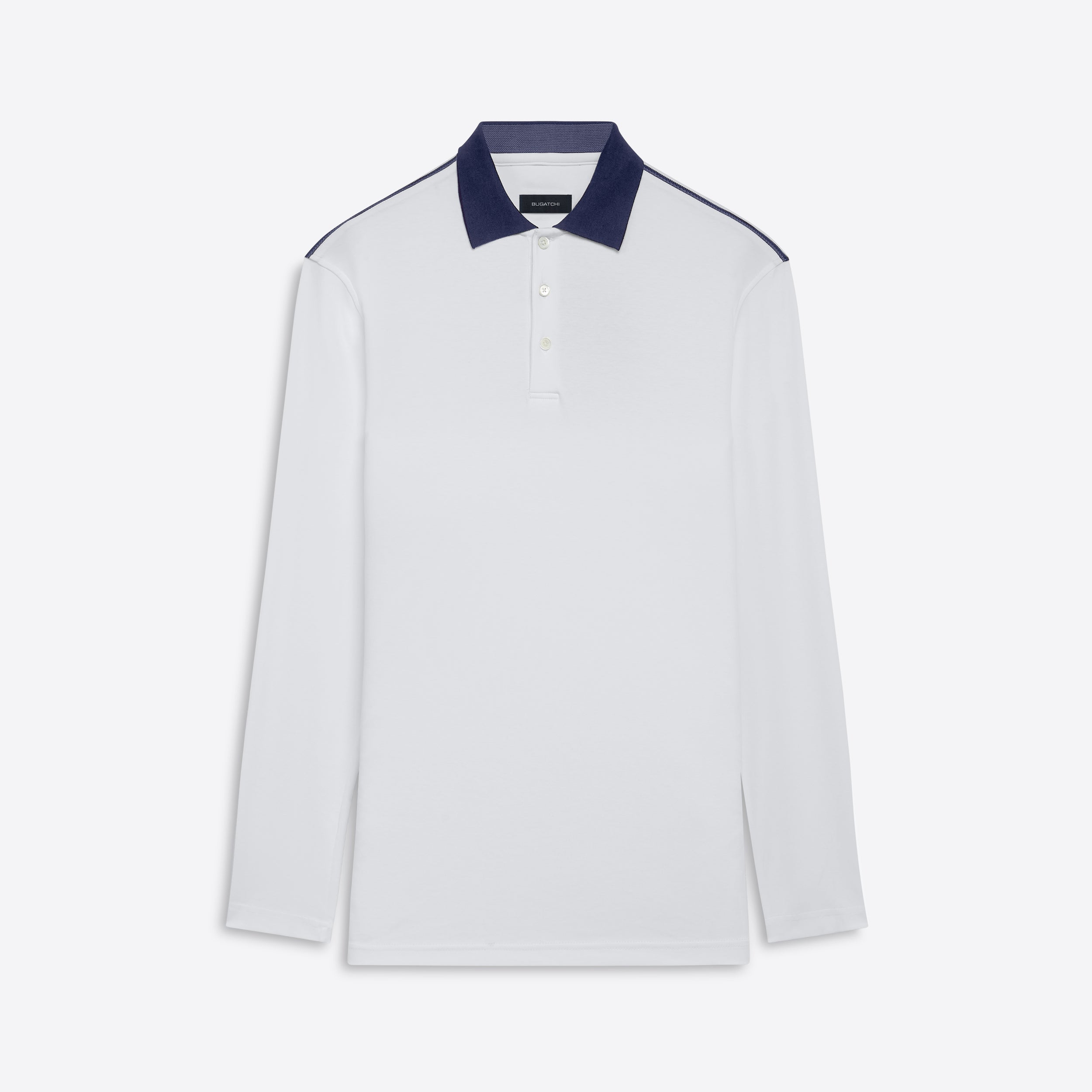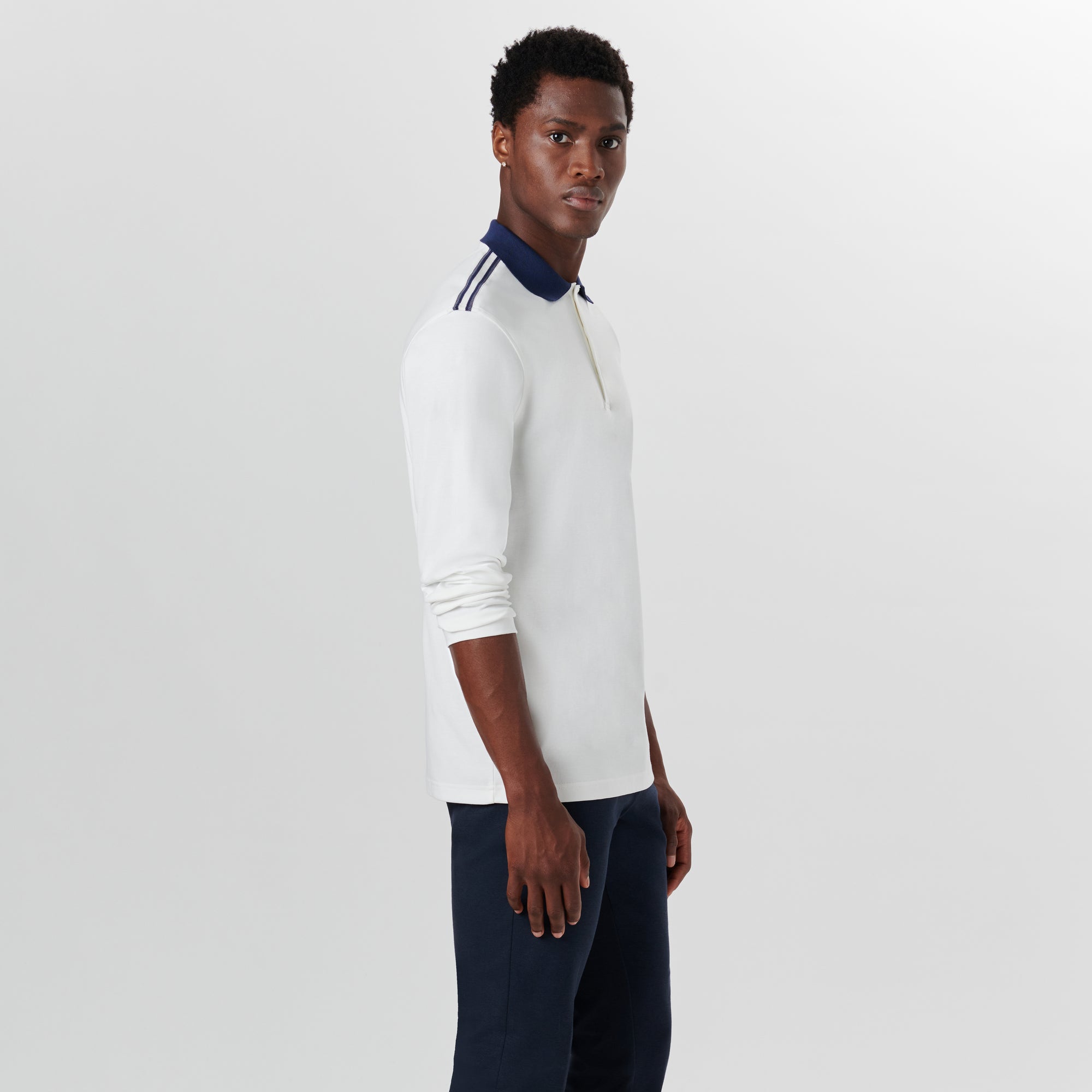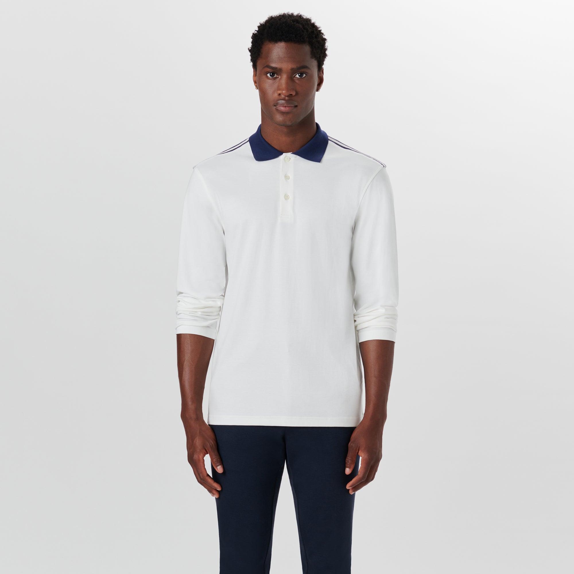 Long sleeve polo in 100% pima cotton with three button placket, taping detail and rib polo collar.