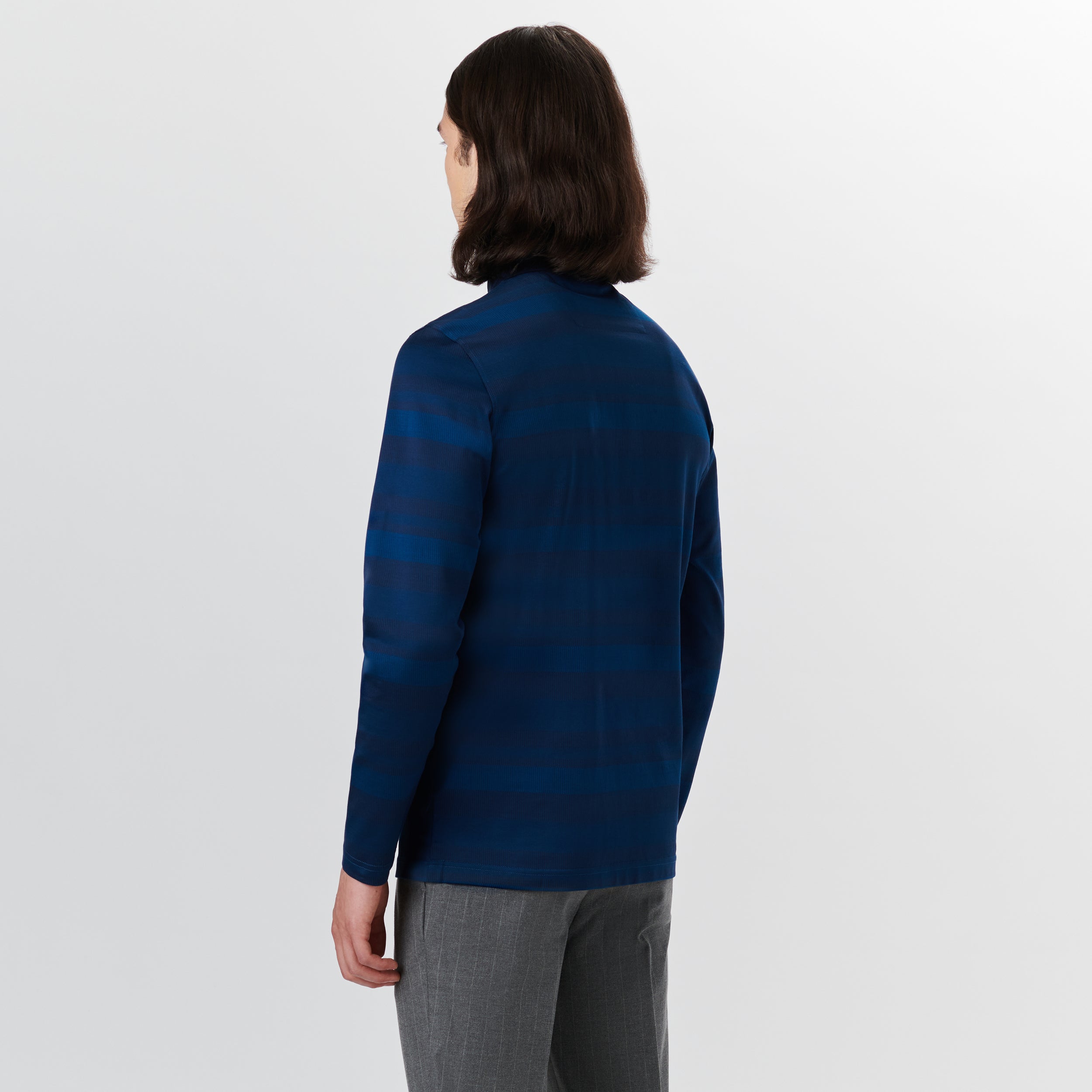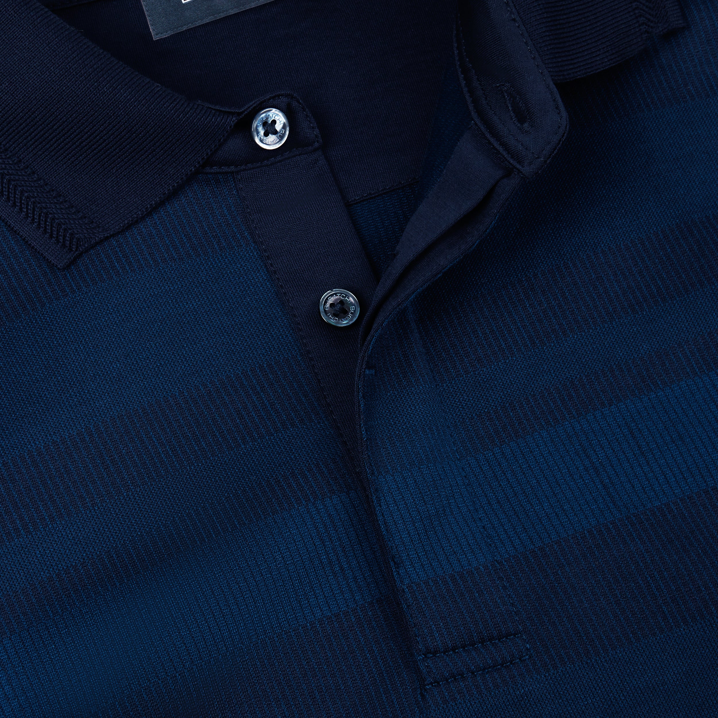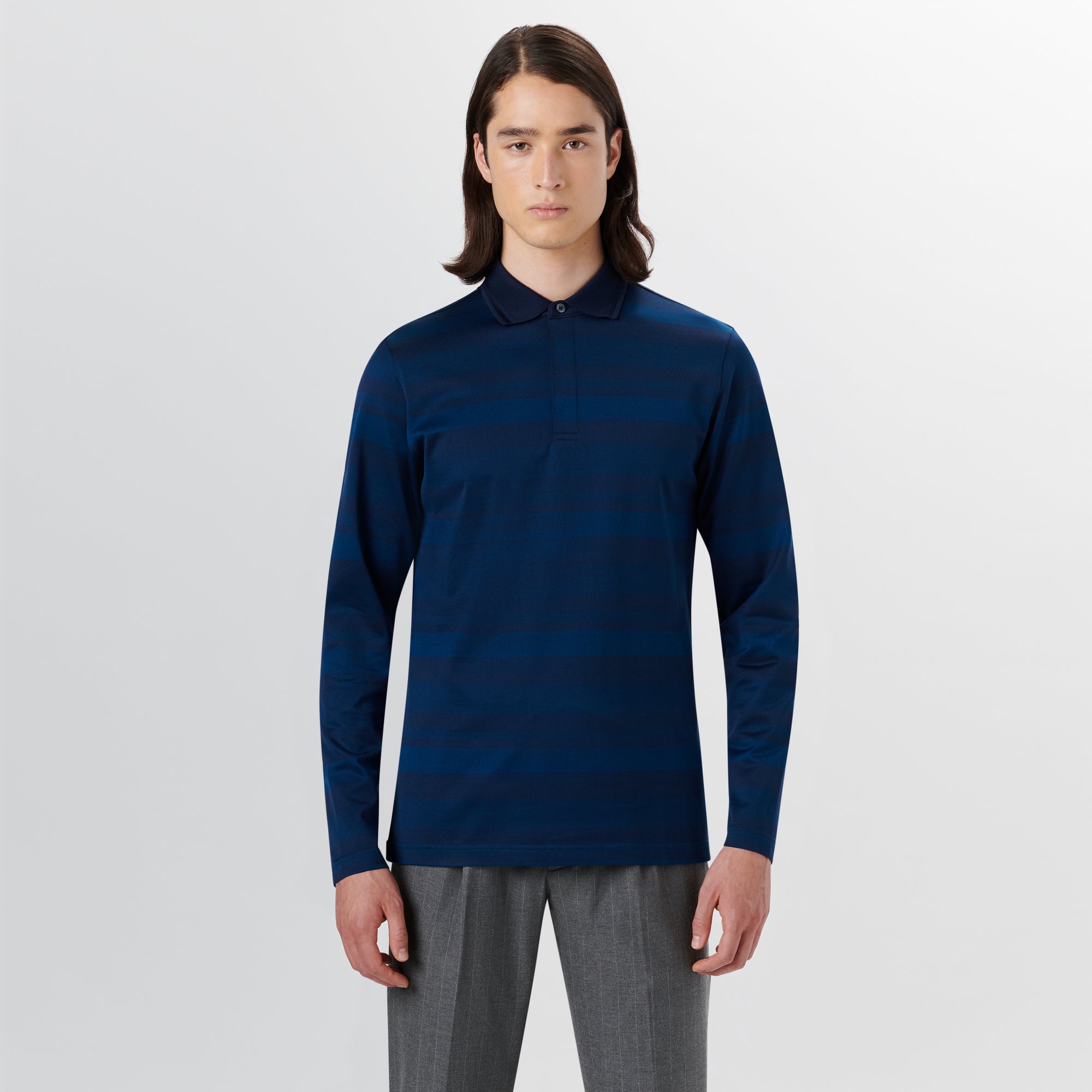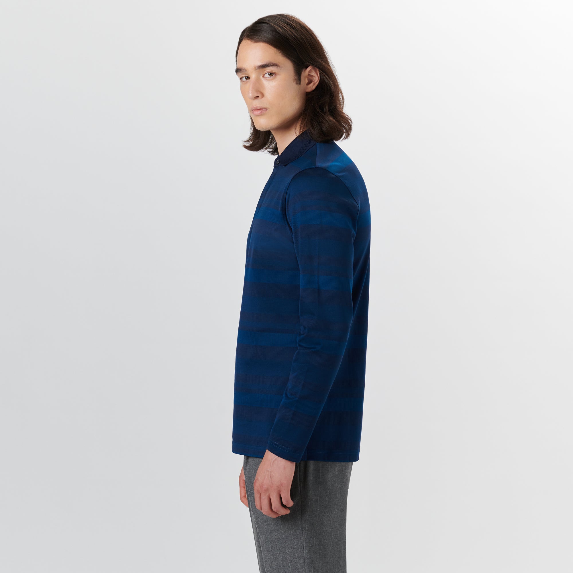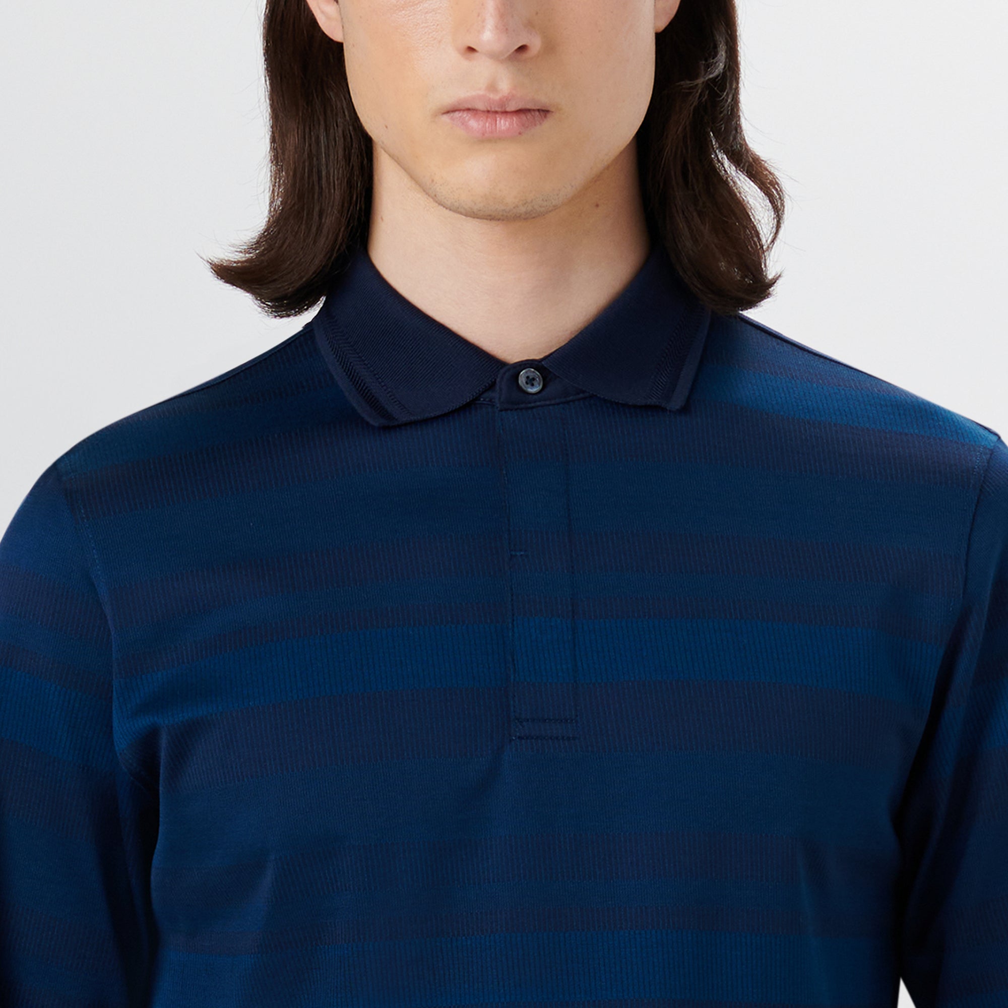 Long sleeve polo in striped 100% mercerized cotton with three-button covered placket and chevron stripe detailed solid polo collar.