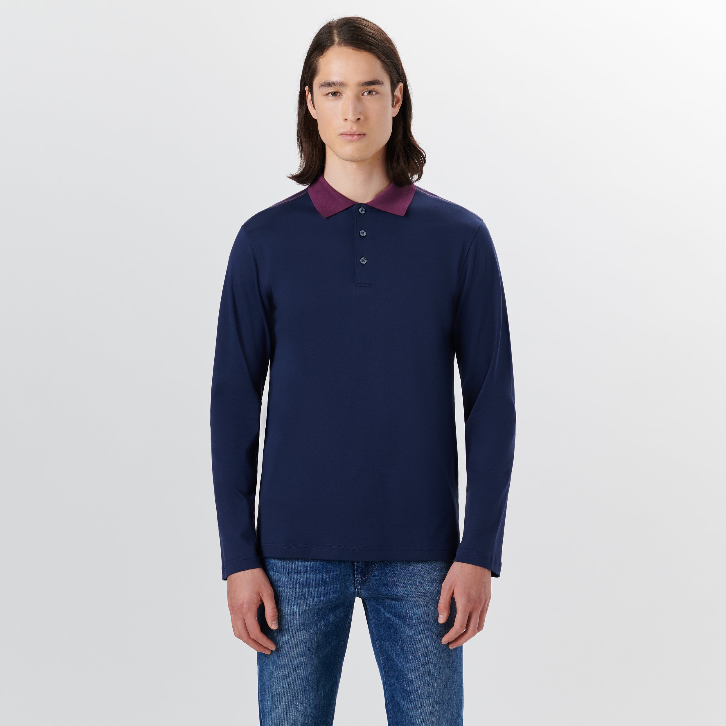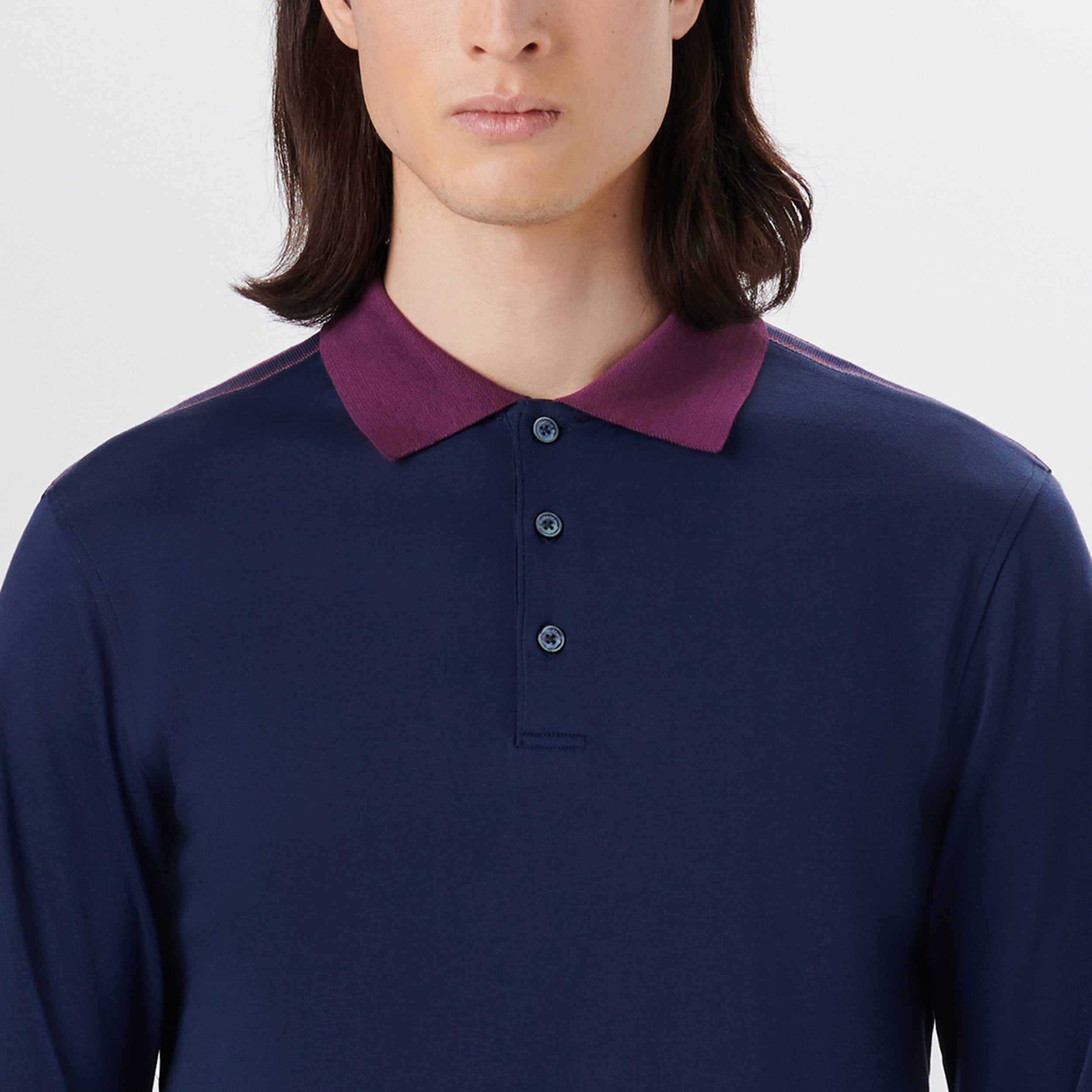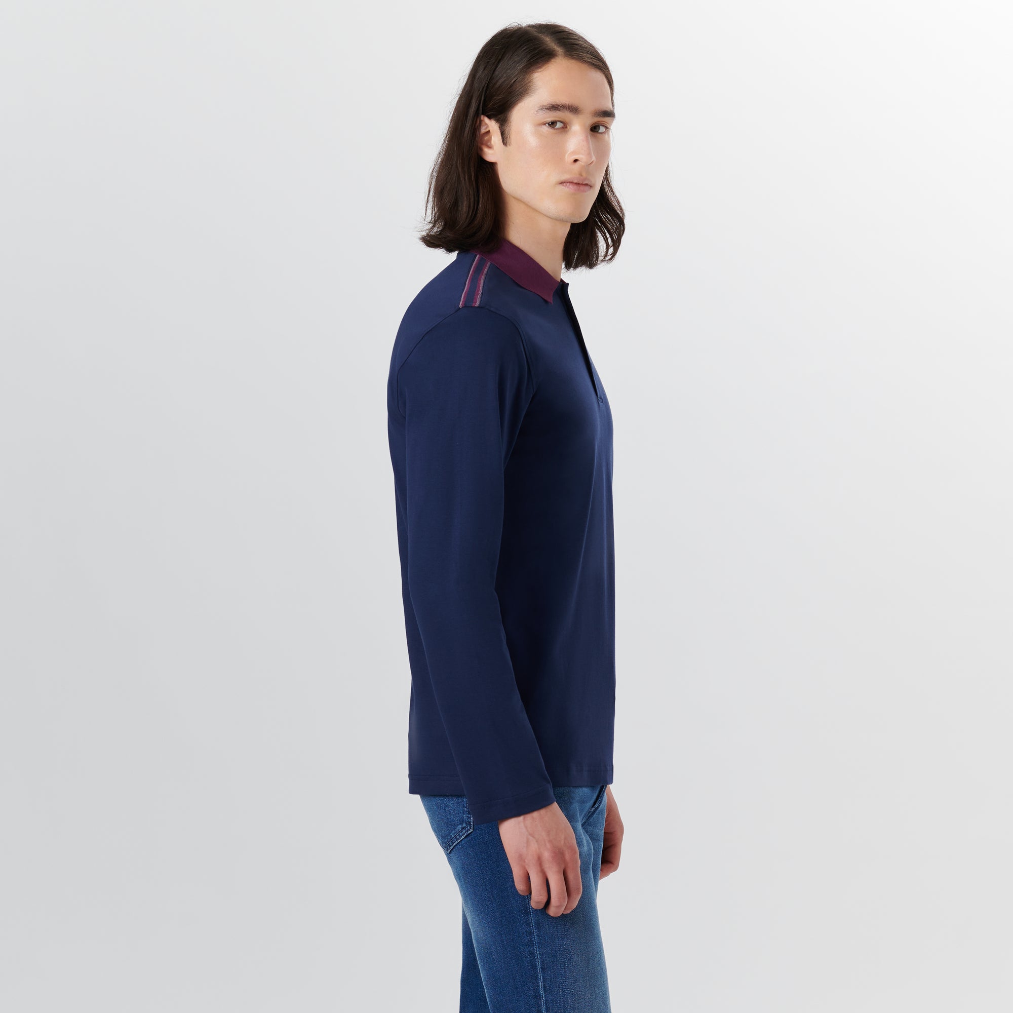 Long sleeve polo in 100% pima cotton with three button placket, taping detail and rib polo collar.