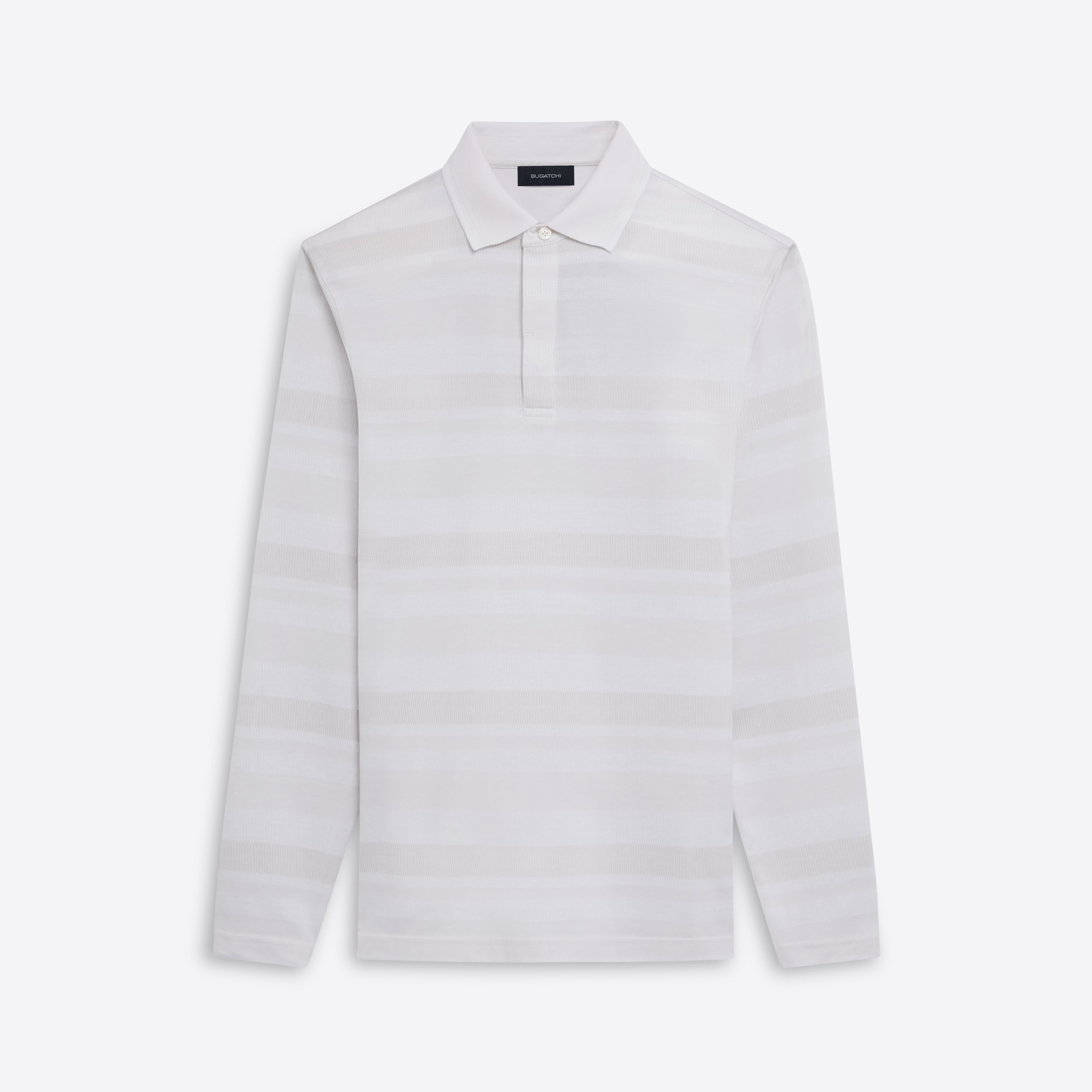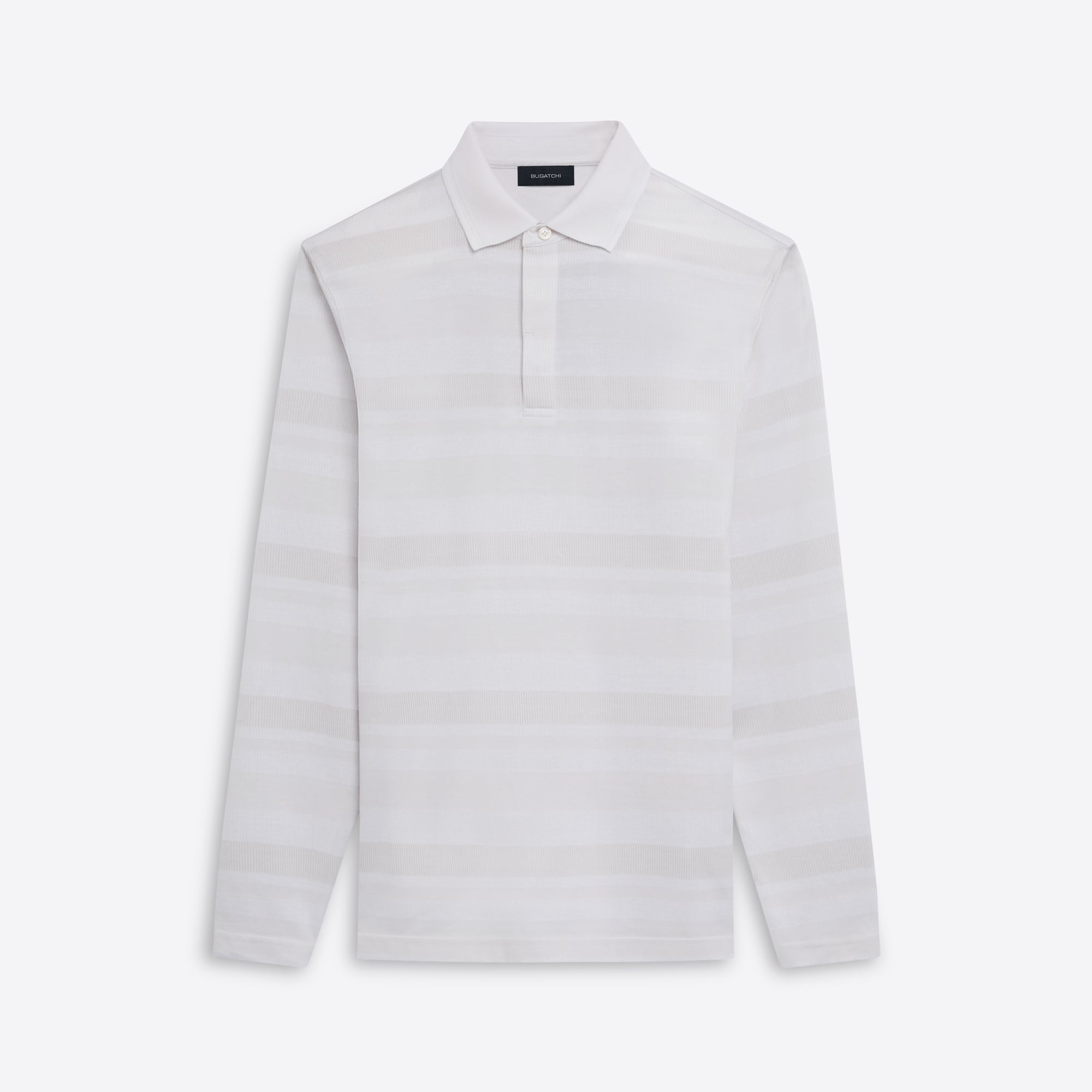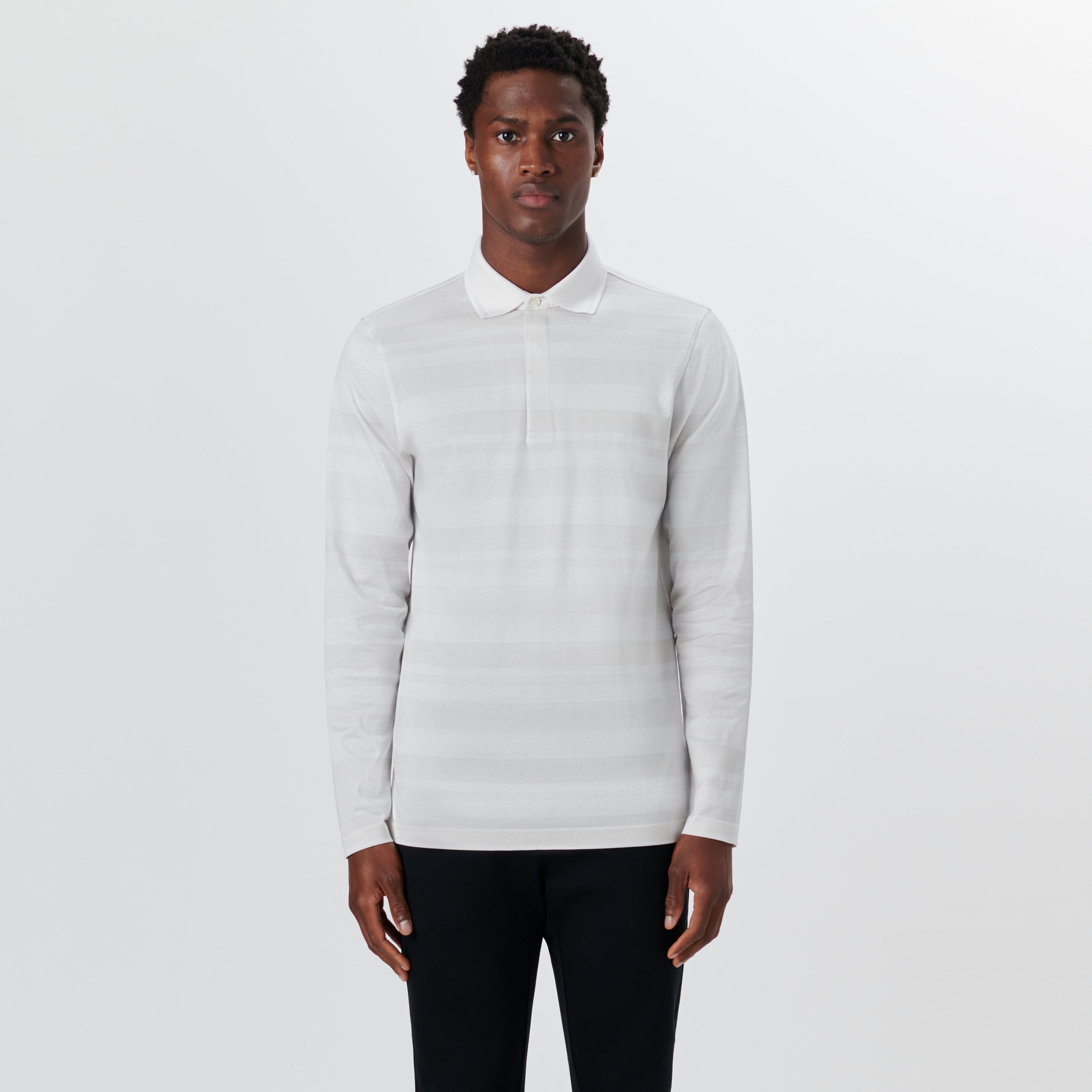 Long sleeve polo in striped 100% mercerized cotton with three-button covered placket and chevron stripe detailed solid polo collar.