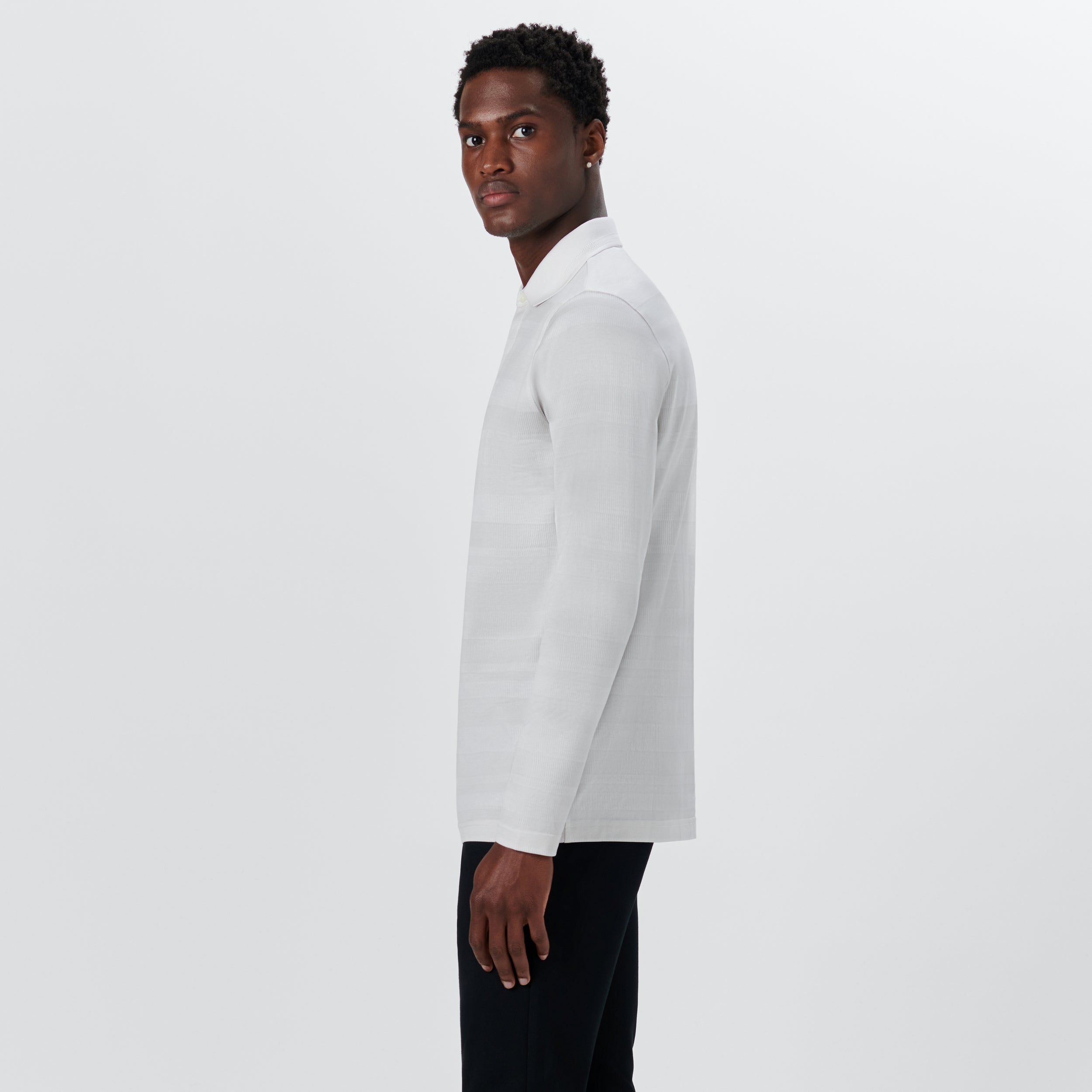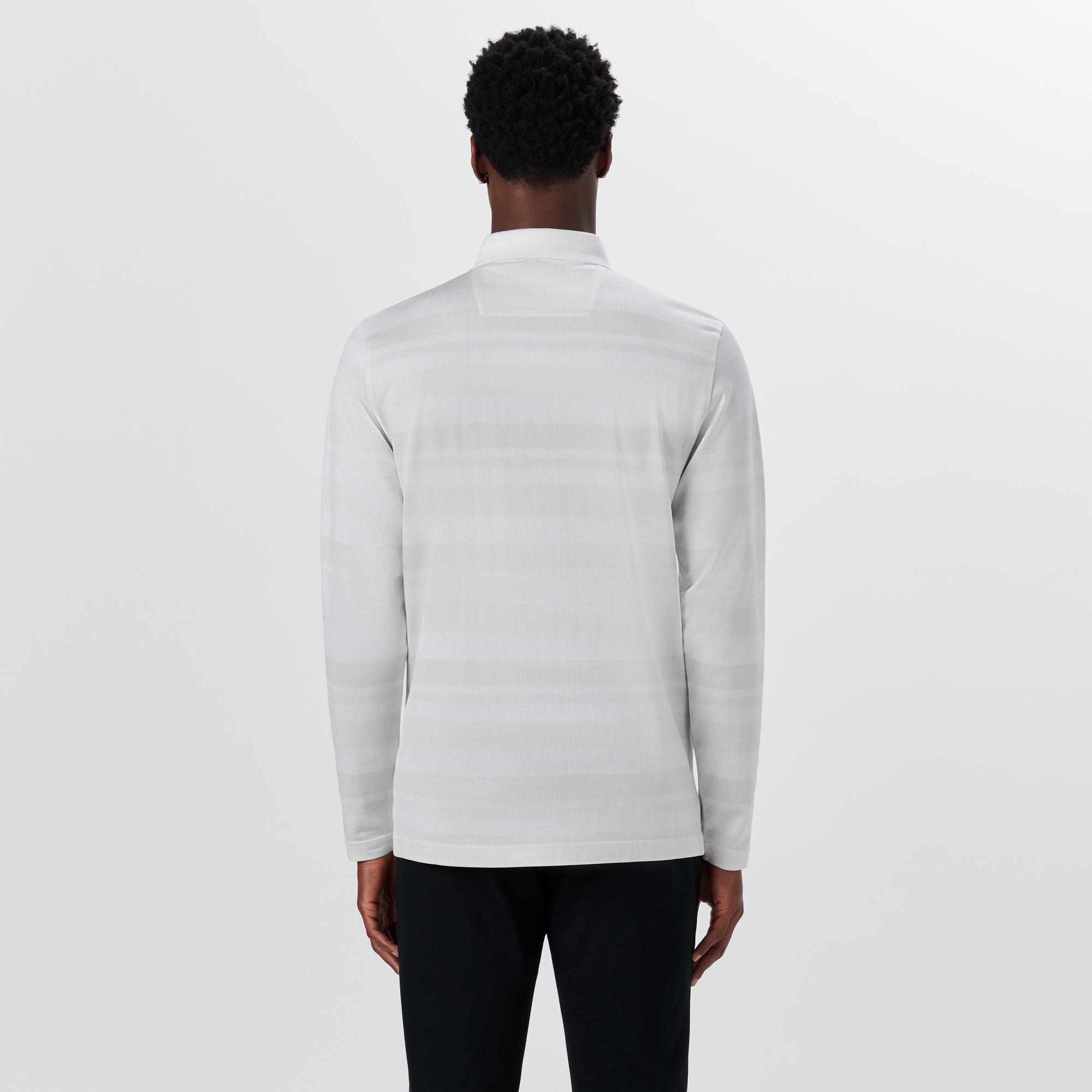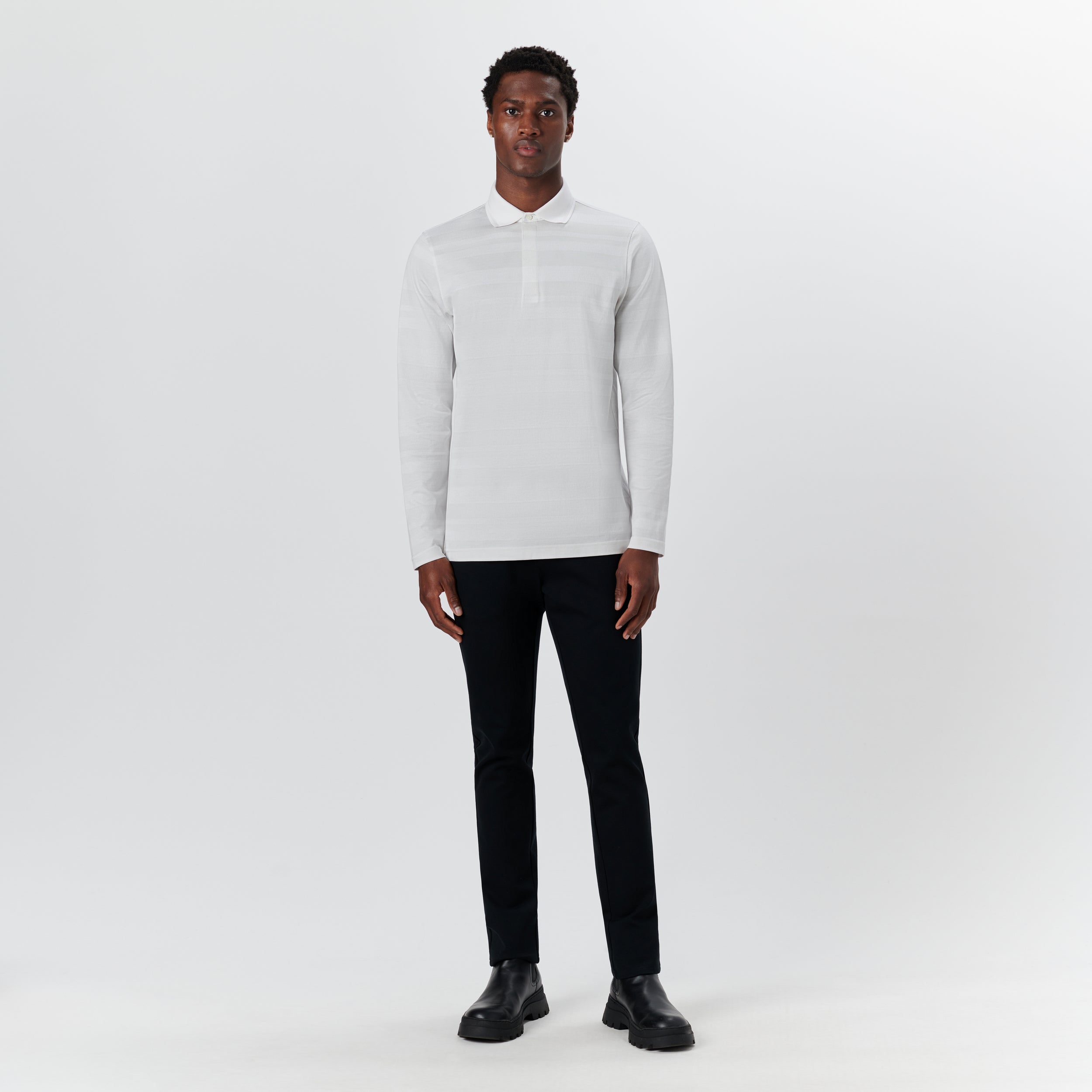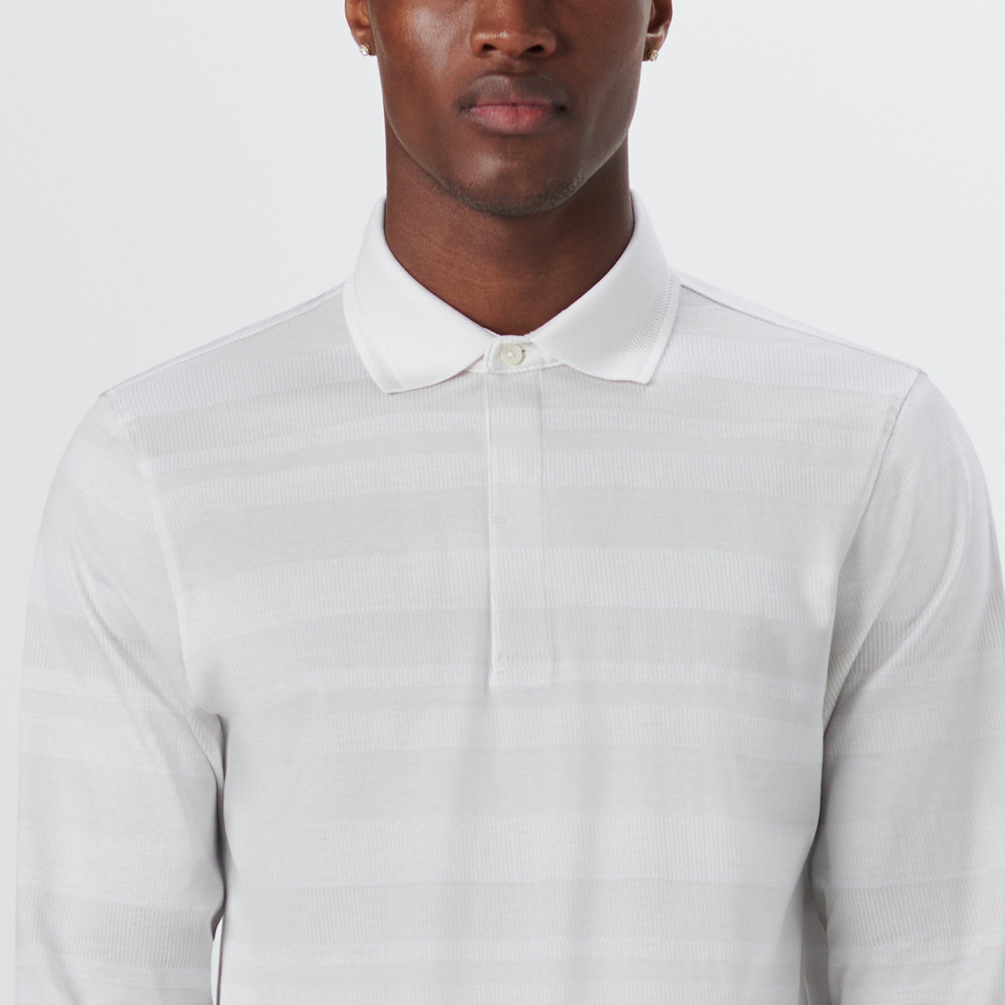 Long sleeve polo in striped 100% mercerized cotton with three-button covered placket and chevron stripe detailed solid polo collar.