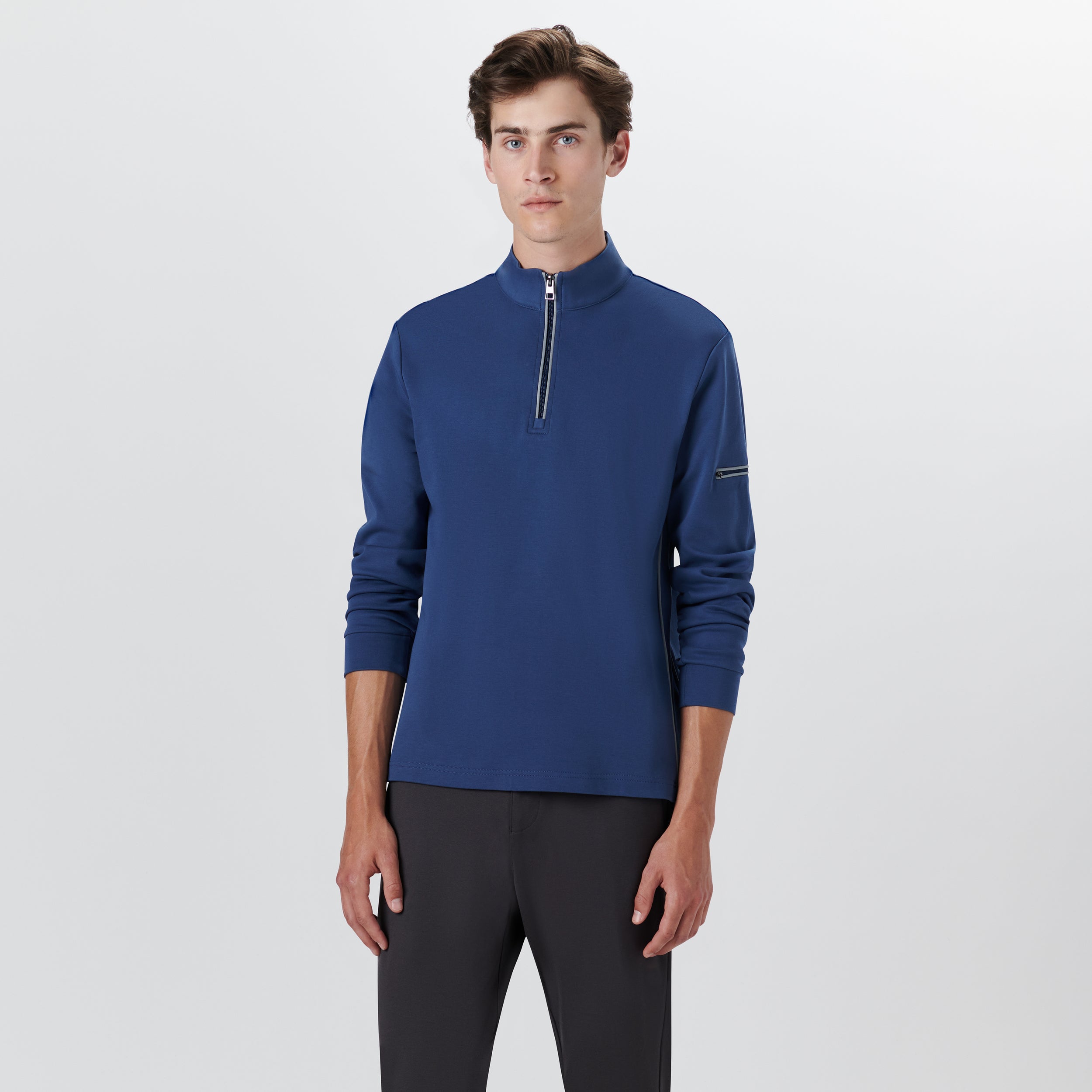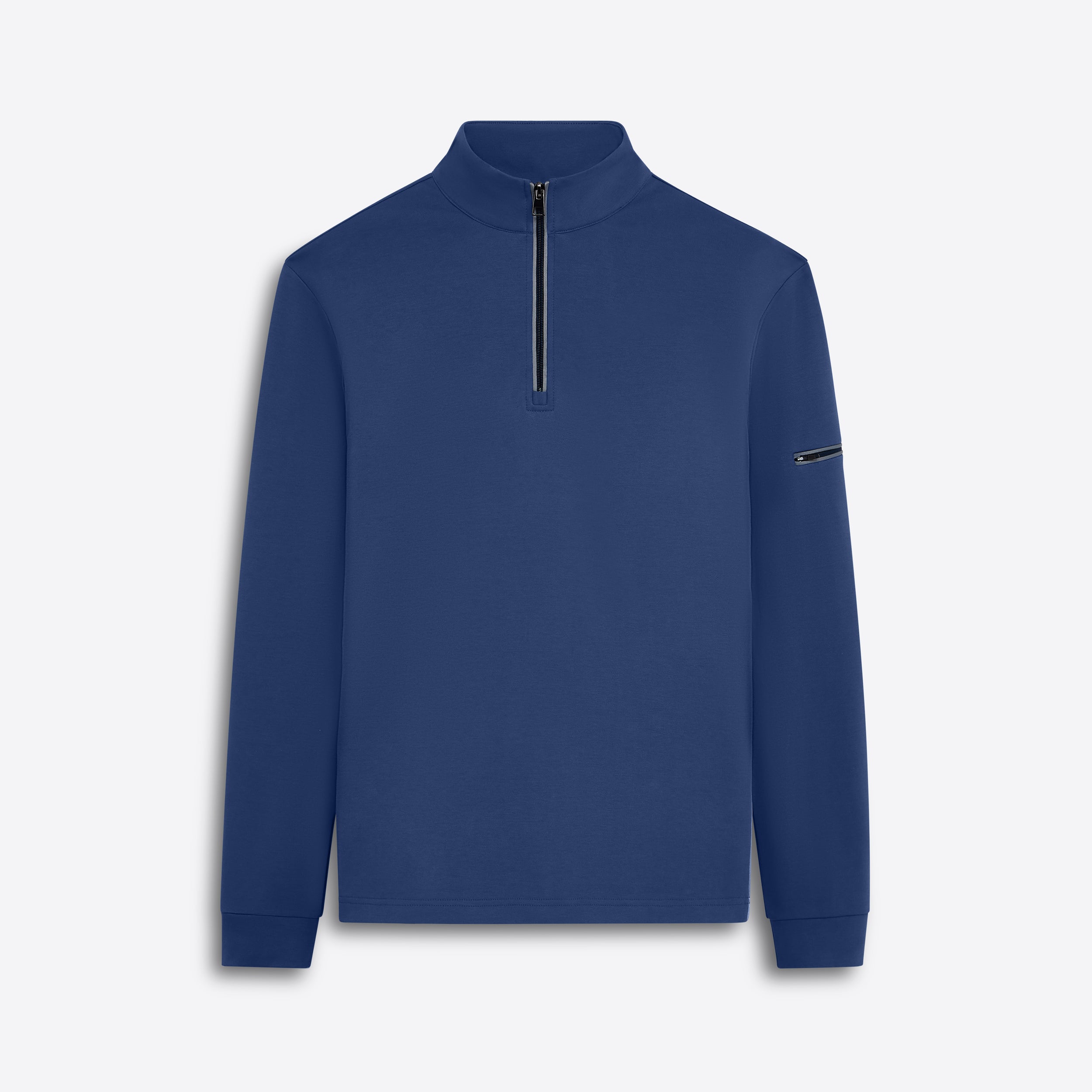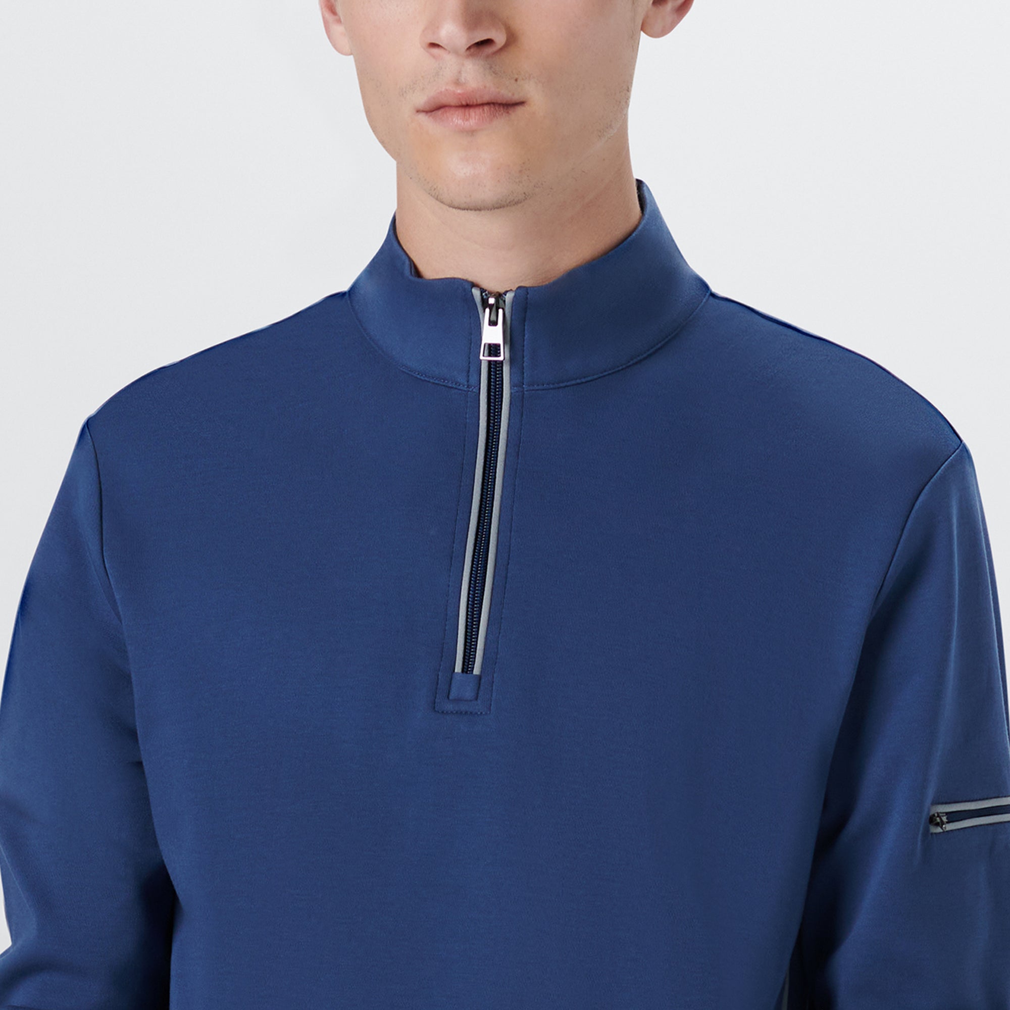 Long sleeve quarter zip pullover in 100% cotton with sleeve pocket and contrast piping detail.